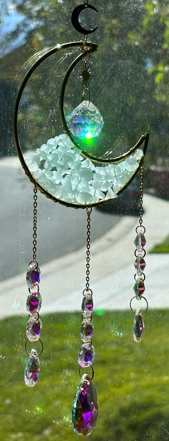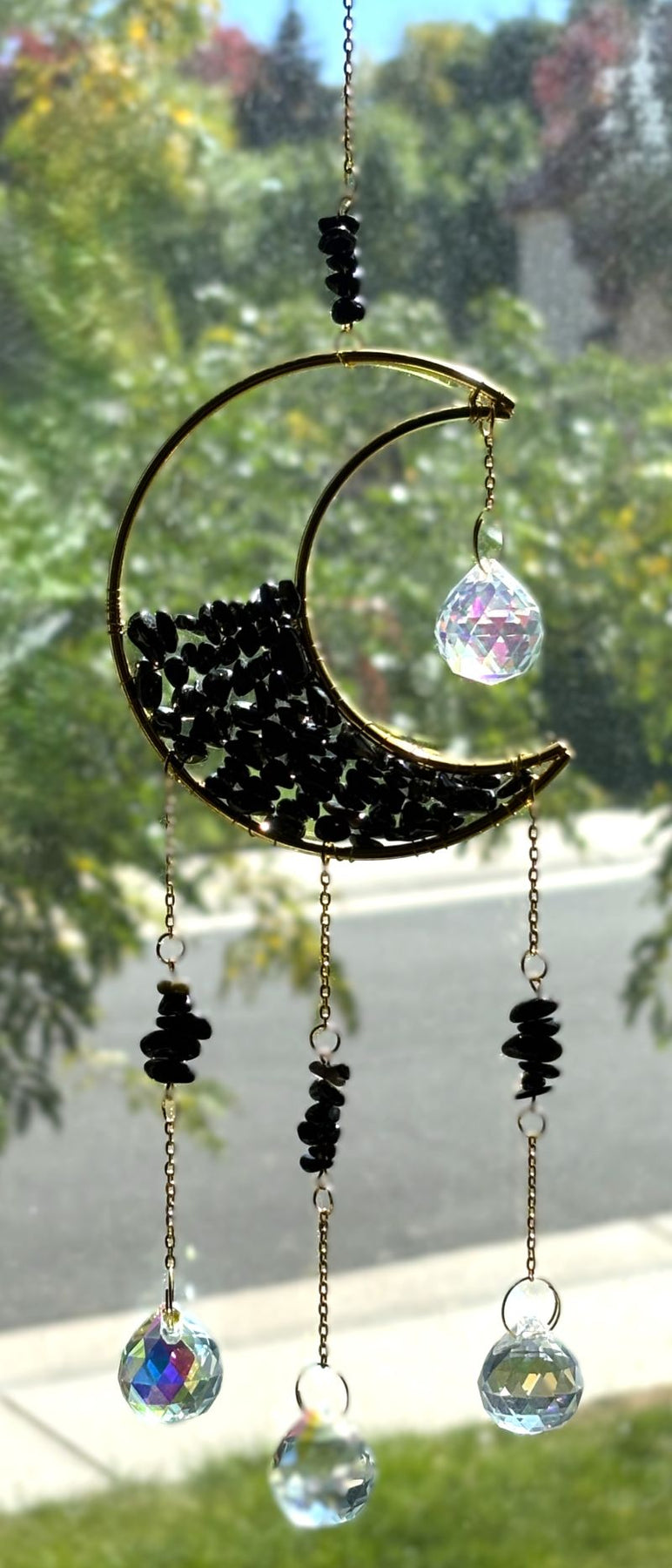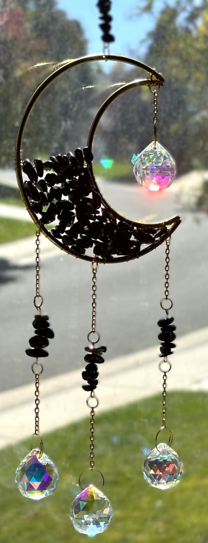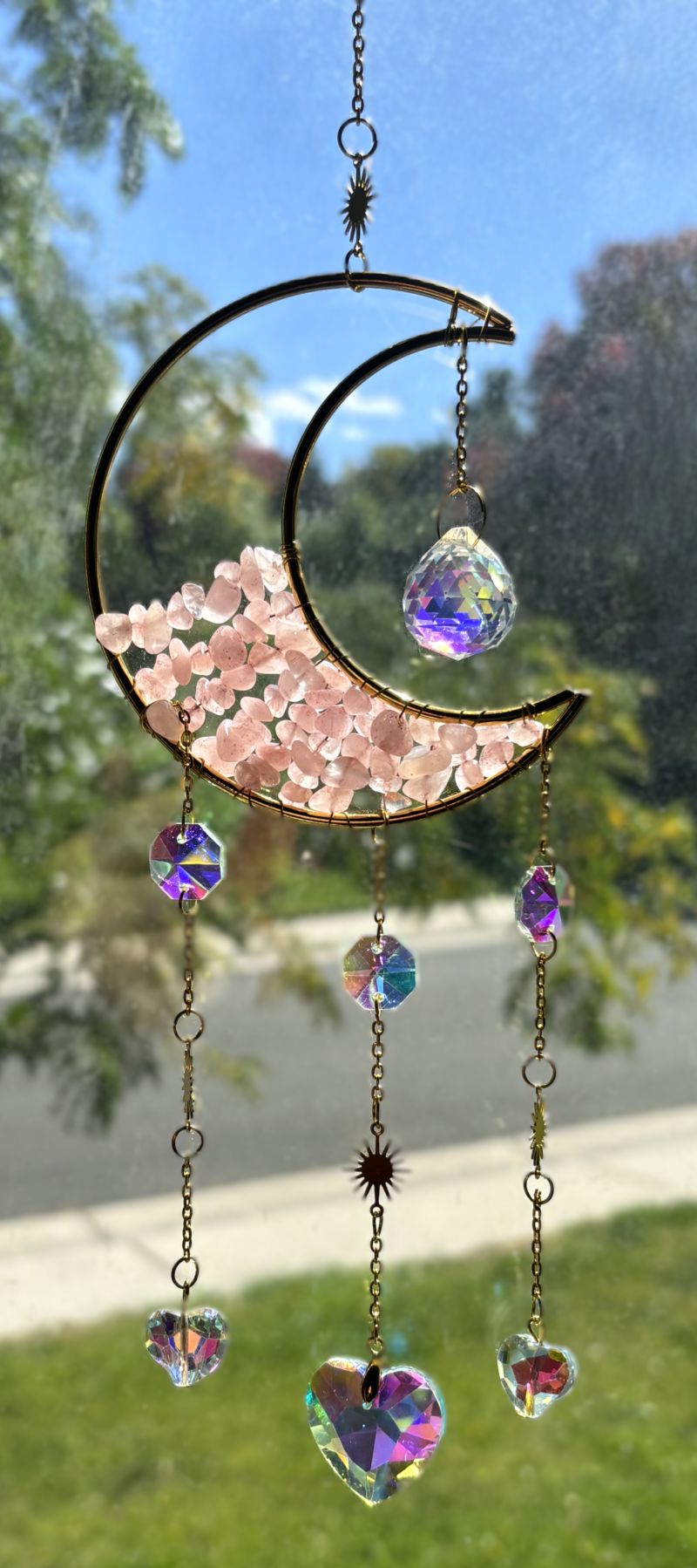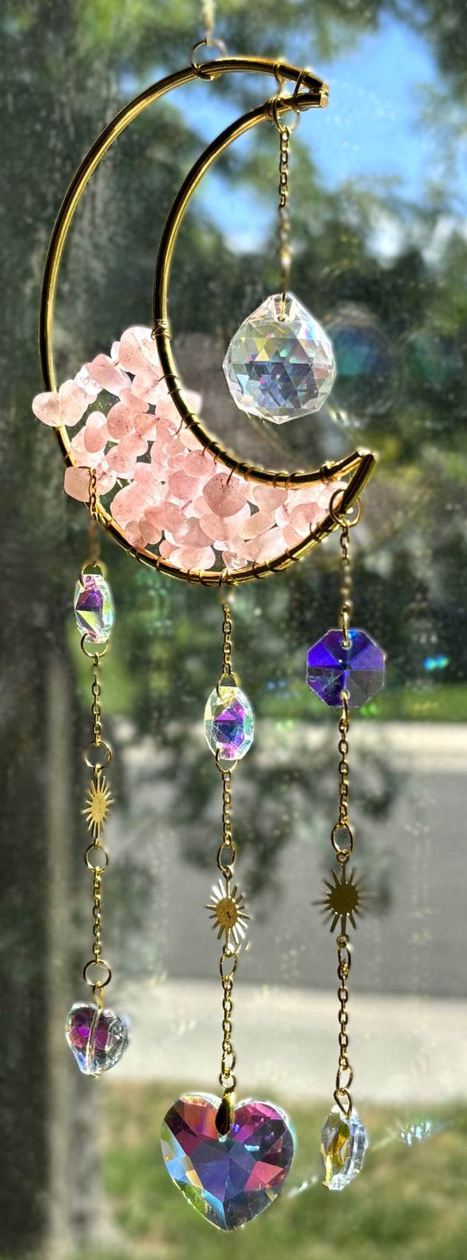 Elevate your space with these enchanting Crescent Moon Celestial Gemstone Sun Catchers, where celestial elegance meets natural beauty. Each piece showcases a lustrous gold crescent moon adorned with shimmering gemstone chips, suspended by a delicate chain embellished with celestial charms, gemstones, or both.