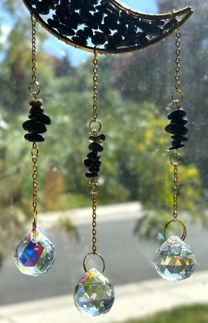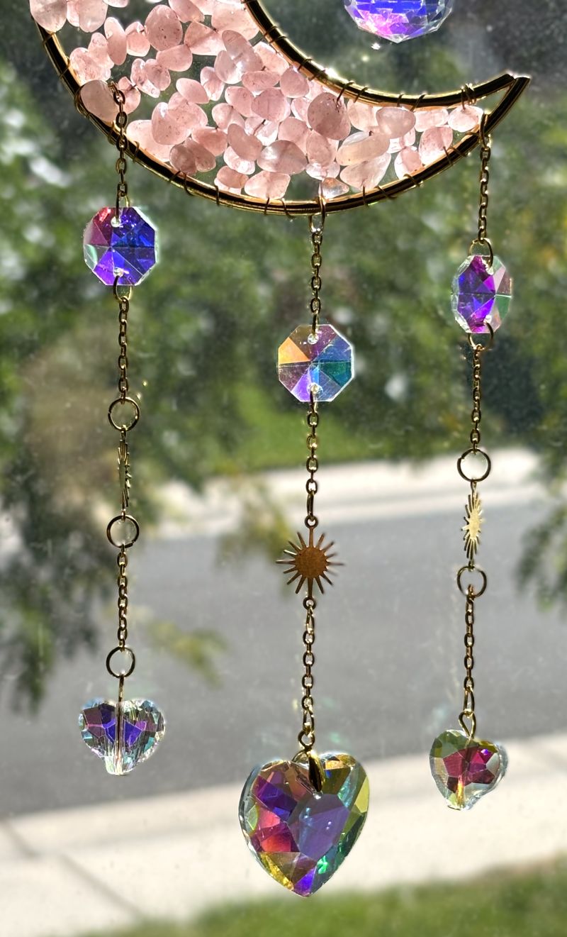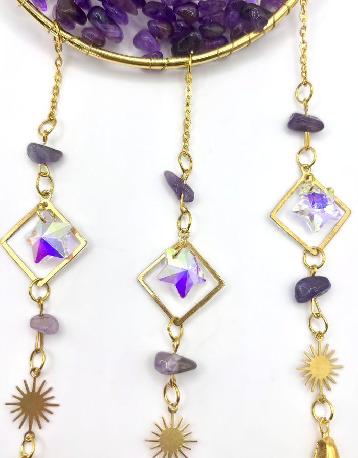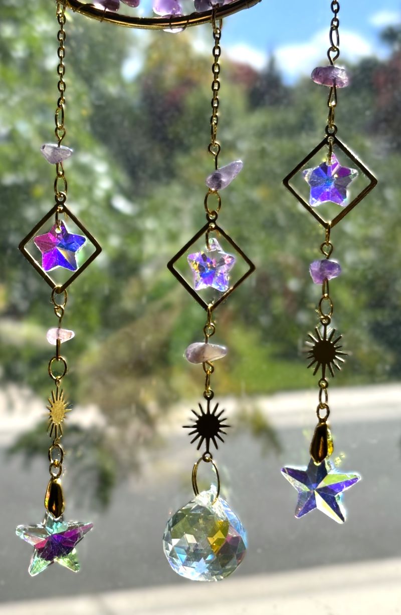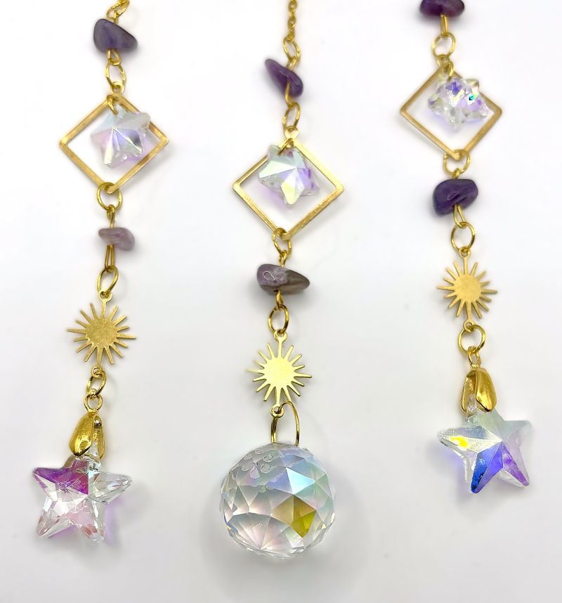 Three cascading strands feature an array of light-catching prisms in varied shapes—stars, globes, hearts, and more—that dance with iridescent brilliance when sunlight streams through. Choose from four captivating gemstone styles: serene Amethyst purple, romantic Rose Quartz pink, tranquil Aquamarine blue, or mysterious Obsidian black.