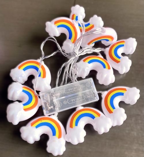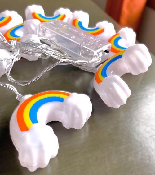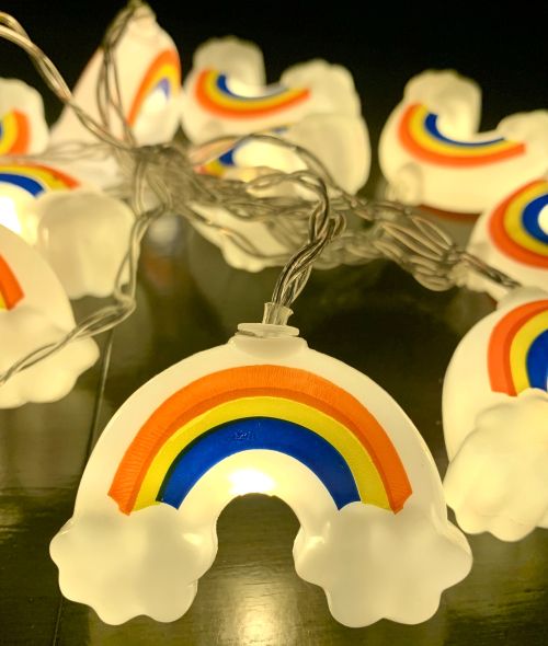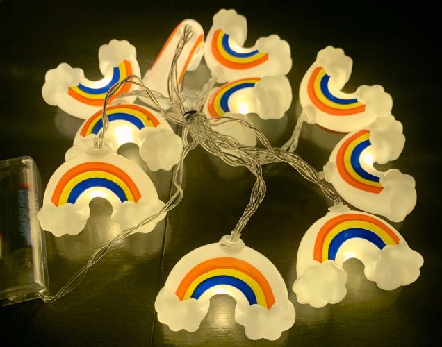 This string lighting features cute 3D rainbows w/ clouds. The strand of lights measures 5 feet and has 10 LED figural lights. These lights would look great in a nursery or child's room! Vibrant tri-color design on rainbow features reddish orange, yellow and blue. The rainbows are decorated on both sides. These lights give off a great light which is between a warm white and cool white - it's the perfect color! Battery pack with On/Off switch; requires 2 AA batteries. These whimsical lights can be used in so many different ways!