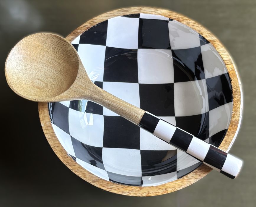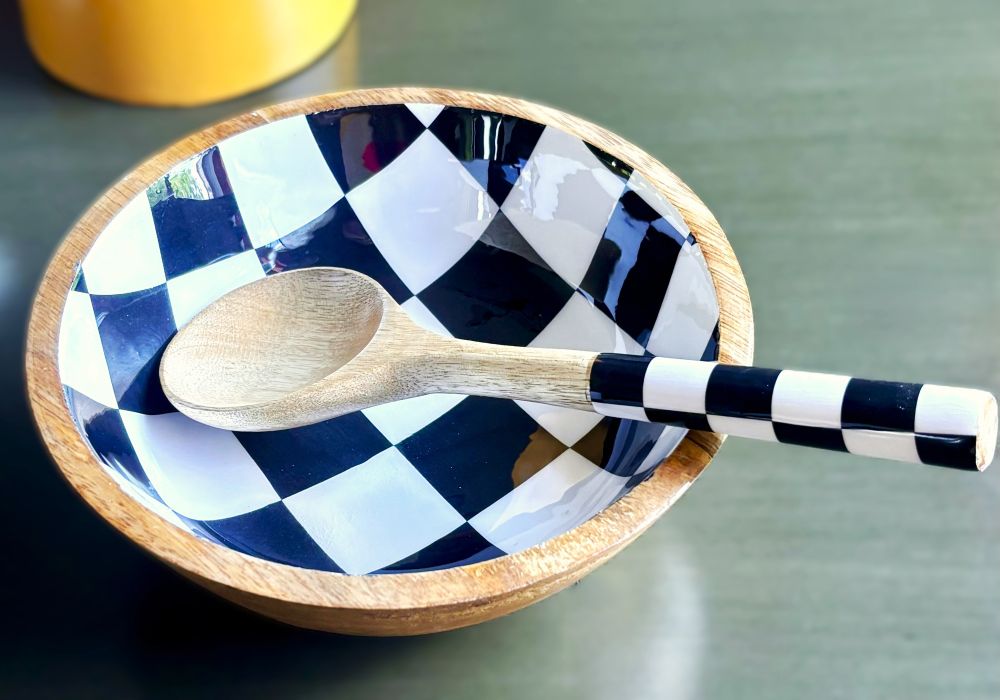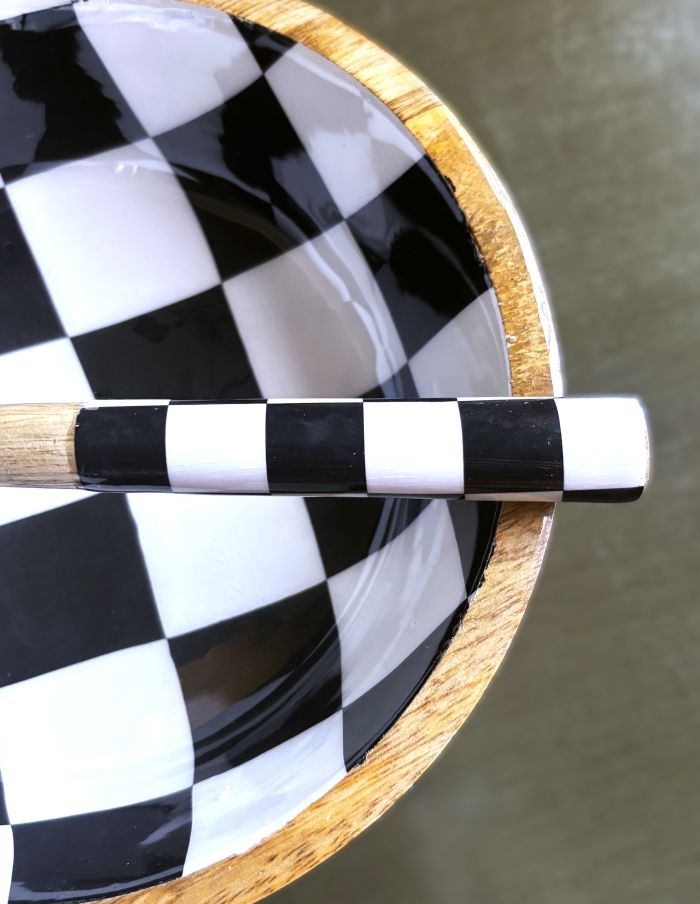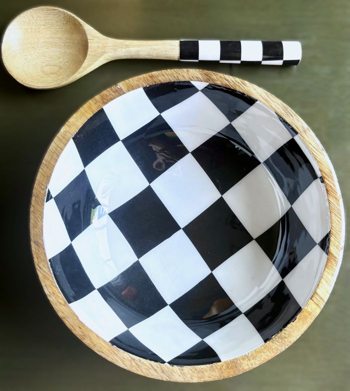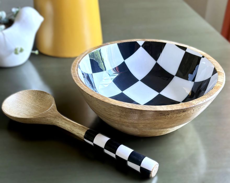 This serving bowl set showcases a modern black and white checkered pattern. The vivid colors against the dark background create a dramatic and eye-catching centerpiece for your dining experience. Made from premium, sturdy mango wood, each piece displays distinctive grain patterns and captivating textures, ensuring both beauty and durability.