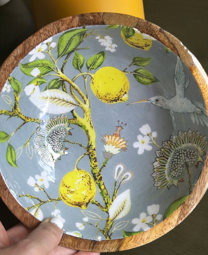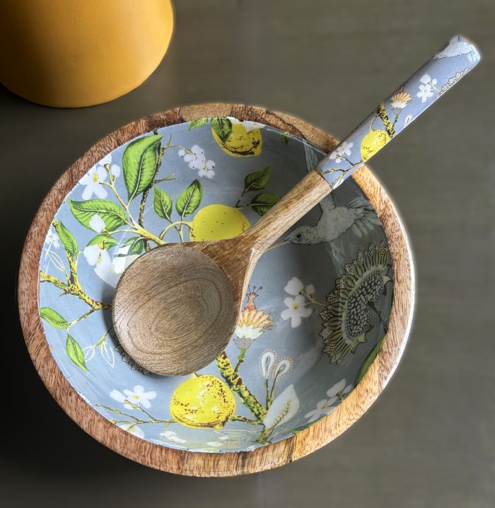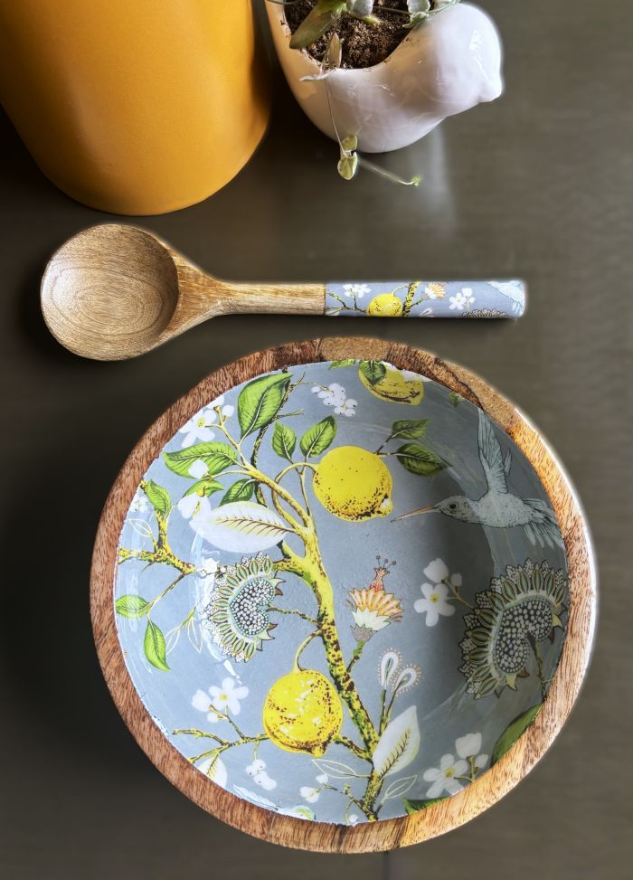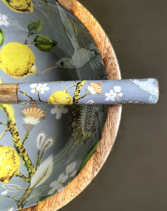 This serving bowl set features a vintage-style pattern featuring vibrant yellow lemons on branches, intricate botanical designs and a delicate hummingbird. The background color is a soothing gray. Crafted from high-quality, durable mango wood, this set features unique grain variations and interesting textures.