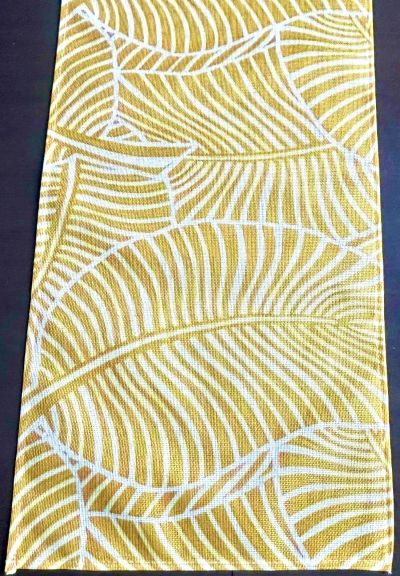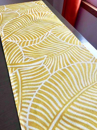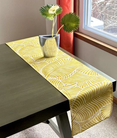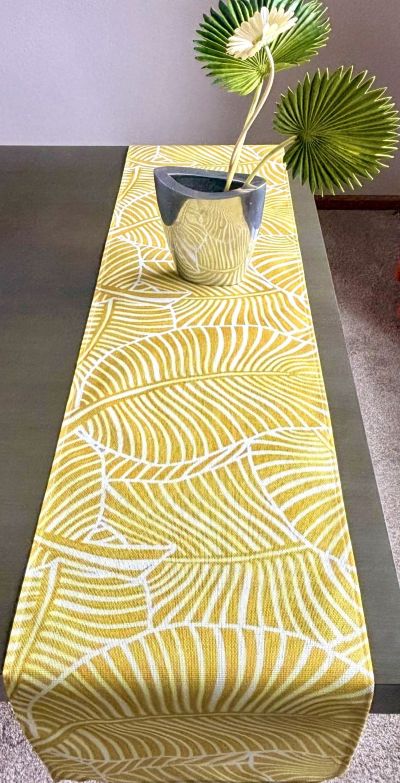 This stylish table runner will definitely add contemporary flair to your table. Measuring 72" long, this table runner is designed to elevate your table setting with a touch of modern elegance. Crafted with a unique abstract zebra pattern tropical leaf design, it brings a fresh and vibrant look to any occasion, whether it's a casual family dinner or a festive gathering with friends. This runner has a strong design in attractive gold and off-white.