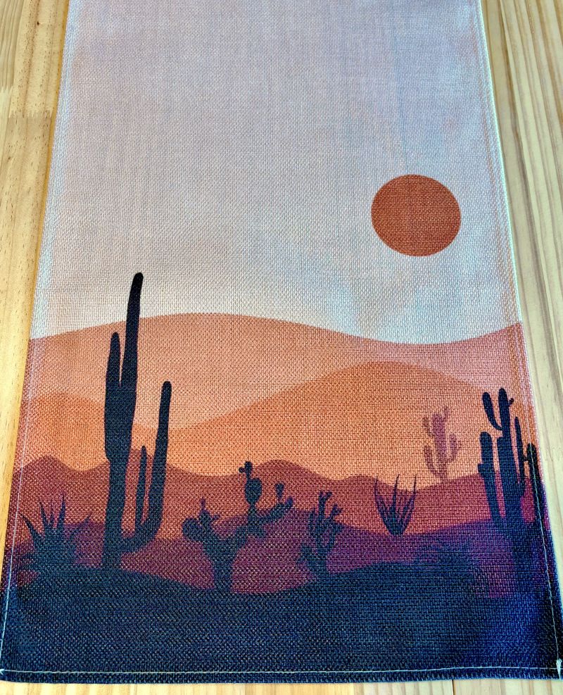 Elevate your table setting with this modern desert-inspired runner that captures the warmth and majesty of the Southwest. Rich orange and brown hues frame a captivating landscape of towering cacti, sweeping hills, and a glowing sun—perfect for adding character and conversation to your dining space.