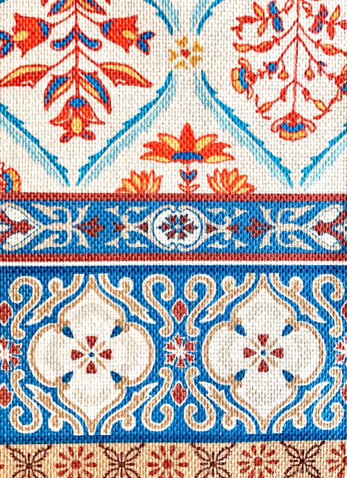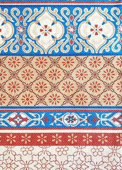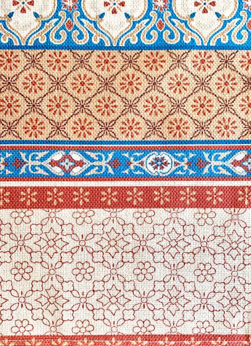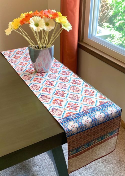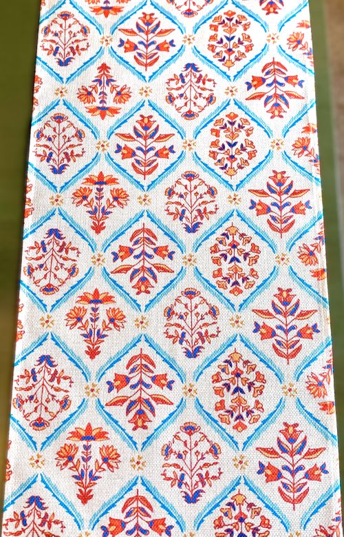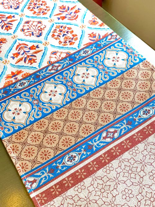 This table runner has a charming rustic floral design that is complimented beautifully with the linear patterns. The earthy color scheme of burnt orange, off-white, blue and brown gives this runner a calming nature-based appeal. This design would look wonderful with Rustic, Farmhouse, and Bohemian décor schemes!