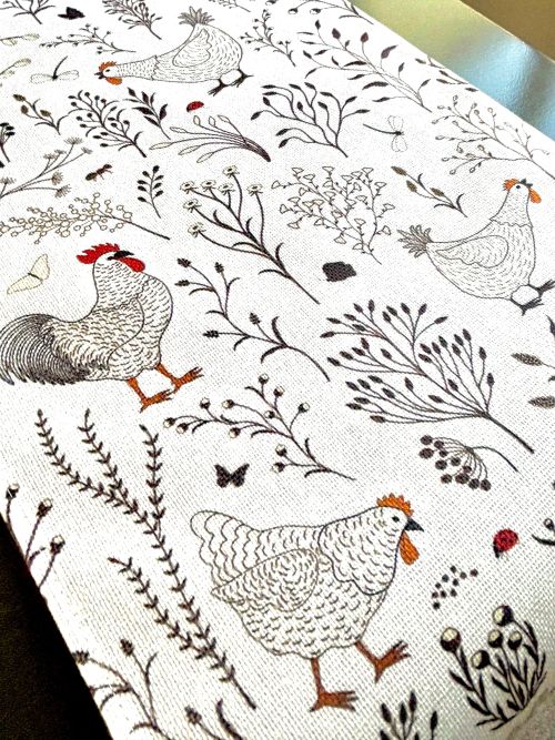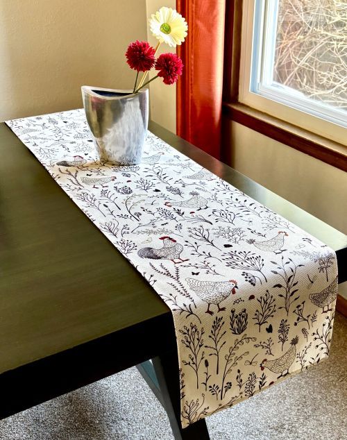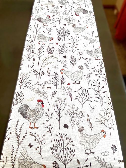 Introducing our charming Farmhouse Chicken table runner, the perfect addition to your kitchen decor! Measuring a generous 72" long, this delightful table runner is designed to bring a touch of rustic farmhouse elegance to your dining experience. The simple color scheme with great contrast and intricate details make it a versatile addition to your kitchen décor. The runner is predominately beige with dark taupe illustrations. It has splashes of cream, red and orange to add contrast and make the designs 'pop'.