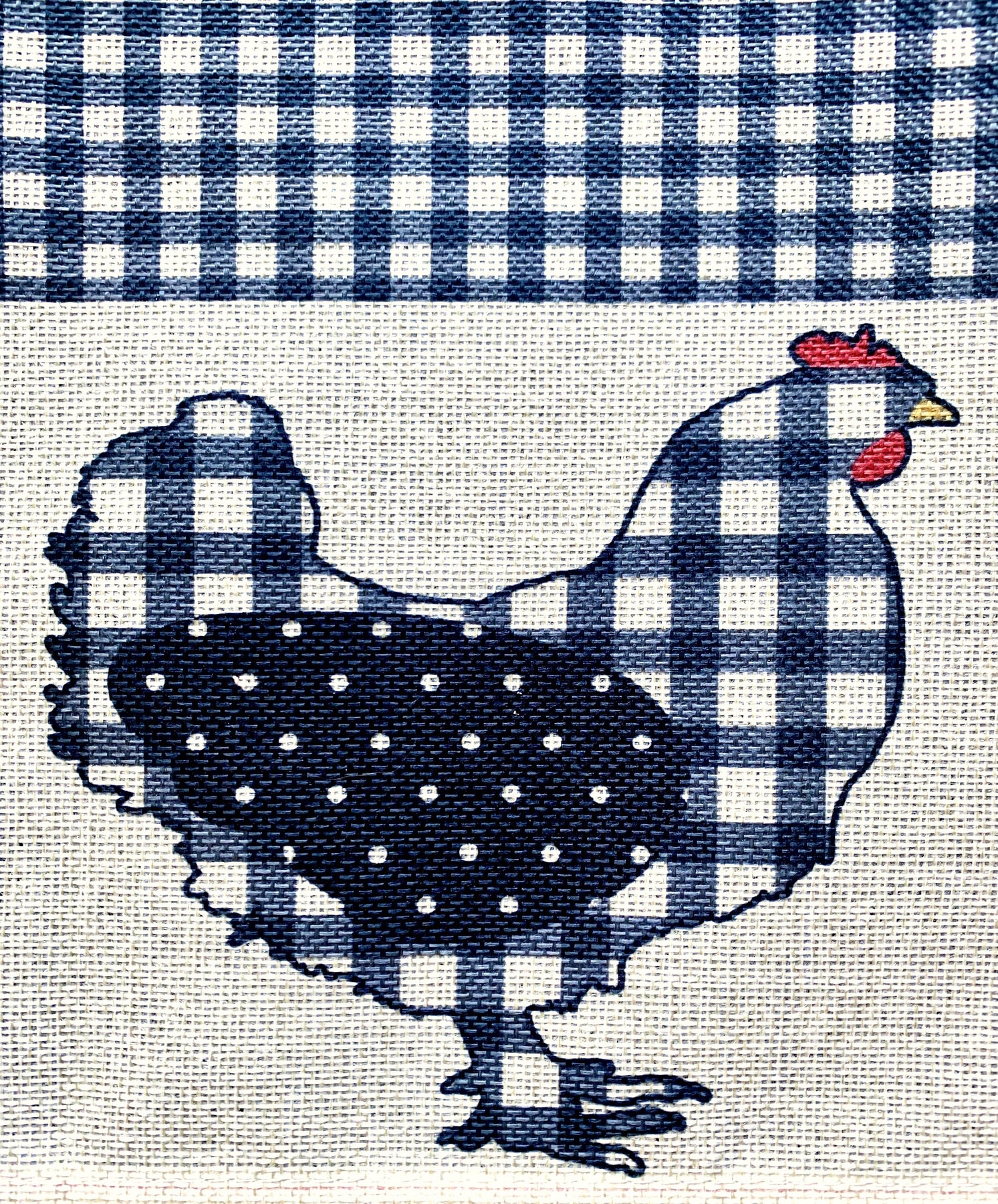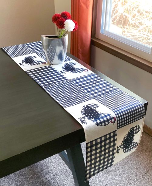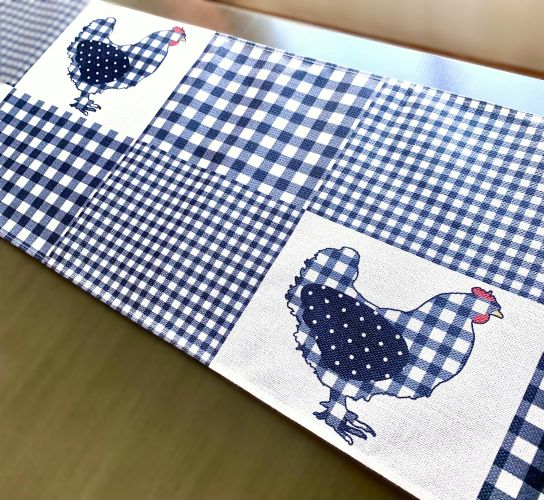 The design of this farmhouse-themed runner is so charming! It features squares of two different plaid designs as well as hens with plaid and polka dot detailing. It has a unique patchwork look, with the three differently decorated squares blending seamlessly with each other. The color scheme is black and natural linen with a bit of contrasting red on the hen.