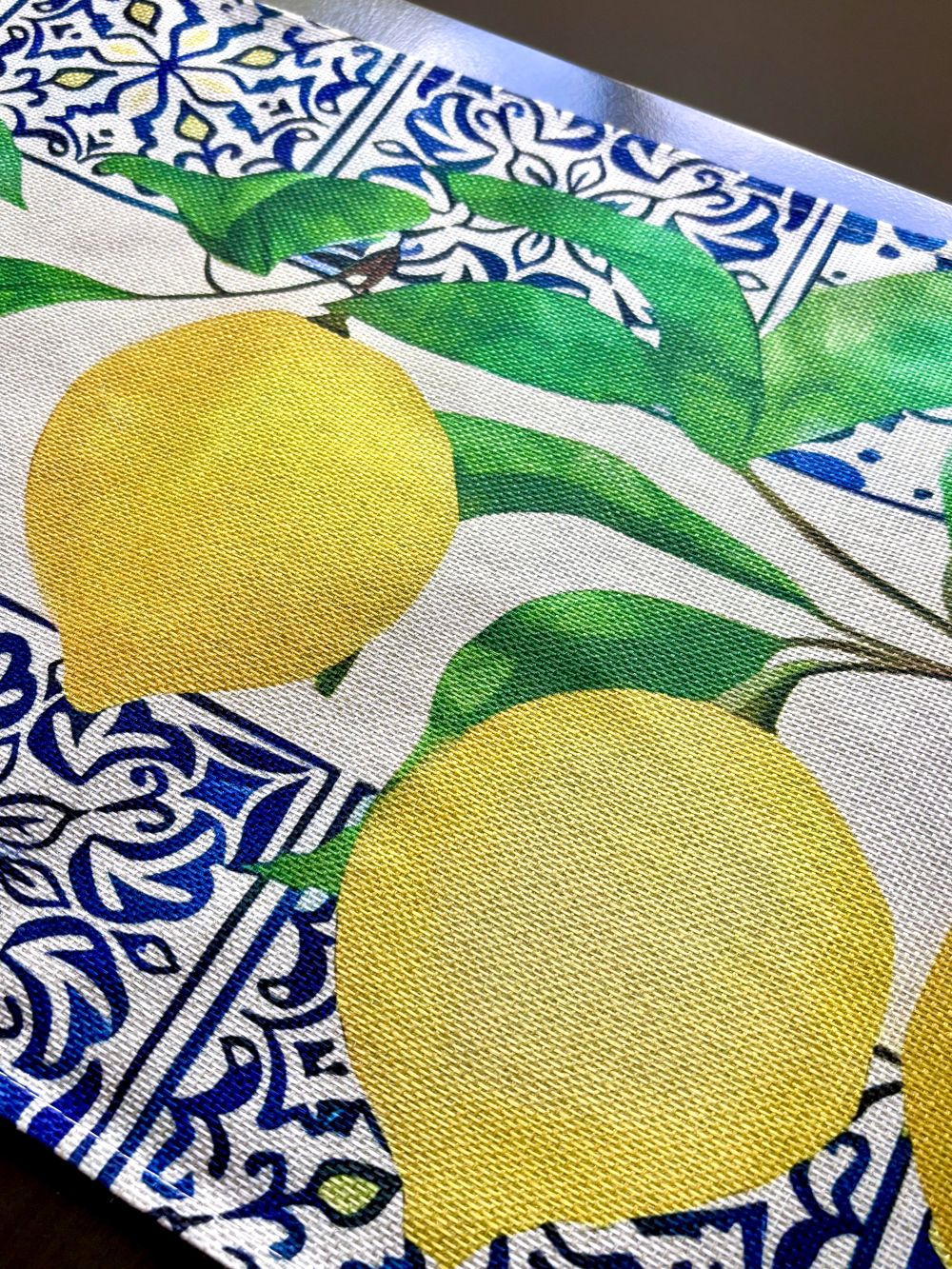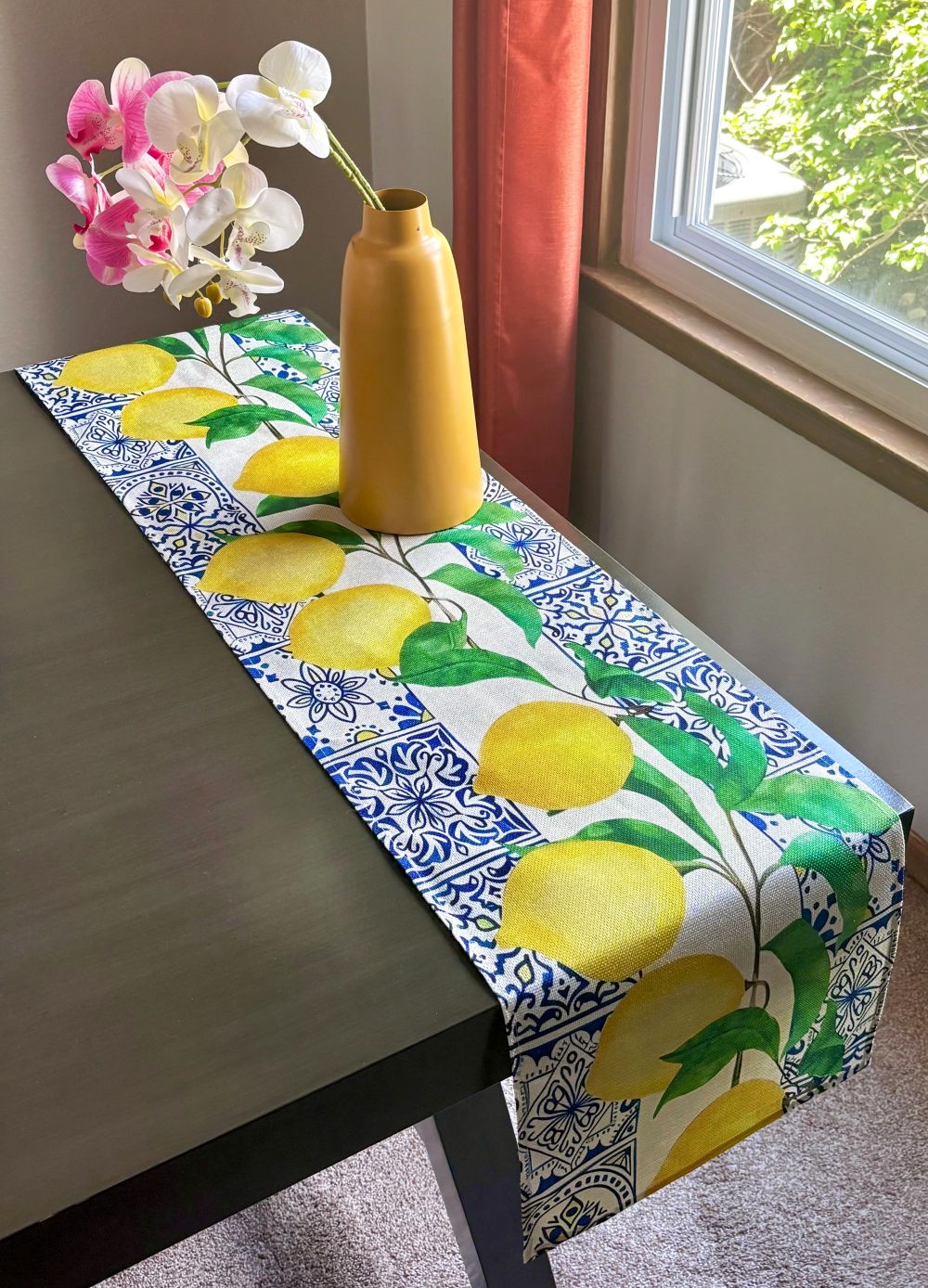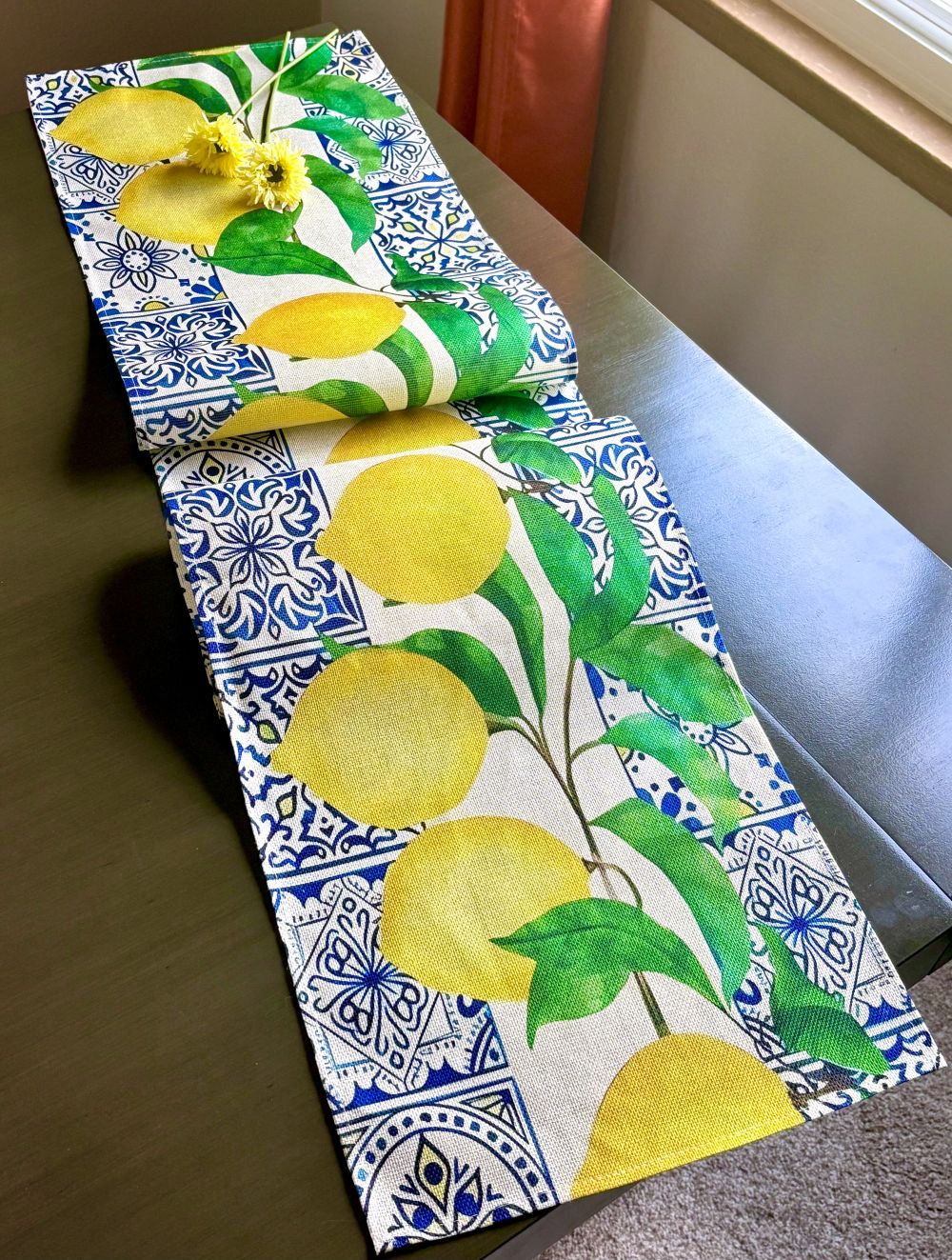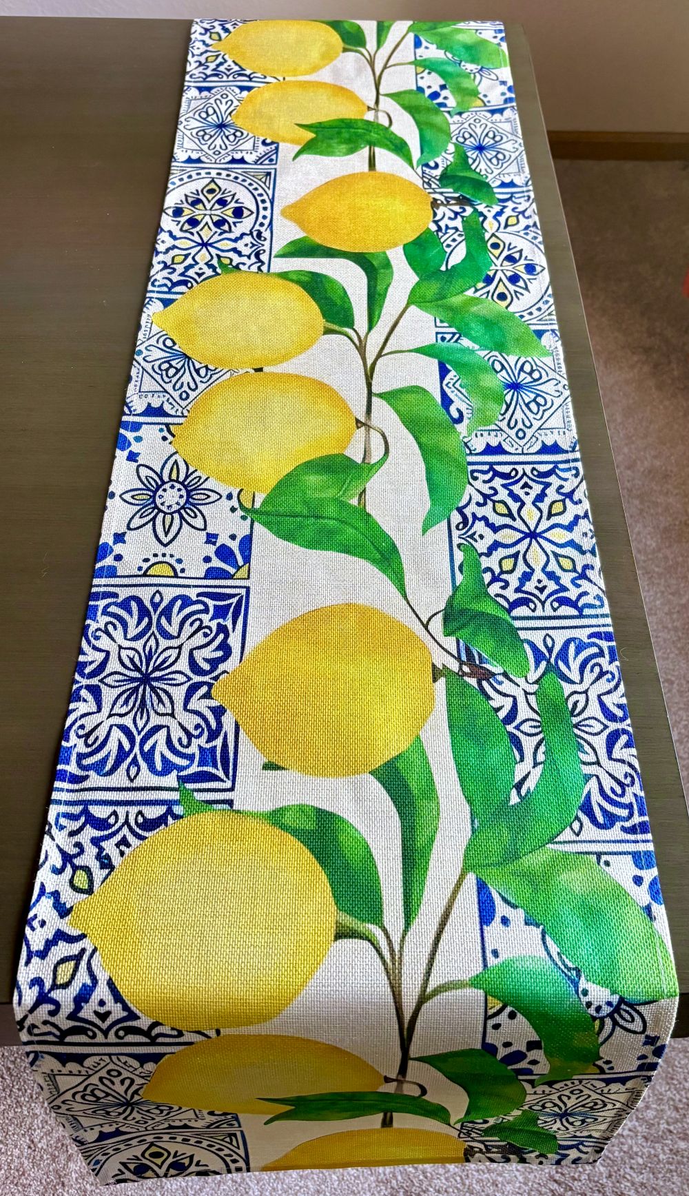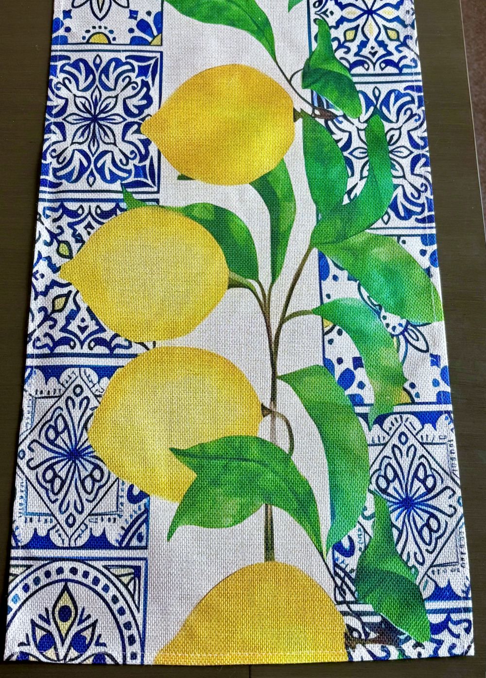 Add this delightful and vibrant table runner featuring a lemon motif with classic Mediterranean flair to your table for a decor upgrade! Elegant, lush and colorful; this design features large, ripe lemons hanging from green leafy branches. The border features blue floral tiles with a Mediterranean flair.