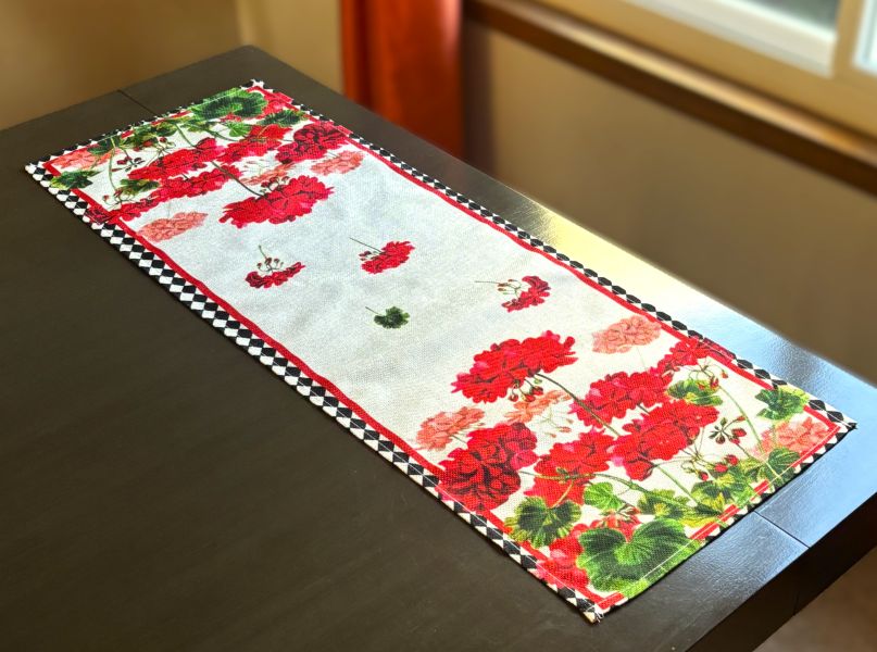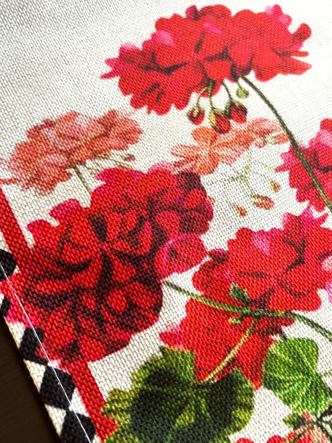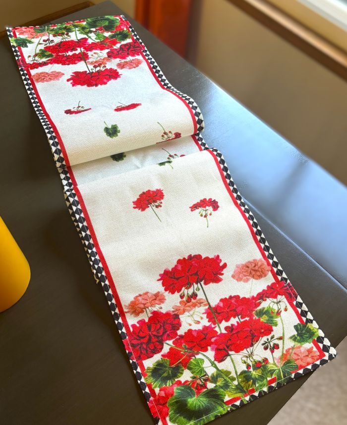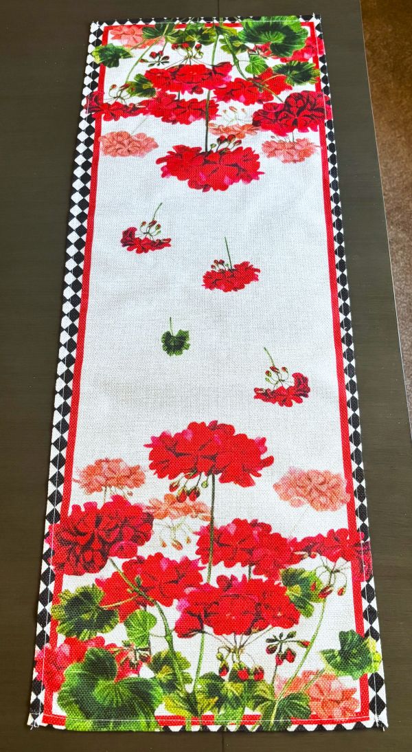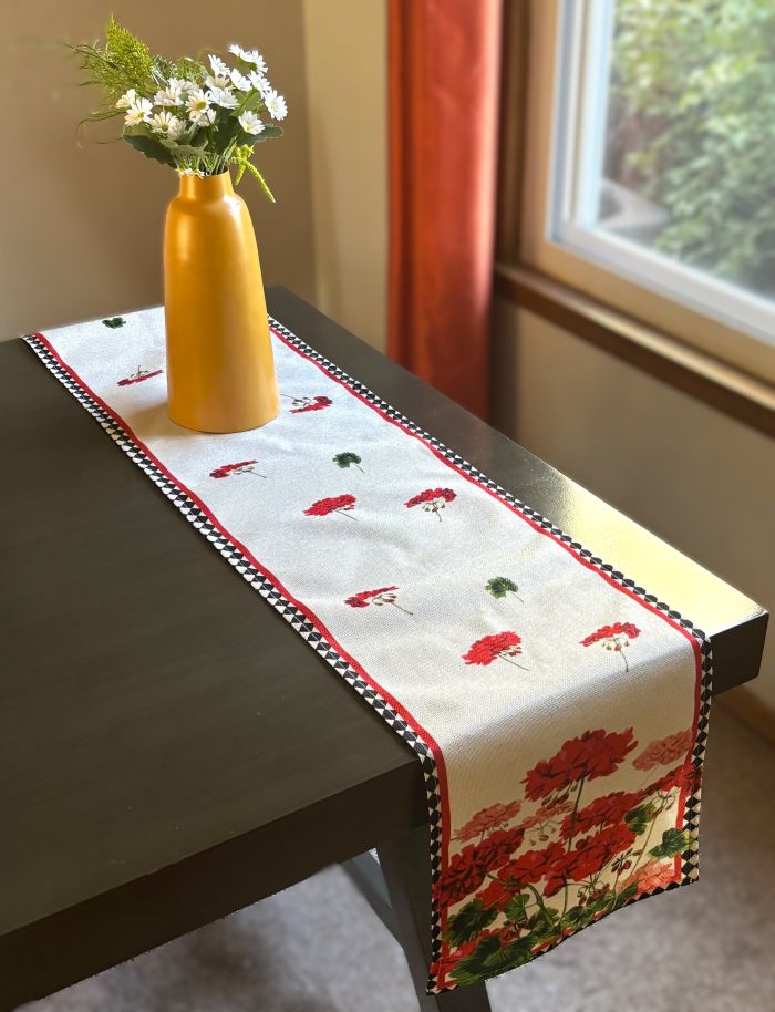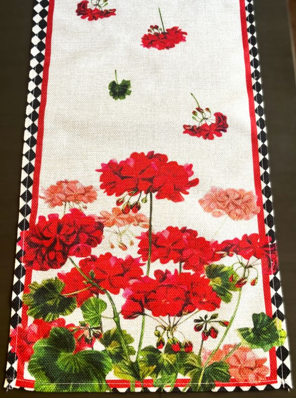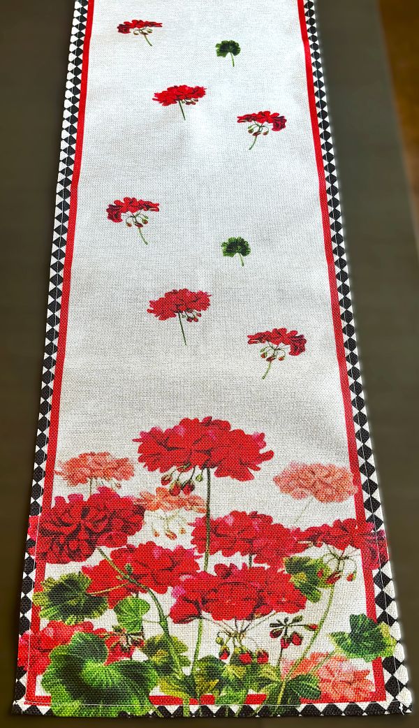 Enhance your dining experience with this eye-catching table runner, showcasing beautiful geraniums in red shades ranging from deep red to vibrant red to dusty rose, placed on a natural linen background. The black diamond border adds a touch of sophistication and contrast. The design is ideal for summer and looks stunning from any perspective.