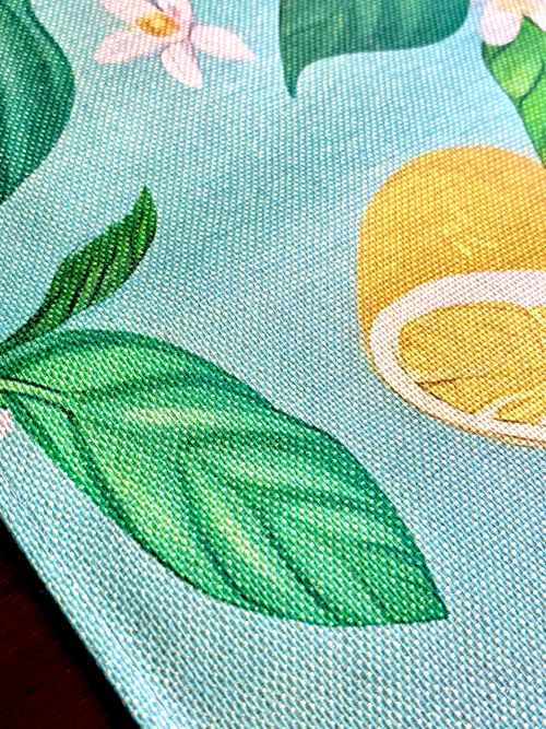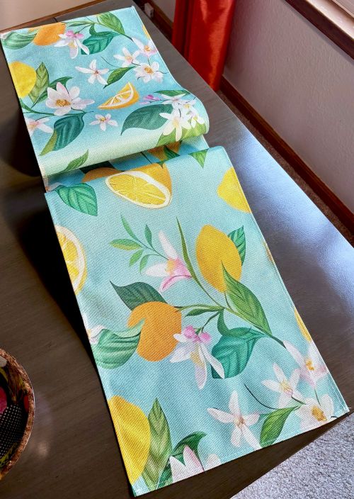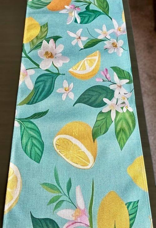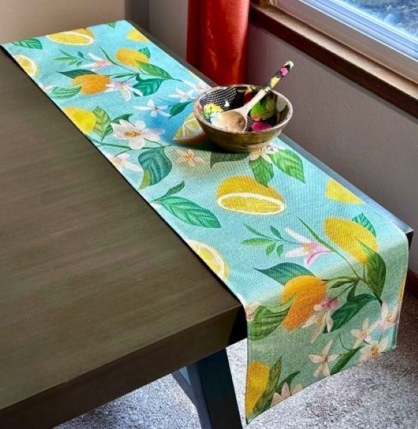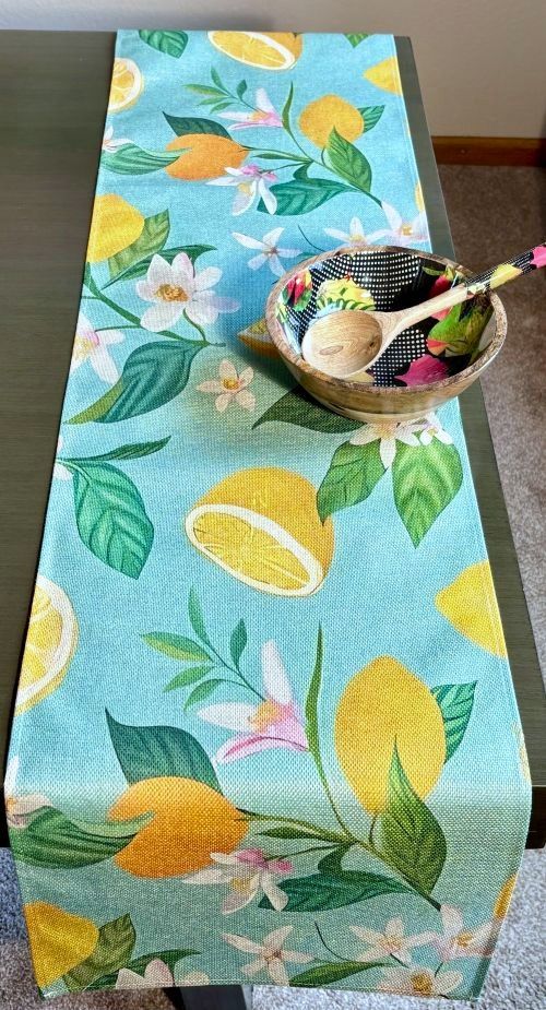 Add a touch of nature to your indoor decor with this charming table runner adorned with a playful lemon floral pattern, perfect for a refreshing summer ambiance.