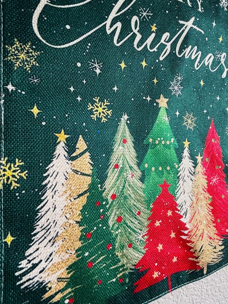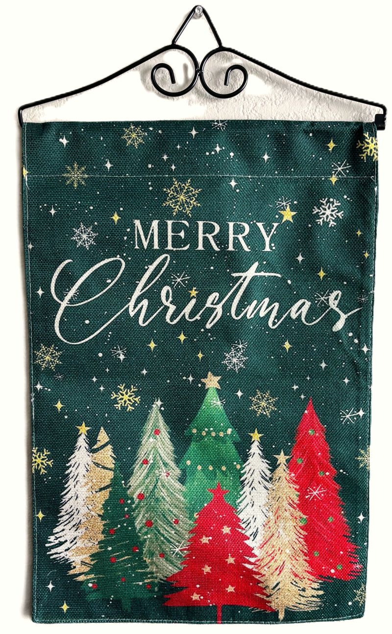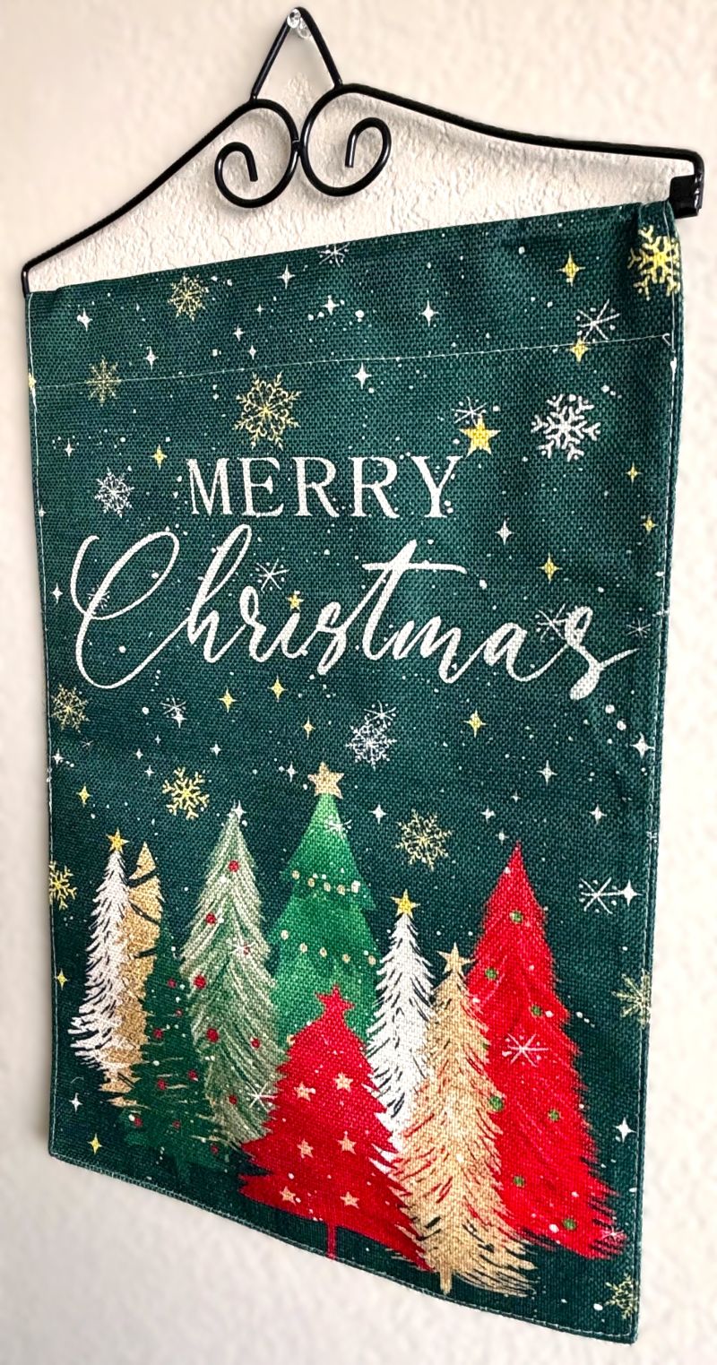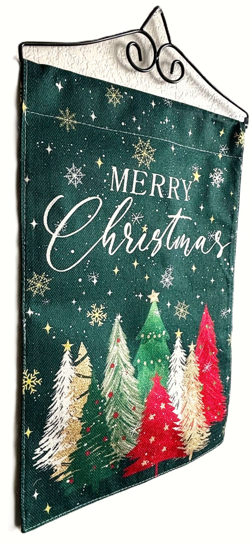 This Christmas yard flag has a beautiful design of decorated pine trees in multiple colors against a magical background of stars and snowflakes. The pine trees are nicely designed in solid and multi-hued colors, decorated with round and star-shaped ornaments. Most of the trees are topped with a star. This is a fabulous design that wishes "Merry Christmas" in a festive and elegant way. This flag would also look wonderful hanging on a wall in your home or on the front door.