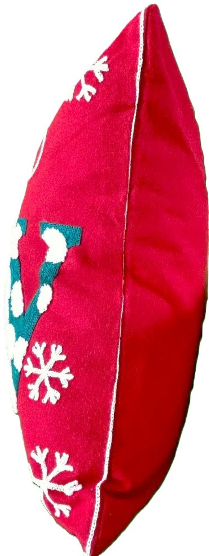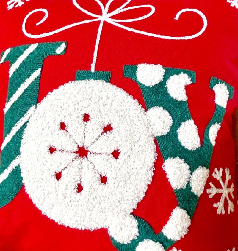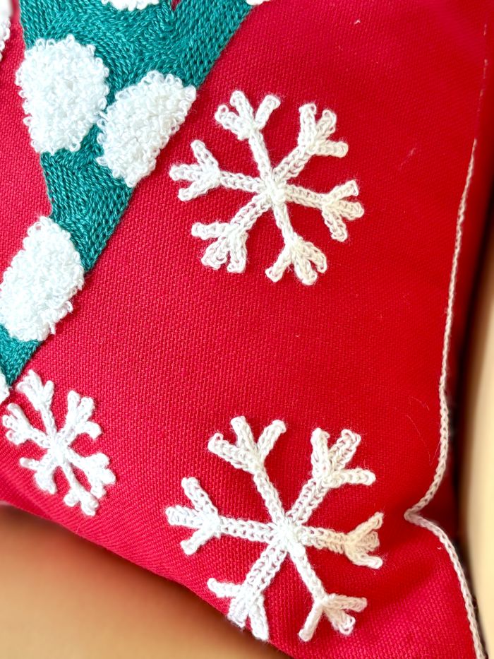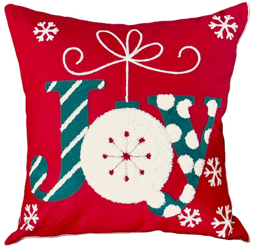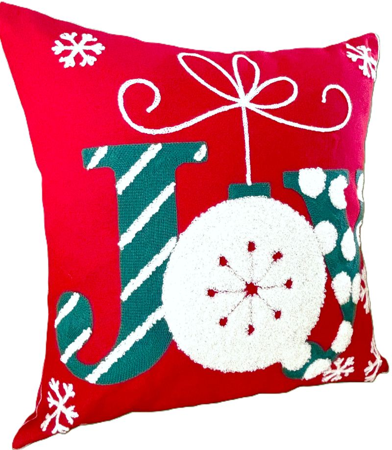Bring the festive spirit into your home this holiday season with our charming embroidered and tufted "Joy" Christmas throw pillow cover. The 'O' in Joy is designed as an ornament with its hanging string tied as a pretty bow. It is designed with soft tufted material. It also has delicate white embroidered snowflakes. Diagonal striped and polka dots add a touch of whimsy to the lettering. No detail has been overlooked in the design of the pillow cover!