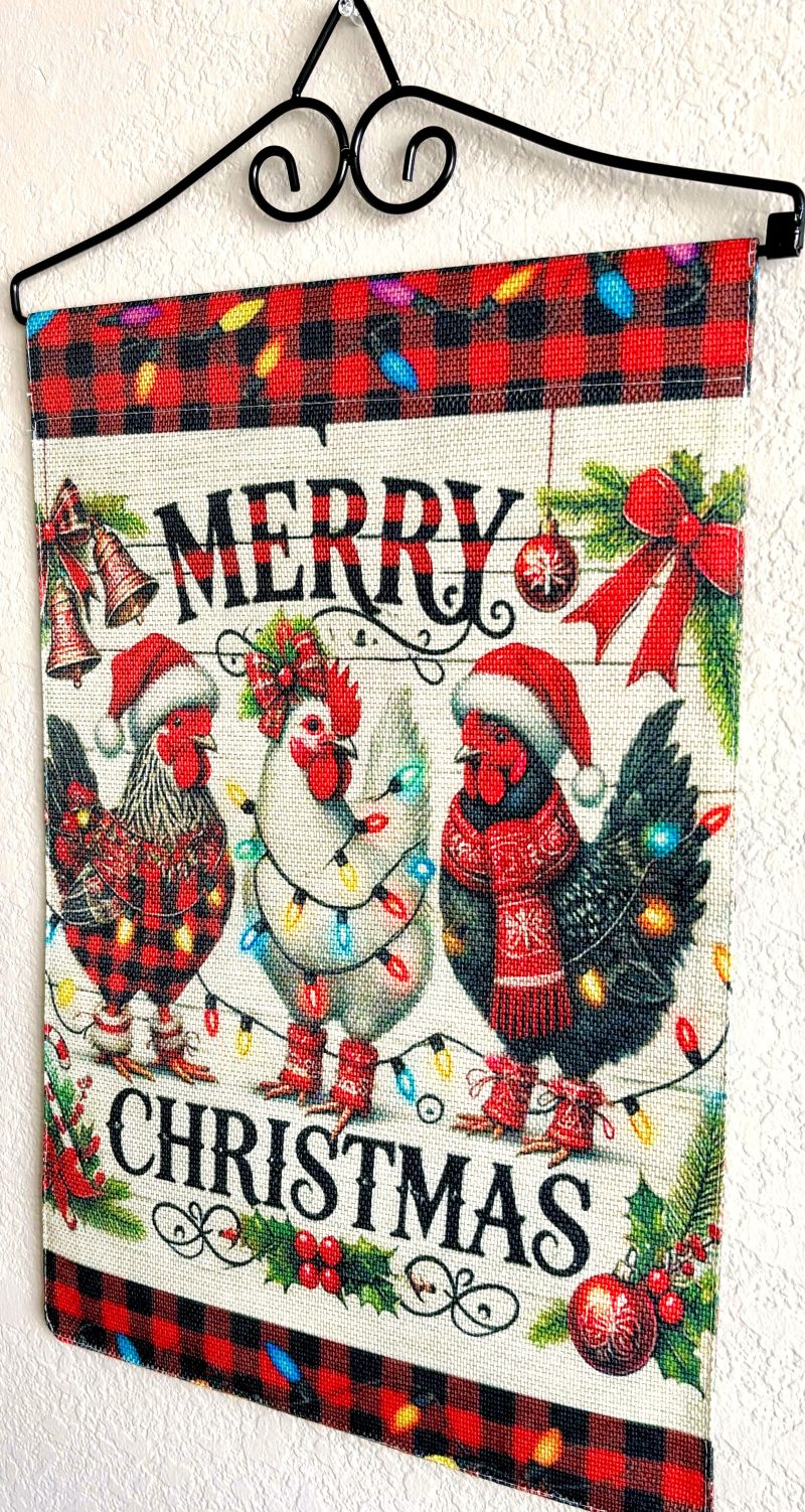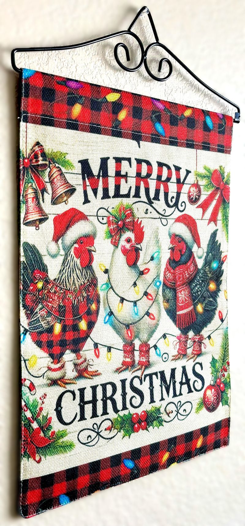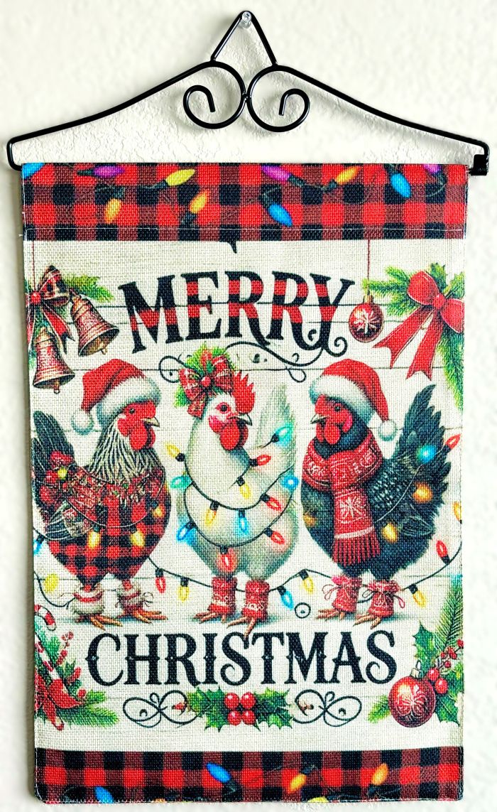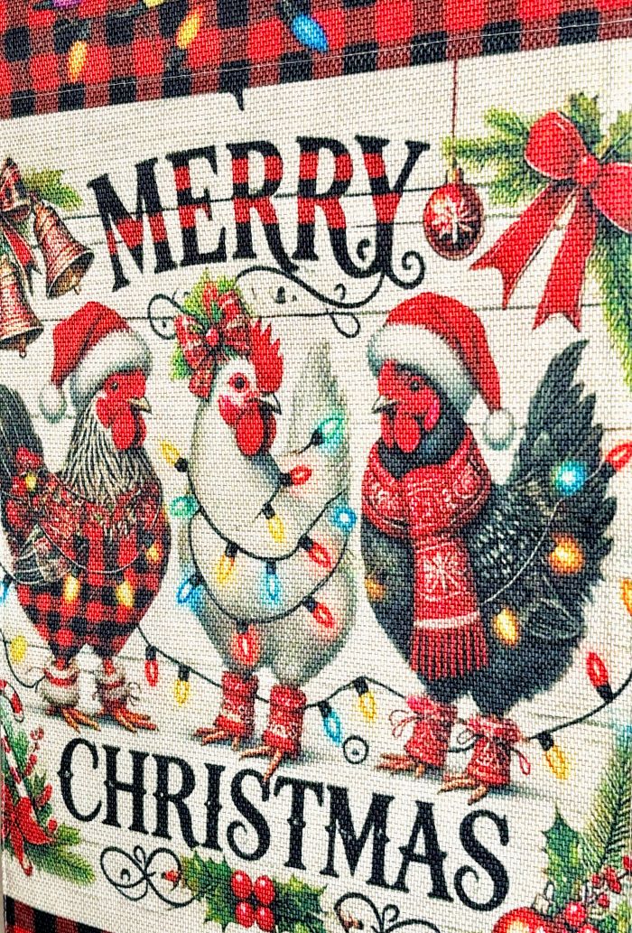 These chickens are all decked out in their Christmas finery to wish a "Merry Christmas" to all of your friends and family! This darling Christmas yard flag (or wall hanging!) is chock-full of color and festive details. Red and black buffalo check border the top and bottom of this yard flag.