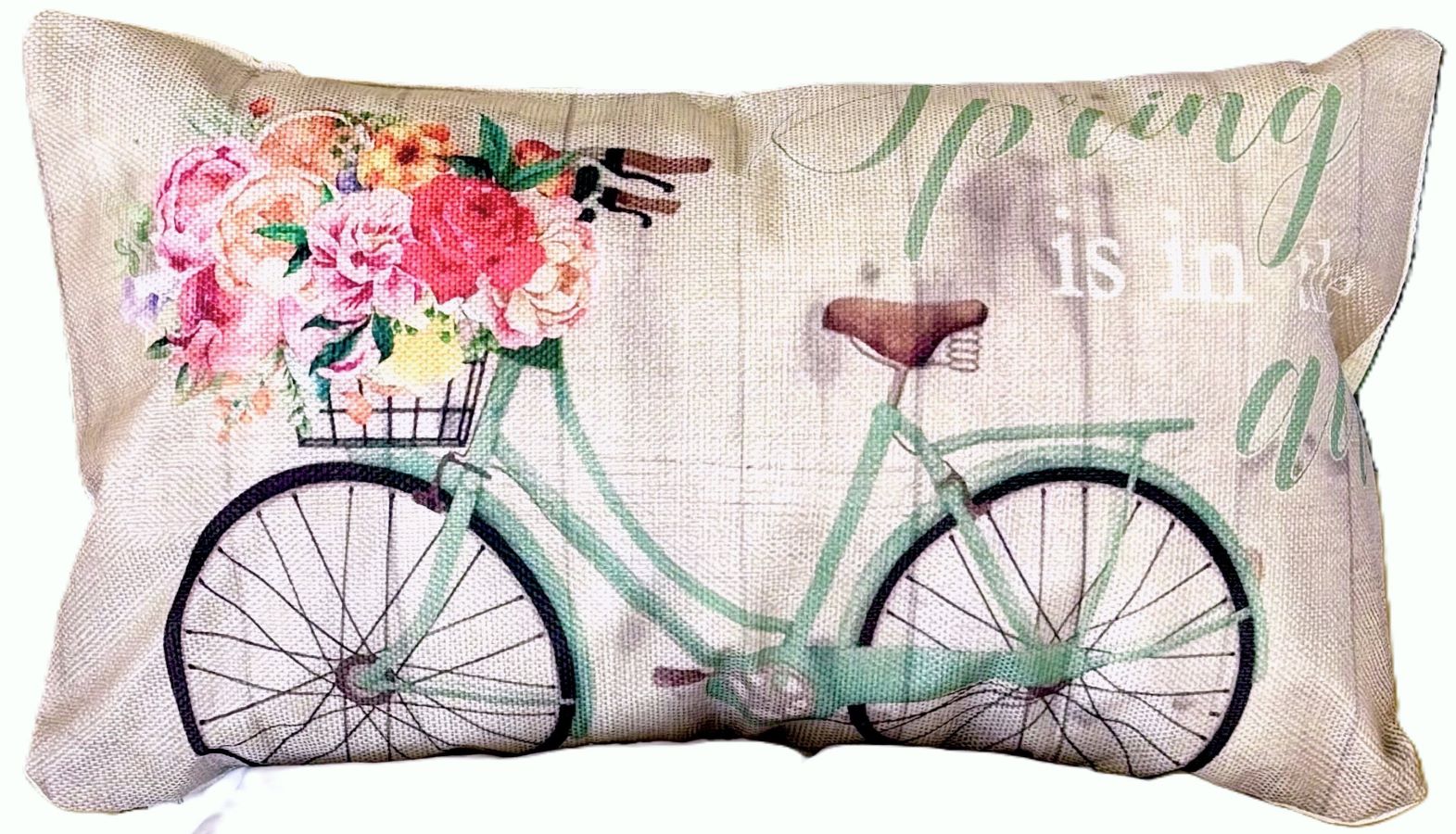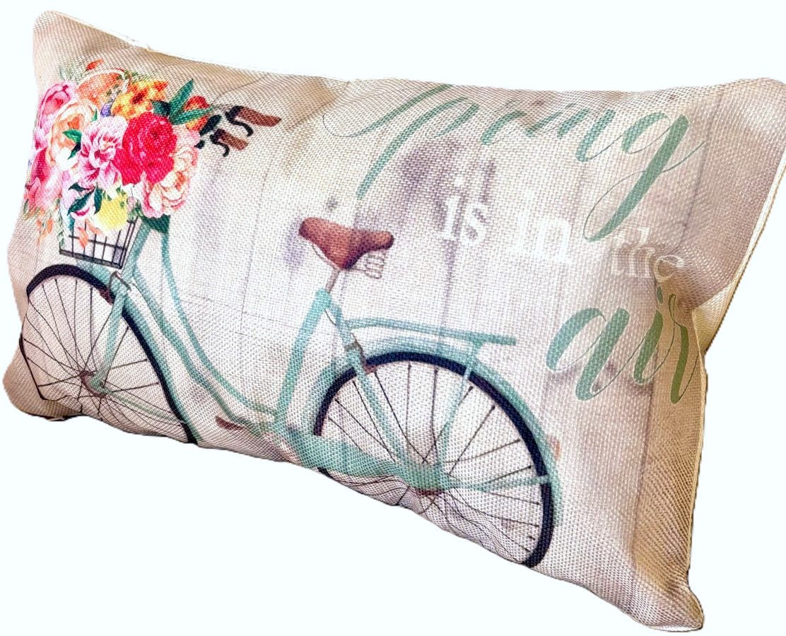 Welcome spring with this charming 12"x 20" linen throw pillow cover featuring a classic bicycle with a basket filled with vibrant flowers. Reading "Spring is in the Air", the quaint design and fresh color scheme makes this the perfect piece of seasonal 'art' for your sofa or chair.