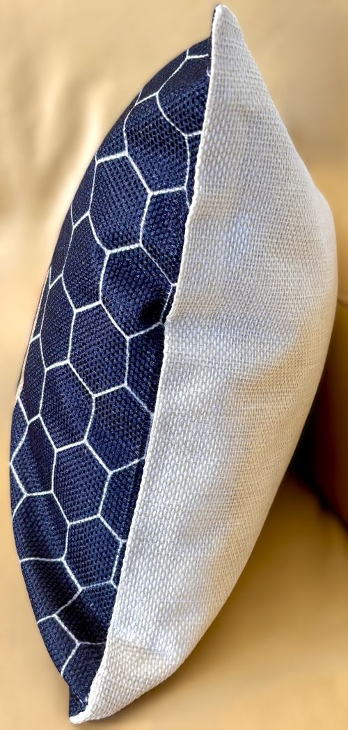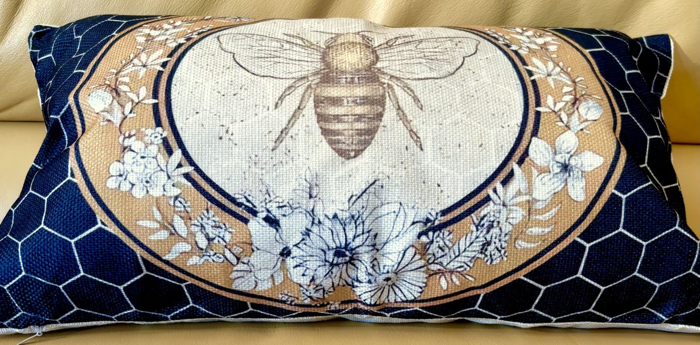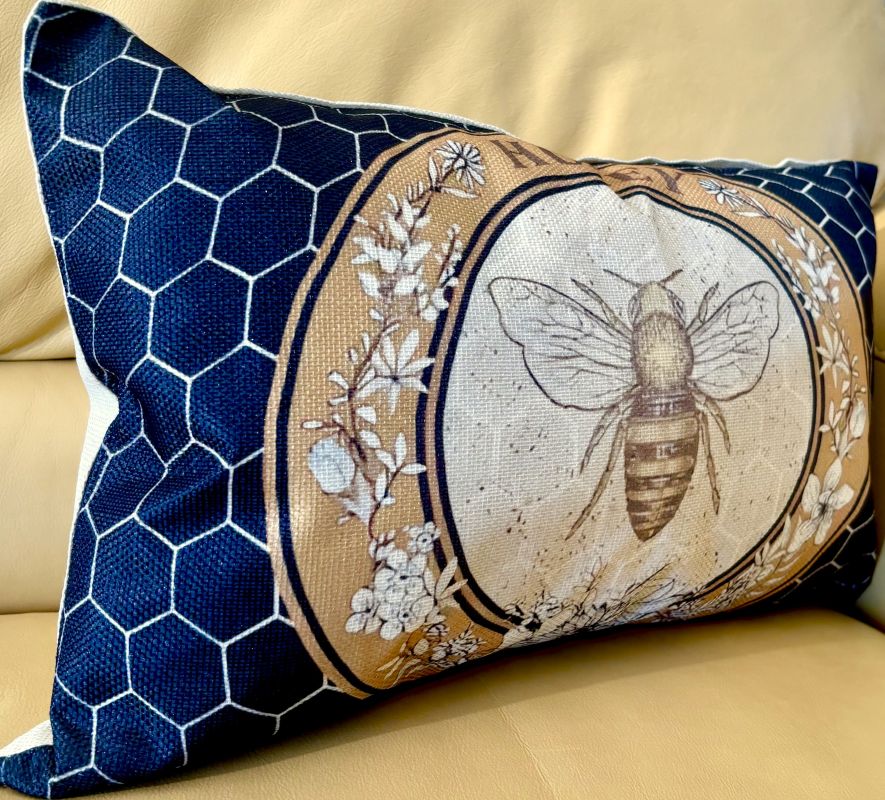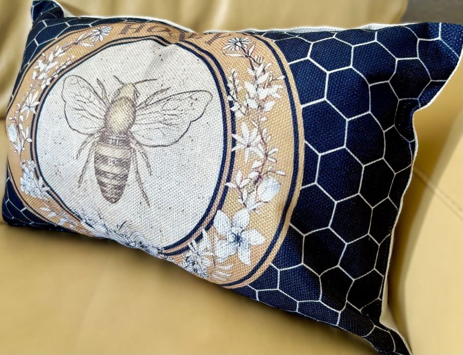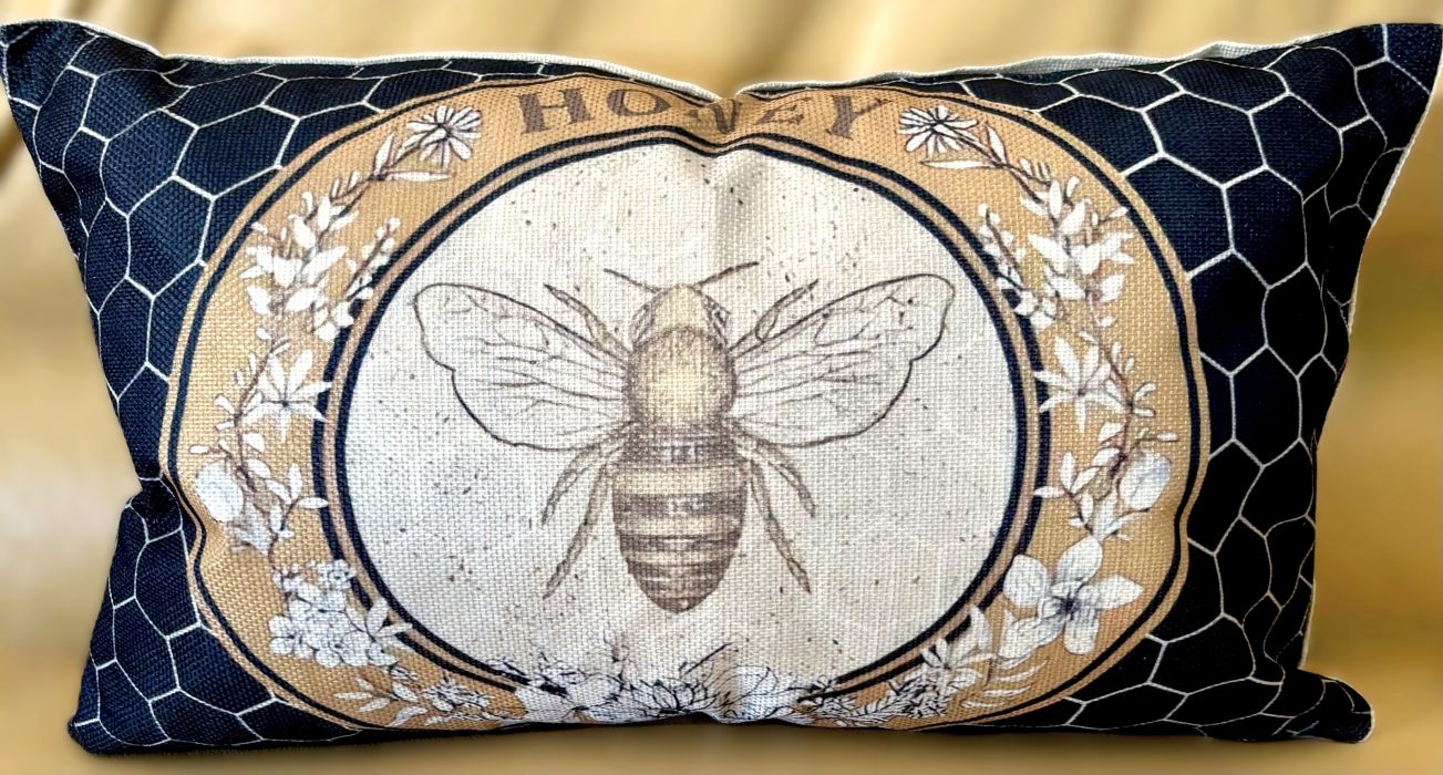 This pillow cover brings French Country charm with a sophisticated flair. It features a subtle bee image framed by a soft gold circle surrounded by delicate white flowers. The word "Honey" adorns the top for added elegance. Set against a black background with a fine white honeycomb pattern, it creates a striking contrast that enhances any space.
