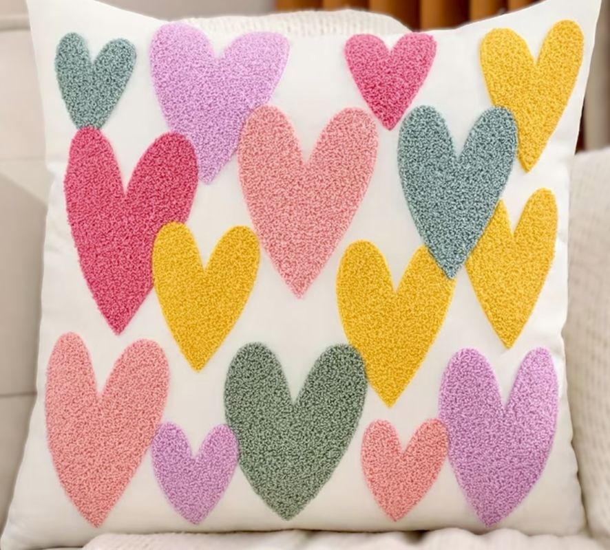 Surround yourself with whimsy with this charming 18x18 pillow cover, where cheery embroidered heart appliques dance across a soft, woven off-white canvas. The plush texture invites touch while the cheerful palette of colorful hearts brings instant personality to any room. Perfect for adding a cozy, heartfelt accent to your bed, sofa, or favorite reading nook.
