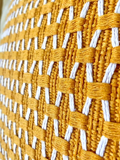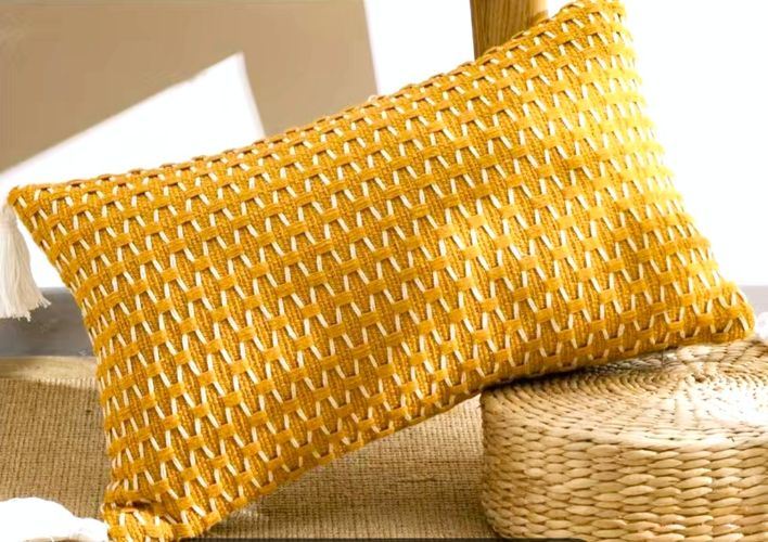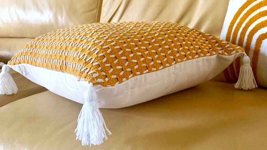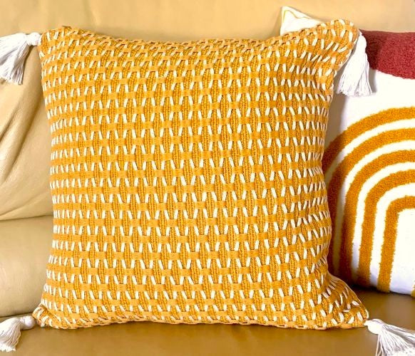 These throw pillow covers are heavyweight and of extremely nice quality. Very attractive throw pillow covers featuring a gorgeous woven design. Each corner has a full tassel that measures approx. 3" long. Featured colors are mustard (golden) yellow and beige. The back is not decorated, as can be seen in the last photo. These covers are very versatile and would work well in many different décor schemes such as Farmhouse, Modern and Boho.