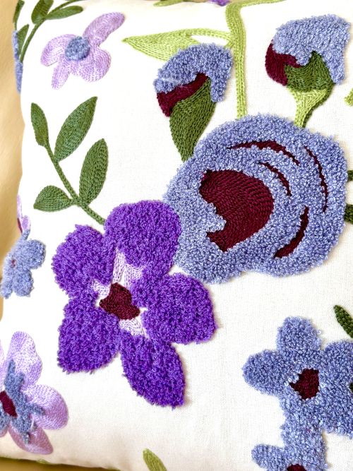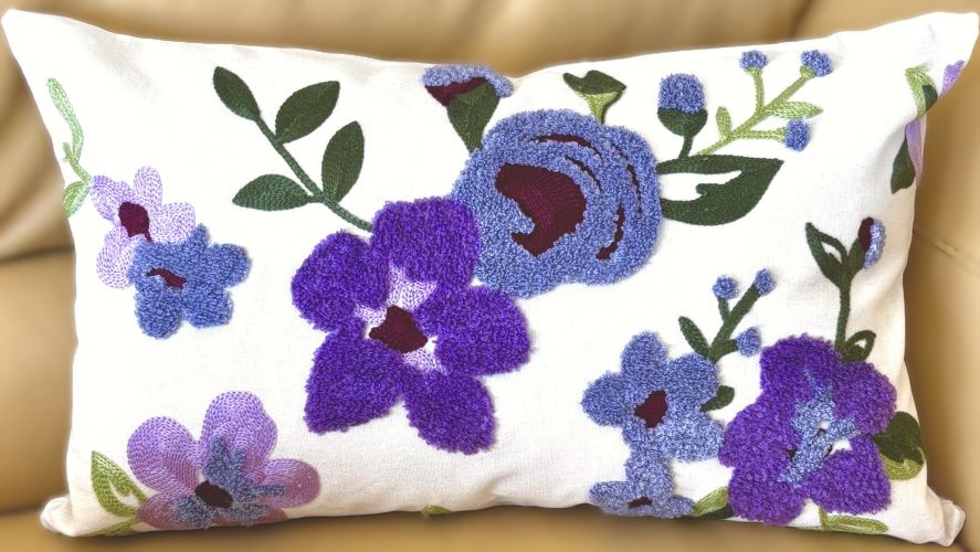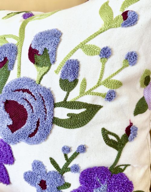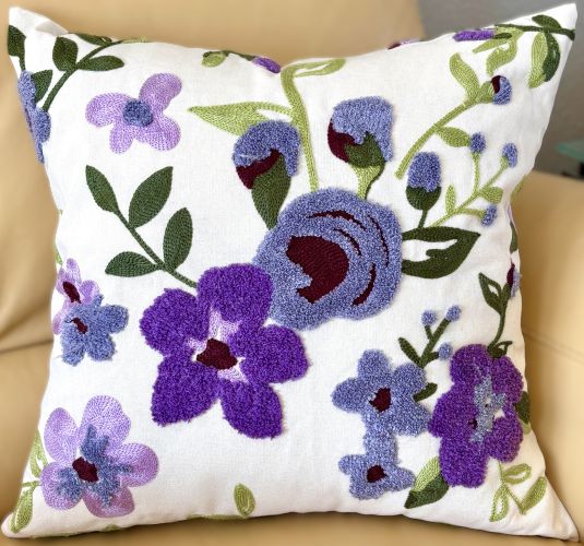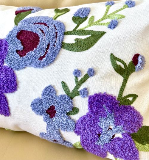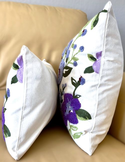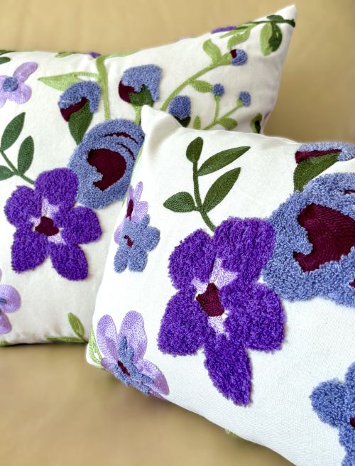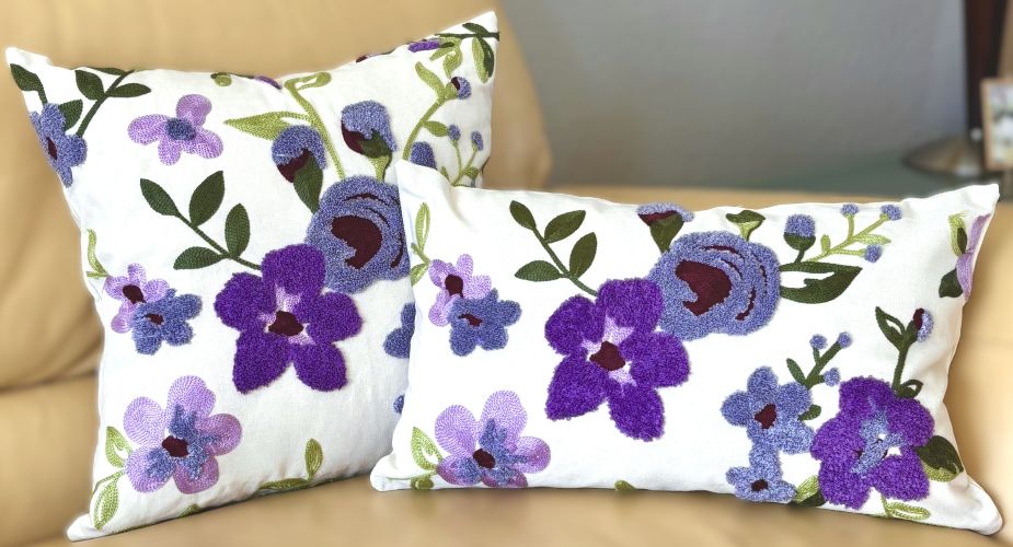 These embroidered pillow covers are fresh and fun - perfect for the warmer weather months! Durable and displaying fine craftmanship, these pillow covers feature flowers in four shades of purple with leaves in two shades of green. Fun and soft plush tufted and embroidered design! Add one or two to your decor for instant cheer.