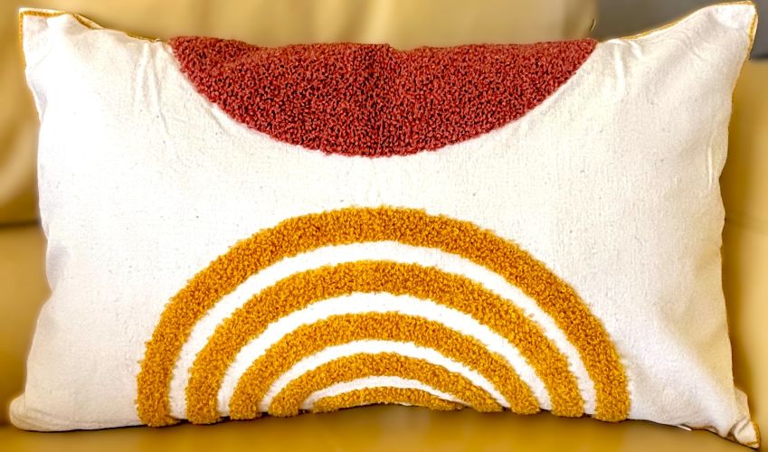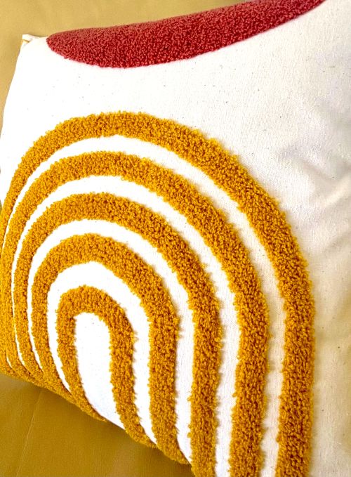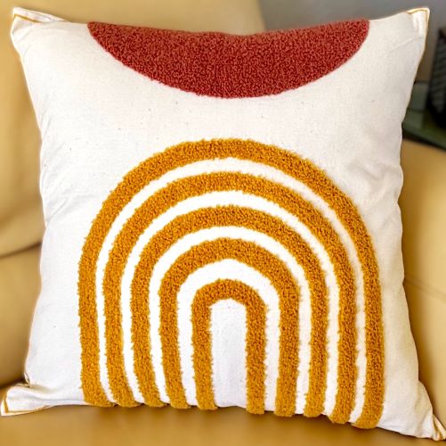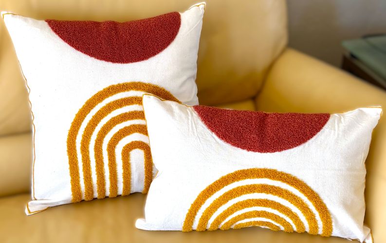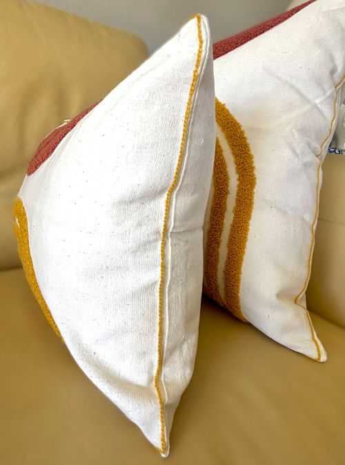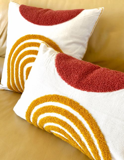 These contemporary geometric pillow covers offer a visually appealing design with a great color scheme. They feature a tufted design in gold/mustard and rust red on a natural-colored background. The back is not decorated. These covers are very versatile and would work well in a variety of décor schemes especially Bohemian and Modern.