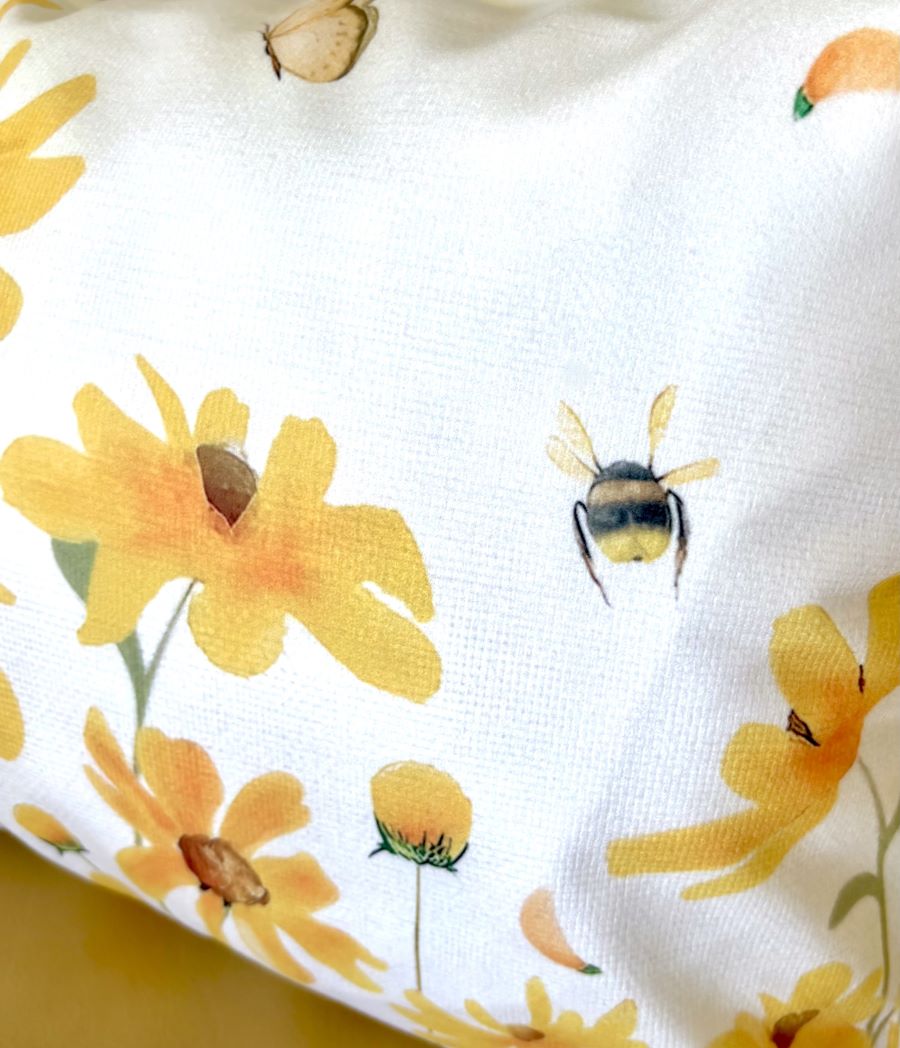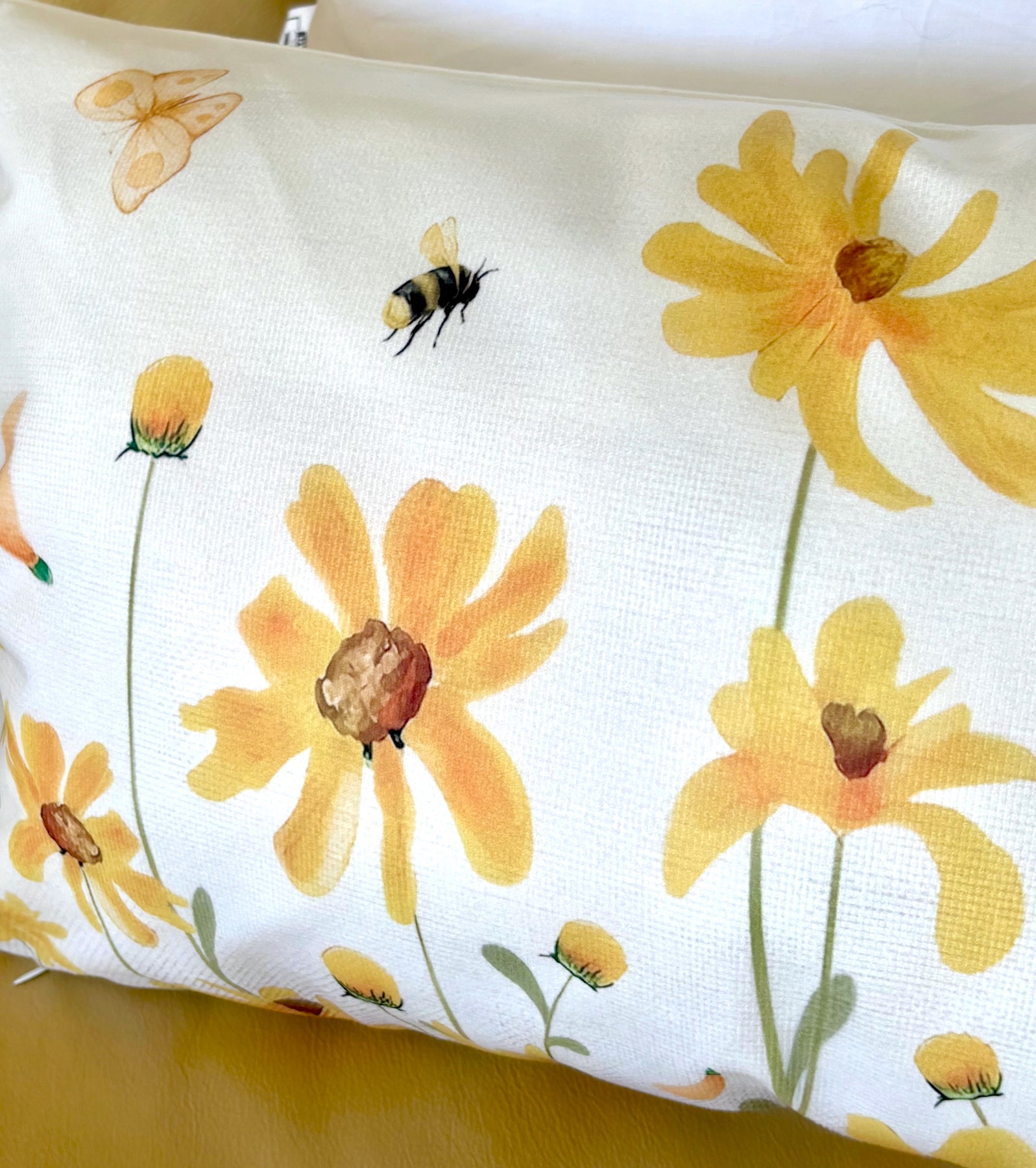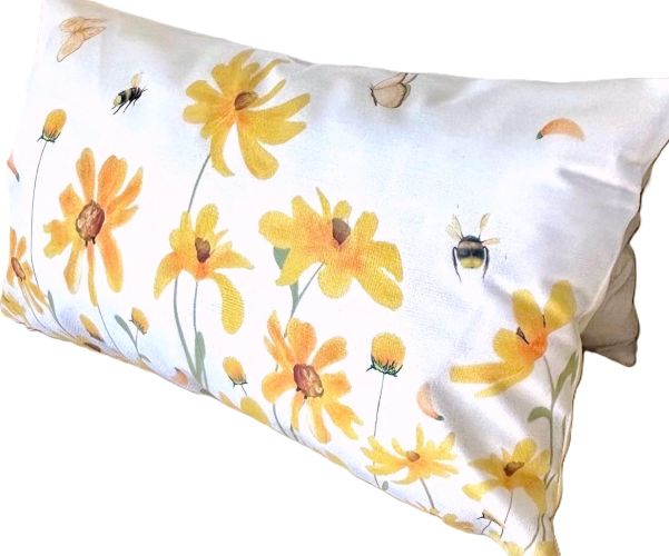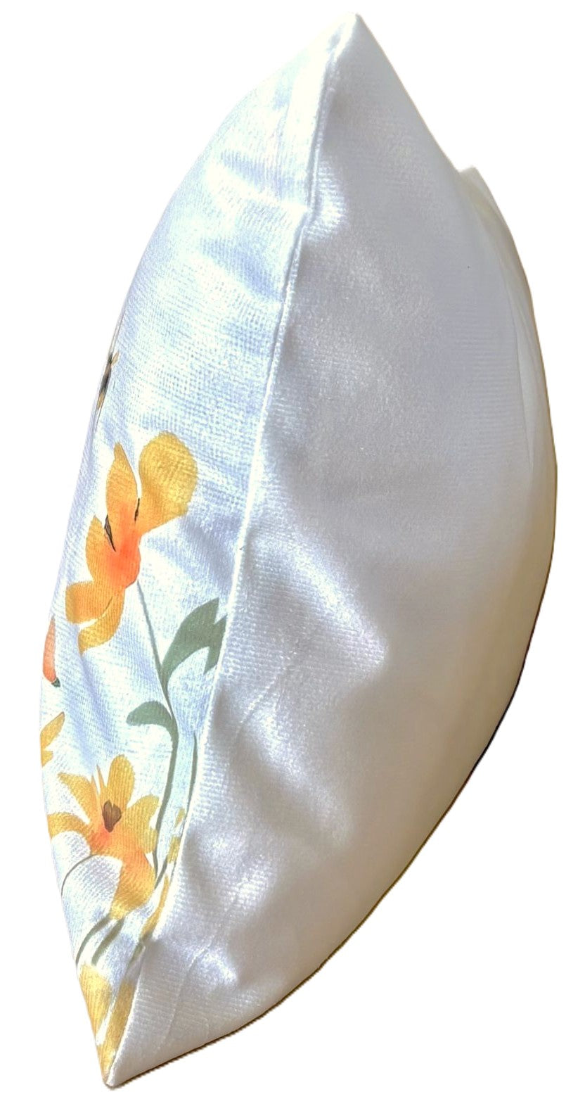 Welcome warmer weather with this charming set of two 12"x 20" throw pillow covers featuring orangish-yellow wildflowers with a couple of butterflies and bees flying around.