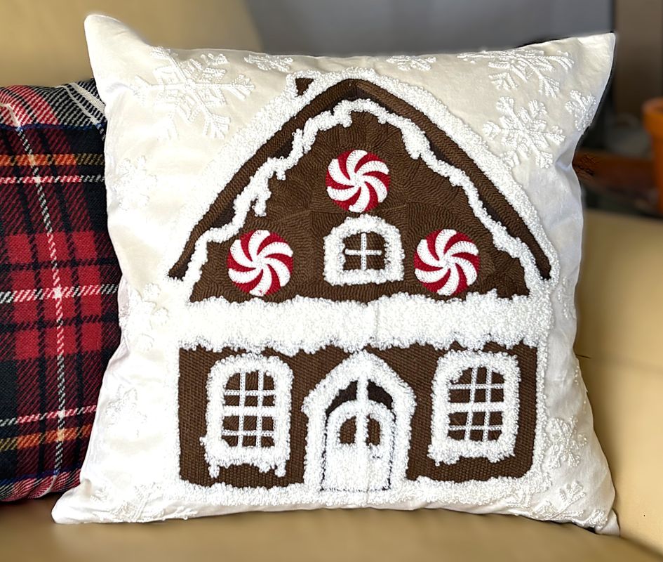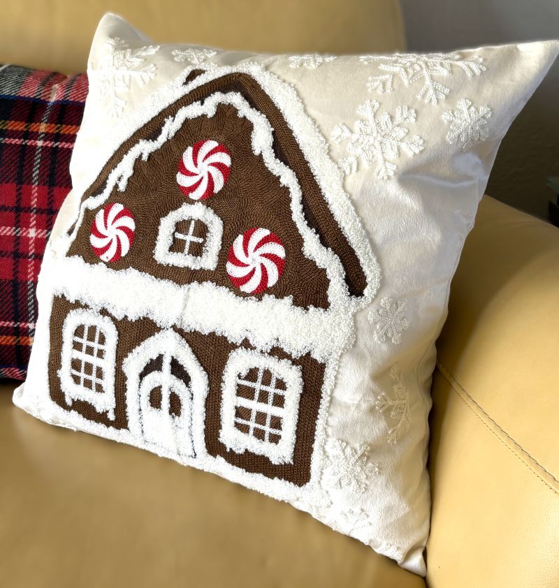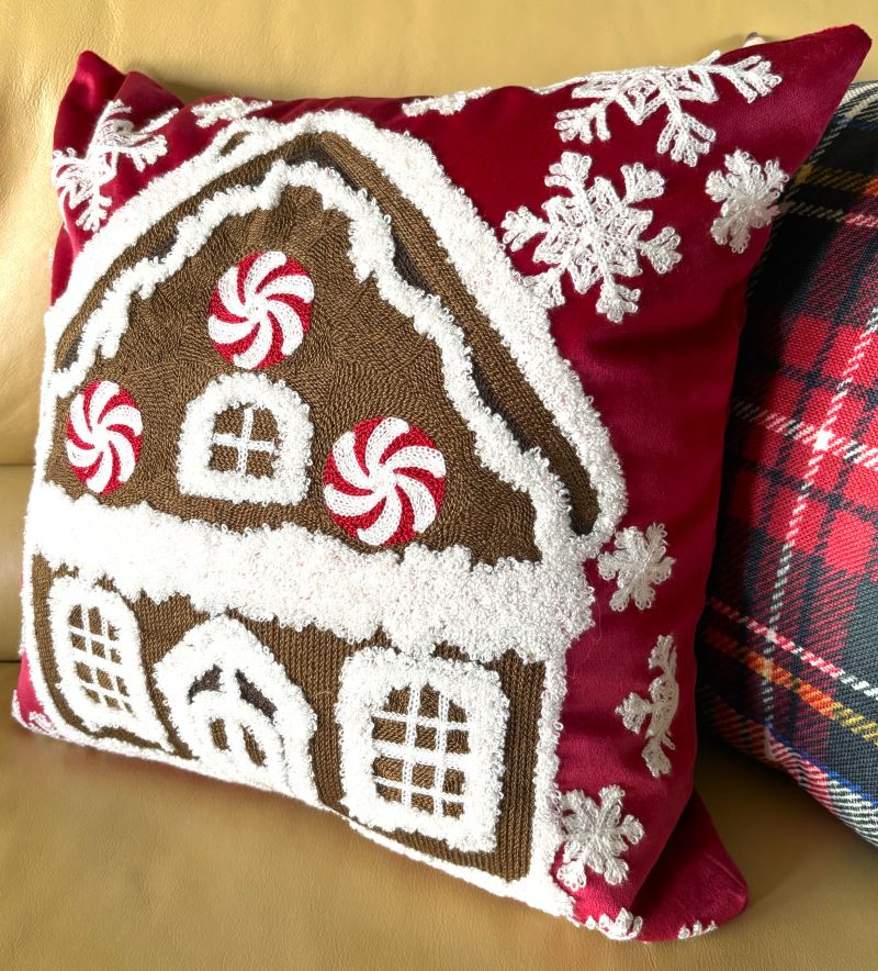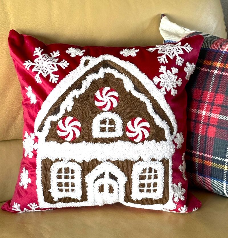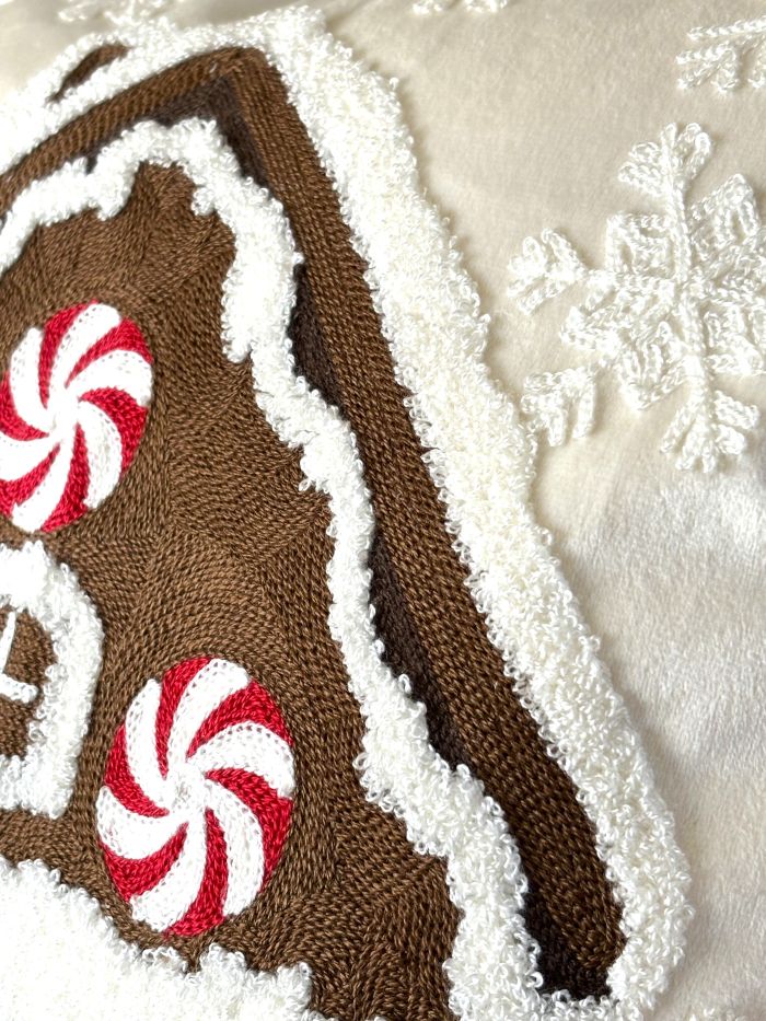 Transform your holiday spaces with this enchanting Gingerbread House pillow cover, where festive charm meets luxurious comfort. Crafted from sumptuous velvet, it showcases intricate embroidered and tufted artistry—a gingerbread house adorned with whimsical peppermint swirls surrounded by delicately embroidered snowflakes. The meticulous detailing and rich red or off-white palette create an instant focal point that elevates any room's seasonal aesthetic. Perfect for adding that coveted handcrafted elegance to your holiday décor. Available with a red or off-white background.