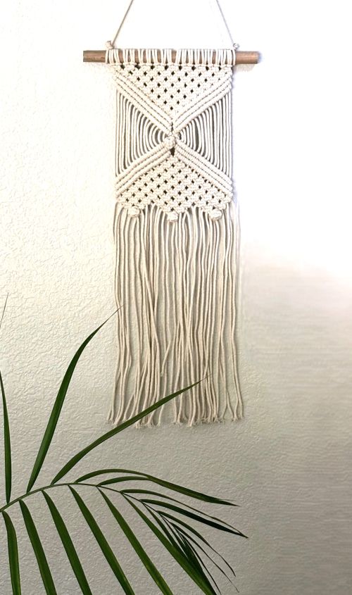 This unique macramé wall hanging is made from high-quality cotton, ensuring durability and a quality look. The neutral beige tone and intricate patterns adds a touch of sophistication to any space, making it a standout piece in your home décor.