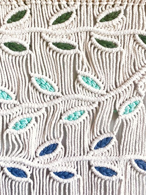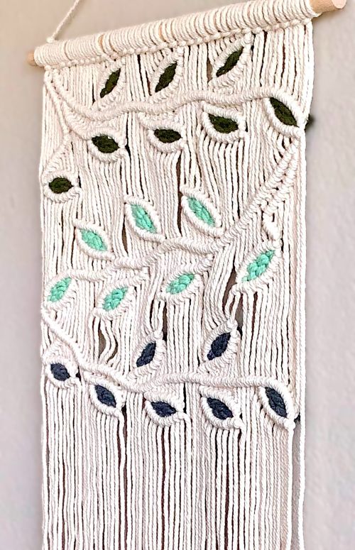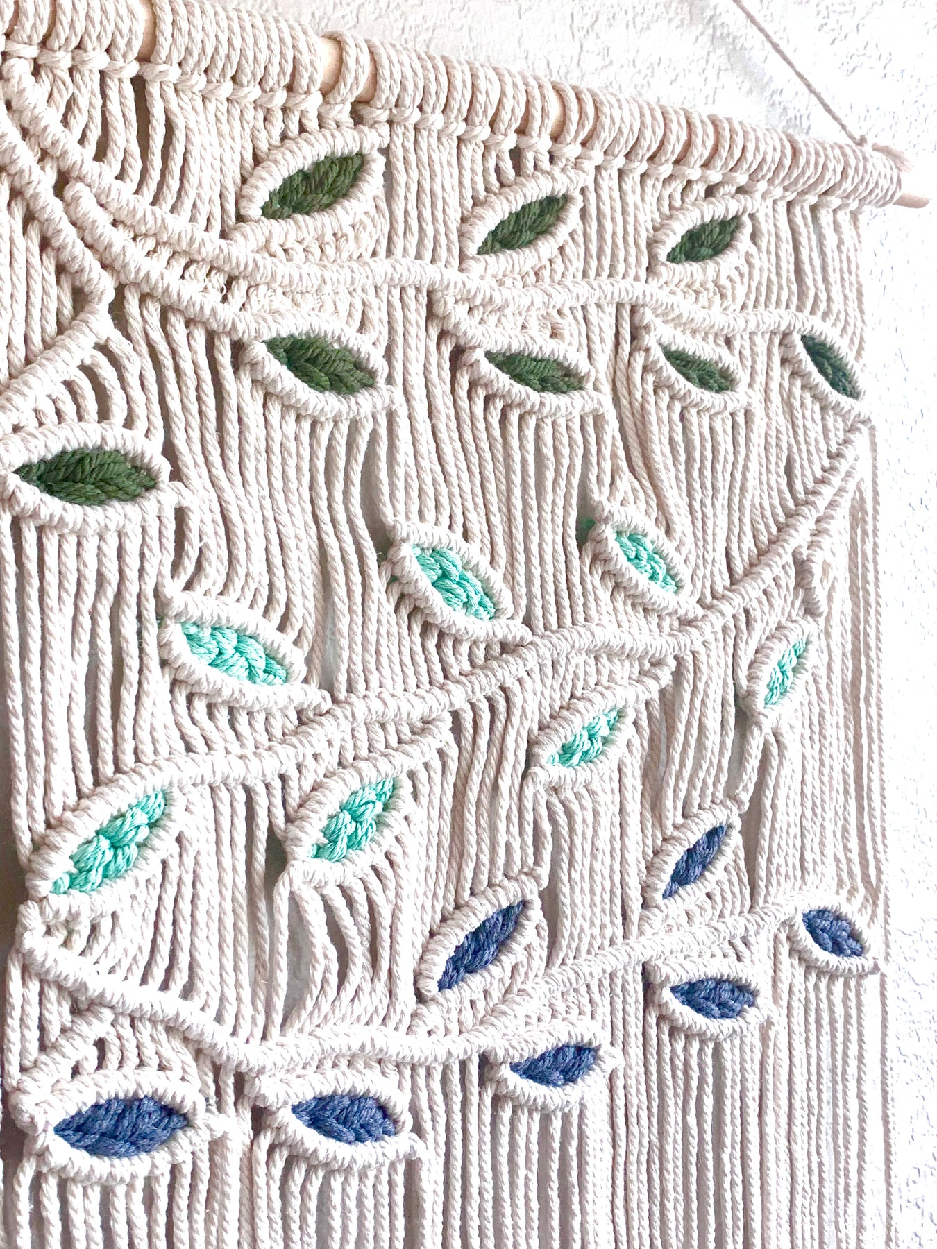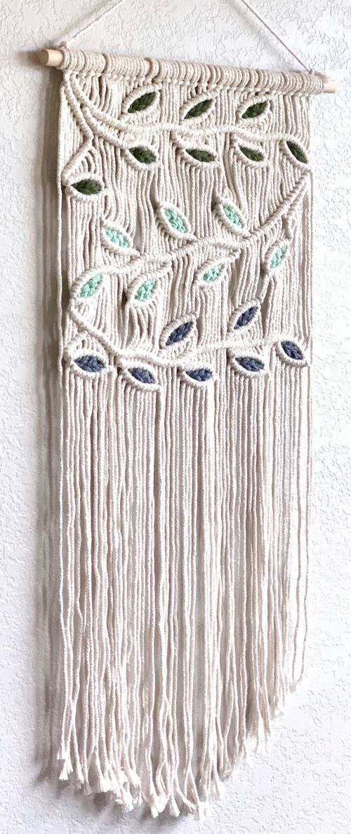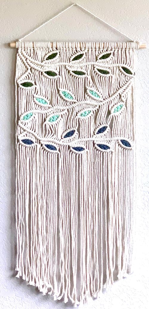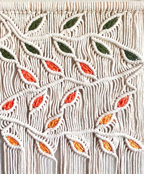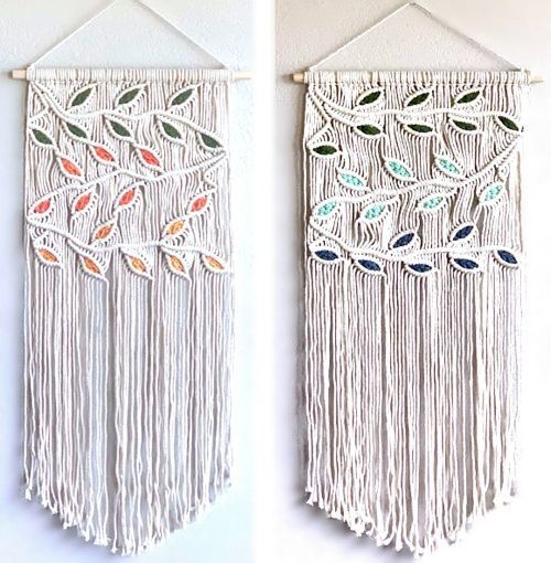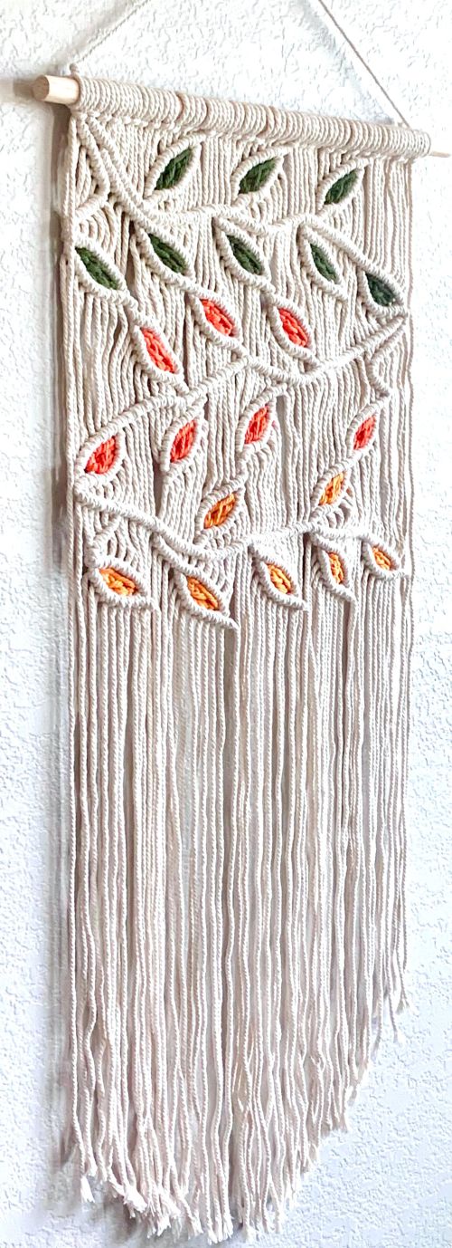 This wall hanging exhibits exquisite craftmanship. The design consists if colorful leaves woven into the macrame design. Two color styles are available; 'Warm' which features leaves in forest green, vibrant orange and yellow-orange and 'Cool' style which features leaves in forest green, light teal and blue-gray.