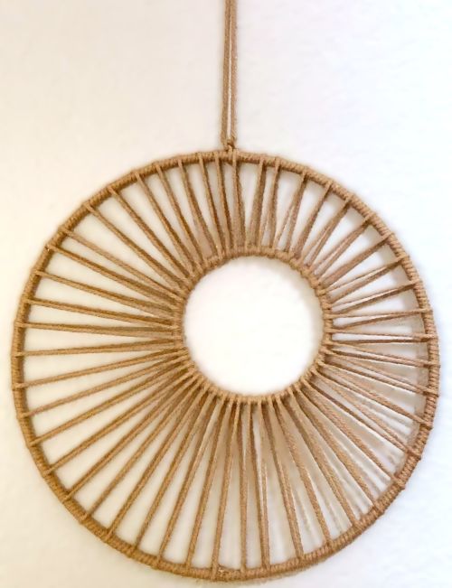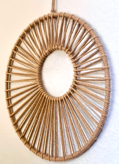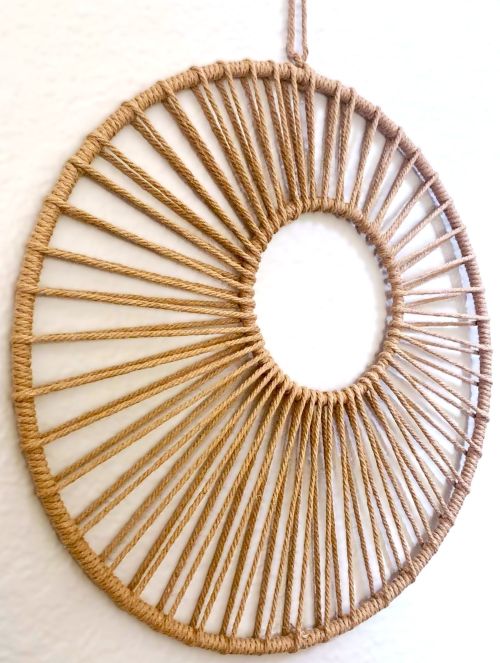 This is a circular, double loop woven wall hanging. It features an off-center, inner circle cut-out which gives it great visual appeal - it takes on a three-dimensional effect, seeming to move. This piece would fit well into many different decor schemes from Retro to Modern!