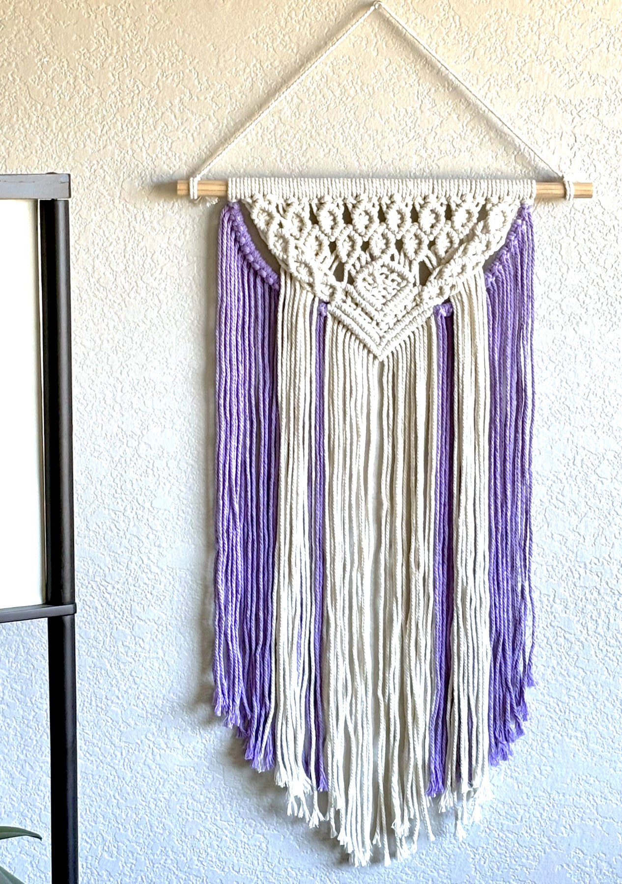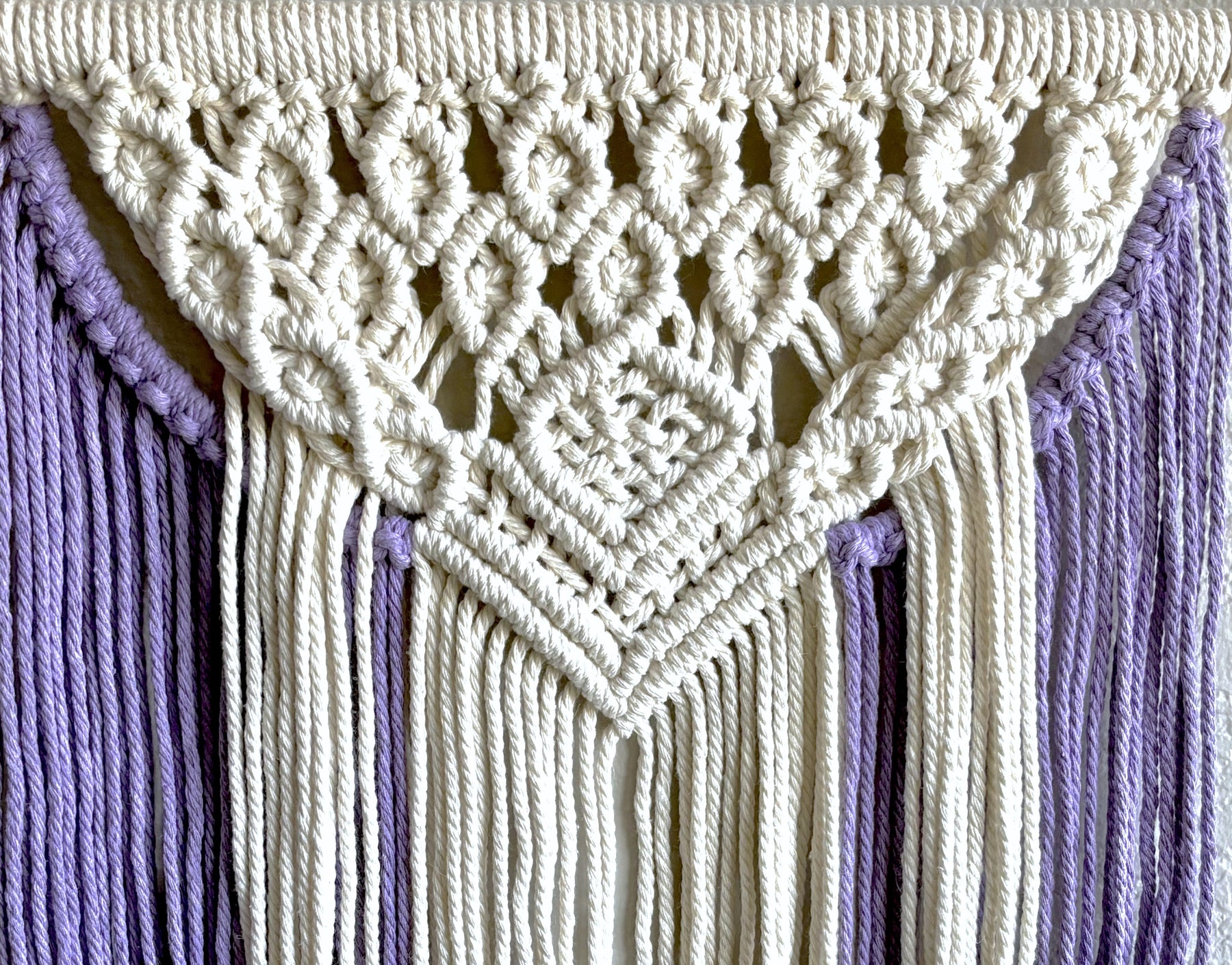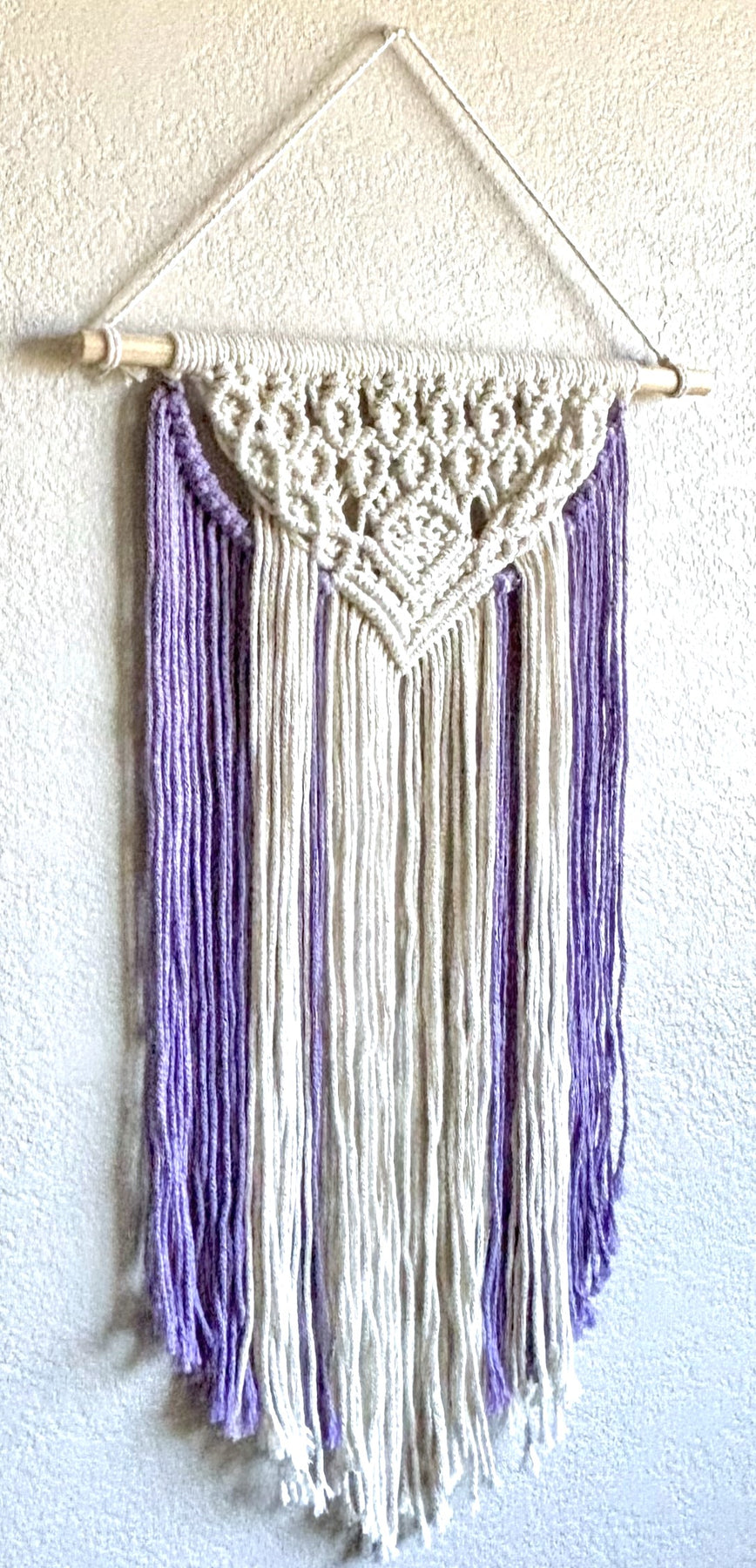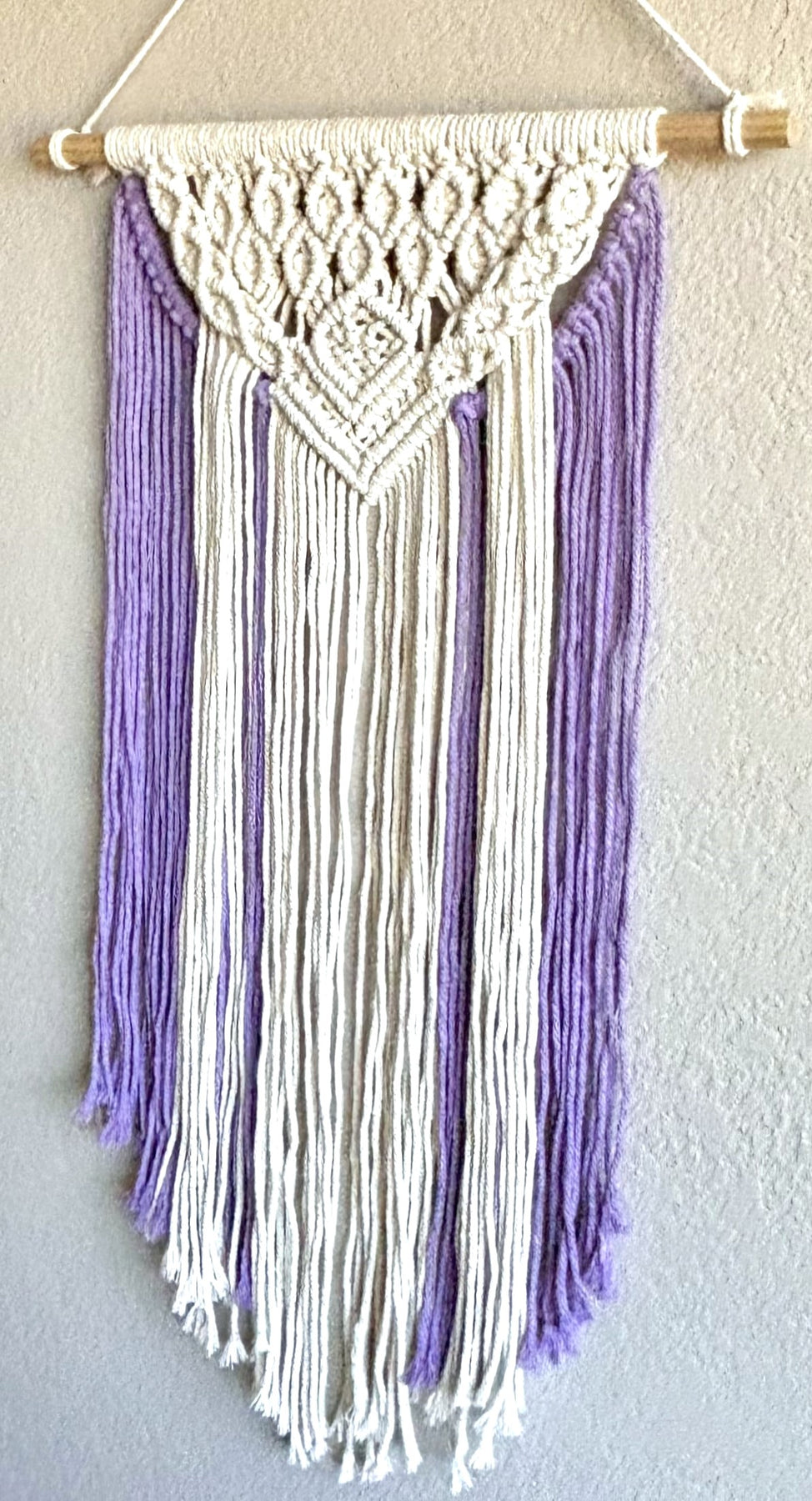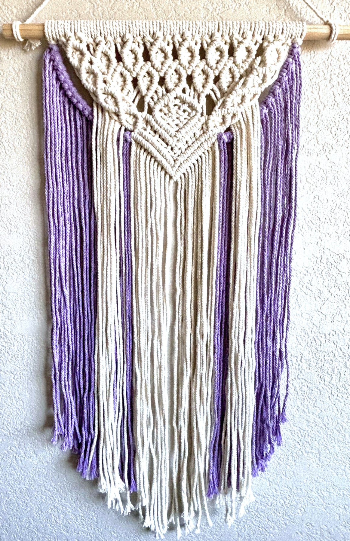 This macrame wall hanging offers a relaxing color scheme of lavender and beige. The macrame design features beautifully intricate work and it has a unique open, layered design. The pretty lavender and beige colors make this a beautiful choice for hanging in a nursery or girl's bedroom. Made from cotton rope with a wooden dowel.