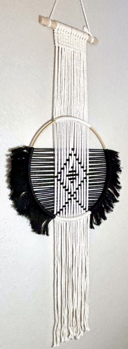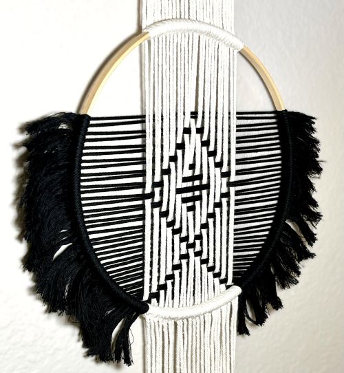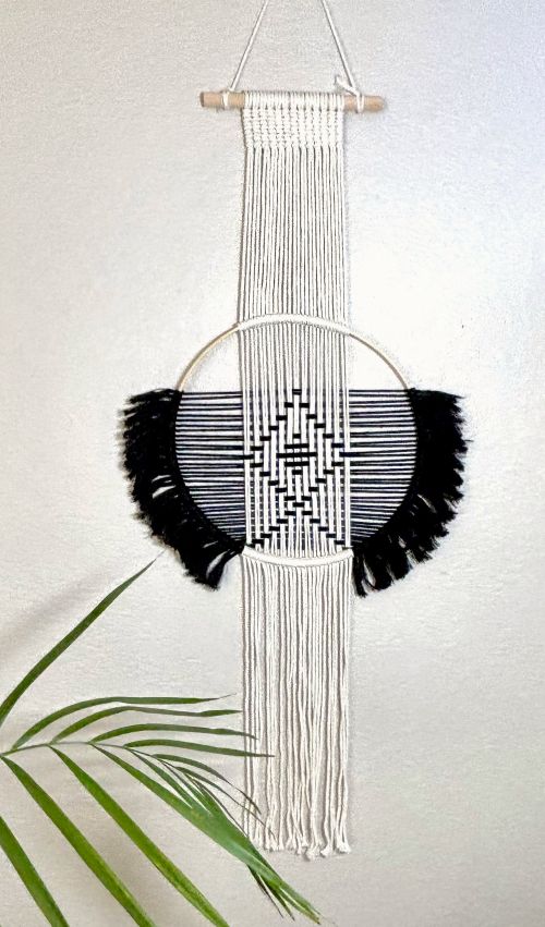 This is an attractive contemporary woven wall hanging that is versatile in nature due to its crisp black/beige color scheme and contemporary geometric design. The woven portion features a unique diamond geometric pattern. It really 'pops' with the contrast of the black against the beige.
