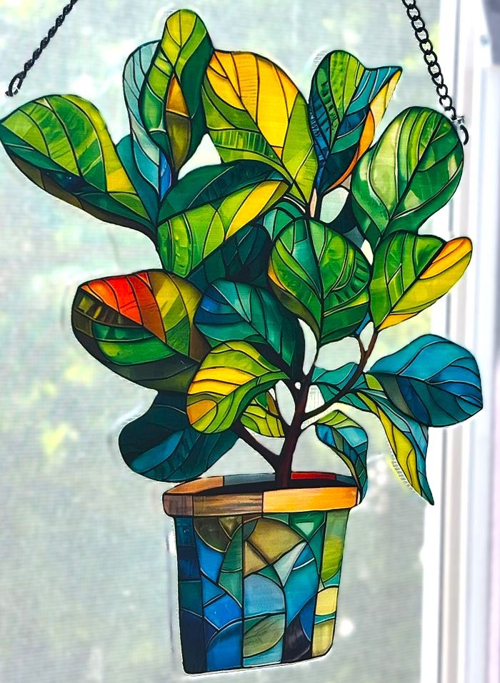 This suncatcher features a potted Fiddle Leaf Fig with gorgeous leaves designed in multiple shades of green, yellow, and blue. The mosaic pot has matching colors. This suncatcher will instantly add a 'pop' of color and flair. Hang it in a sunny window and watch the image really come to life as the light illuminates it!