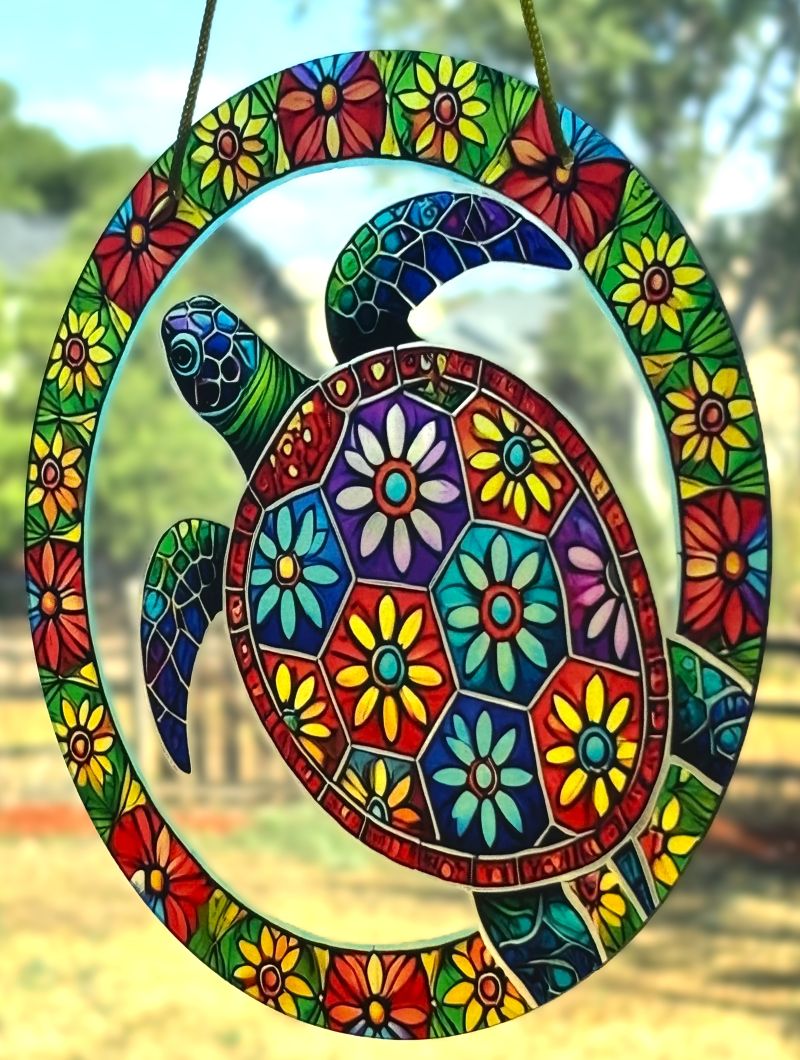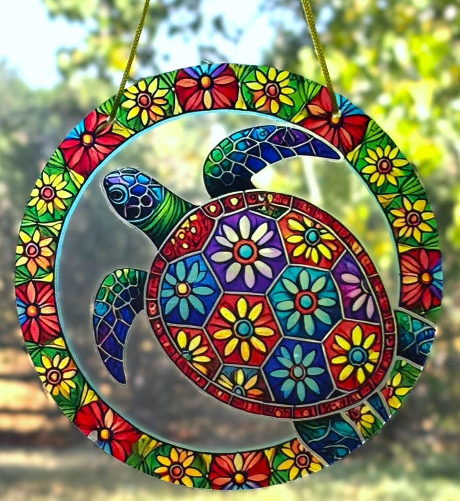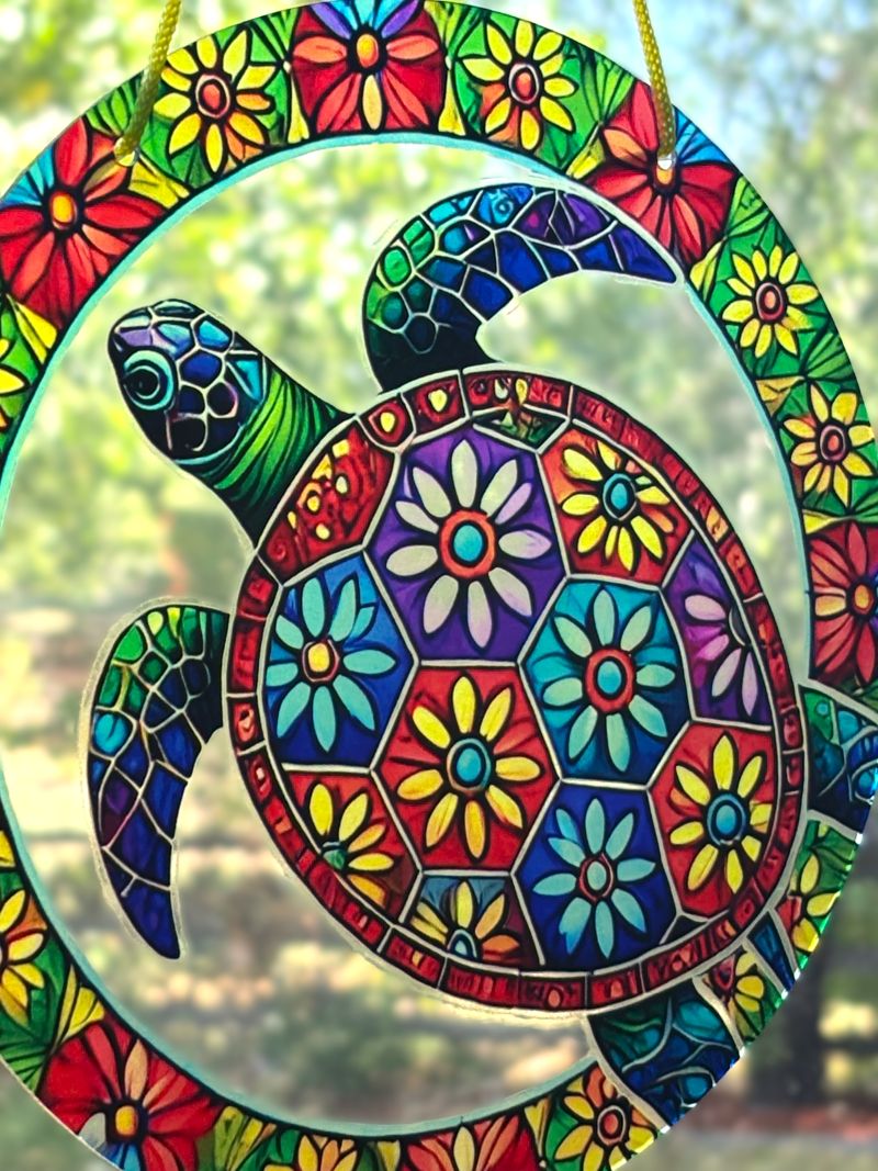 This stunning sun catcher showcases a beautifully detailed sea turtle adorned with floral patterns on its shell and around the border. Its artistic floral motifs evoke a lively tropical and ethnic feel, enhanced by bright, vivid colors that bring the design to life.