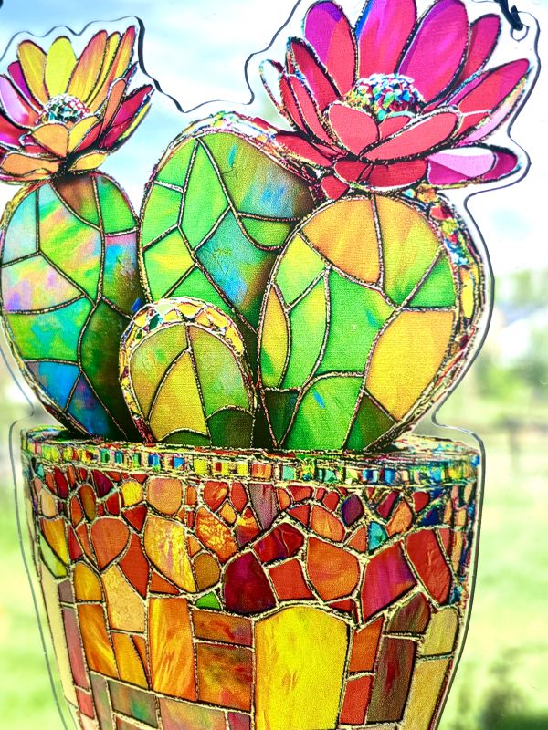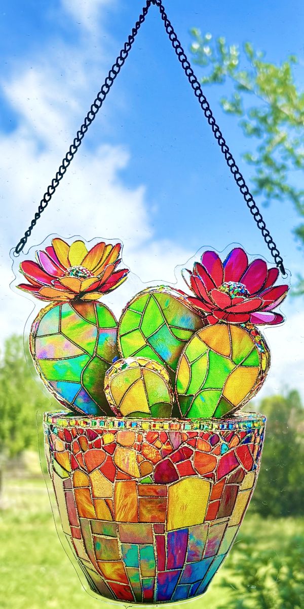 This sun catcher showcases a stunning cactus in full bloom, displaying vivid pink, yellow, and orange flowers. Nestled in a brightly colored mosaic pot, it brings a lively splash of color to any space. Hang it in a sunny window and let the sunlight bring this vibrant scene to life, adding warmth and a 'pop' of color to your home.