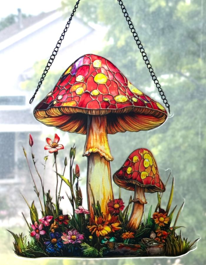 This delightful sun catcher showcases two spotted toadstools nestled in a forest setting, surrounded by vibrant flowers. Positioned in a sunny window, it captures and transforms the light, illuminating the toadstools and blossoms to create a stunning, lively display that enhances any room with warmth and charm.