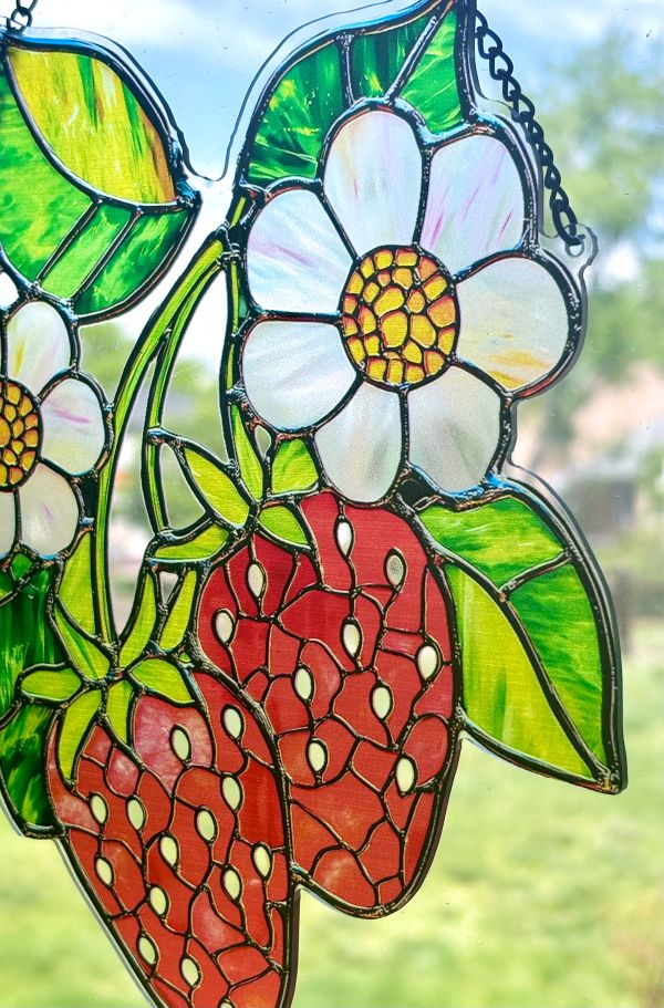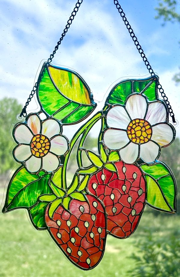 This charming sun catcher showcases two freshly picked strawberries alongside beautiful white strawberry blossoms, creating a cheerful design that will brighten your day.