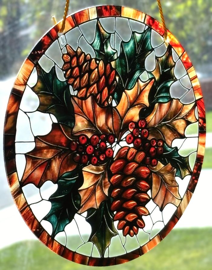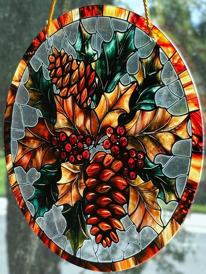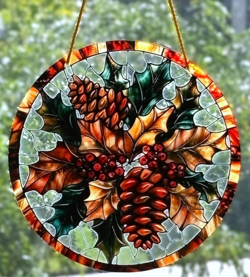 Bring festive charm and cozy warmth to your home with the Holly Berry and Pine Cone Holiday Sun Hanging. Designed to brighten any sunny window, this elegant sun catcher blends natural elements like pine cones with vibrant holly berries in rich shades of red, green, and brown. Its traditional holiday colors instantly create a joyful atmosphere, making your space feel inviting and celebratory.