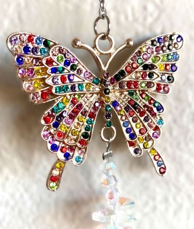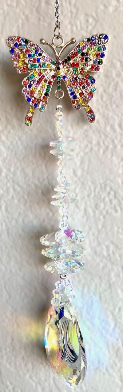 This is a beautiful suncatcher featuring a cast gold tone metal butterfly. The butterfly is encrusted with lots of rhinestones in many different colors. The many colors makes it extra brilliant in the sunshine! Below the butterfly are iridescent crystals in different shapes and sizes, leading to a large faceted iridescent prism. The prism is teardrop-shaped with an oval indention on both sides.