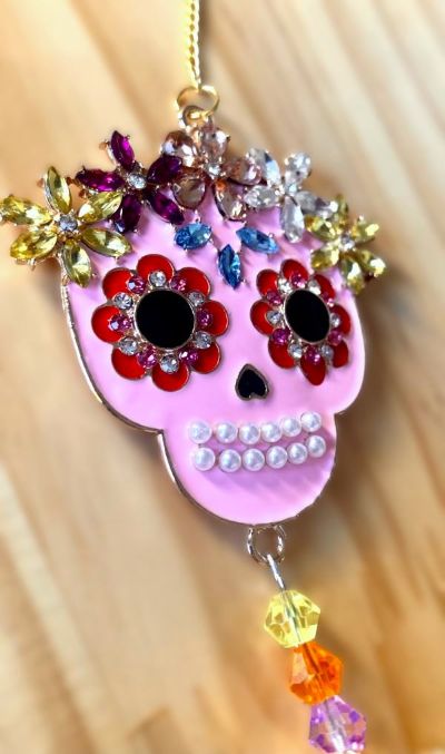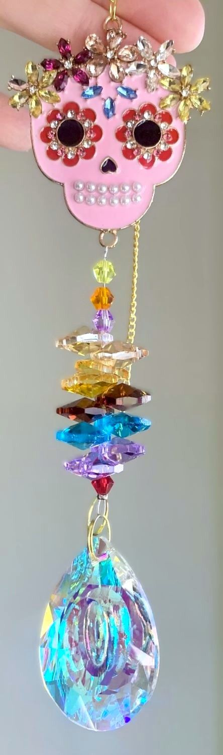 This listing is for a very cool crystal and prism suncatcher featuring a bejeweled and beaded female sugar skull. Very detailed and colorful! The sugar skull is made of shiny gold tone metal and is hand painted with glossy-finish enamel in pink, black and red. It is ornately decorated with multicolor rhinestones in different shapes and sizes and faux pearl beads make up her mouth/teeth. She has a crown of "jewels" - rhinestones in colors of clear, light pink, purple, light greenish yellow and blue.