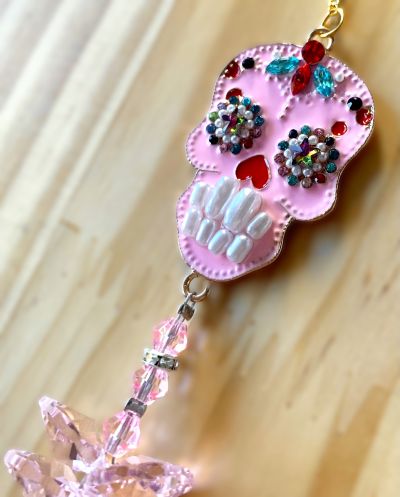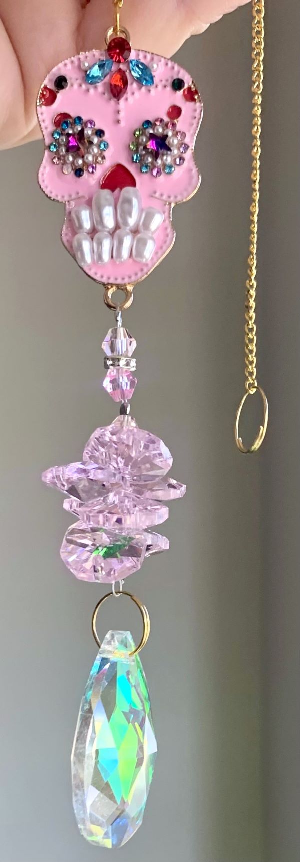 This listing is for a very cool crystal prism suncatcher featuring a bejeweled and beaded male sugar skull. Very detailed and colorful! The sugar skull is made of shiny gold tone metal and is hand painted with glossy-finish enamel in pink and red. It is ornately decorated with multicolor rhinestones in different shapes and sizes and faux pearl beads make up his mouth/teeth.
