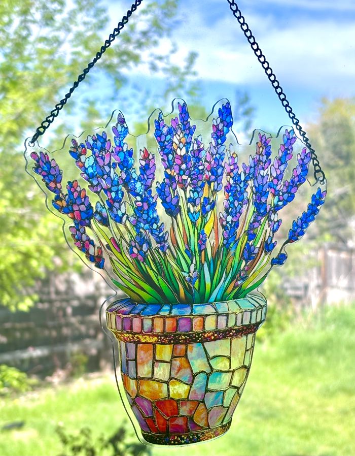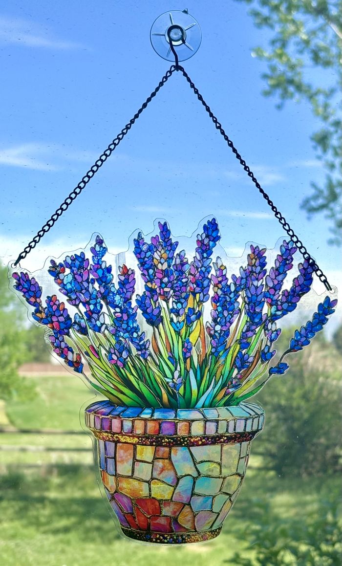 This charming sun hanging showcases lush lavender in a stunning mosaic pot that blends warm and cool hues in perfect harmony. When placed in a sunlit window, the light transforms the piece, bringing the lavender and colorful pot design to radiant life, creating a captivating display that brightens any space.
