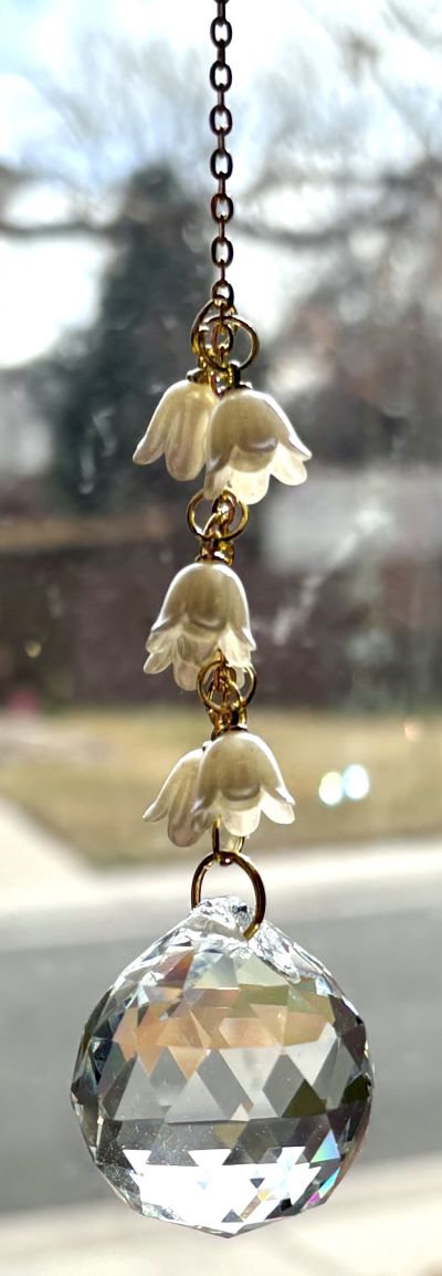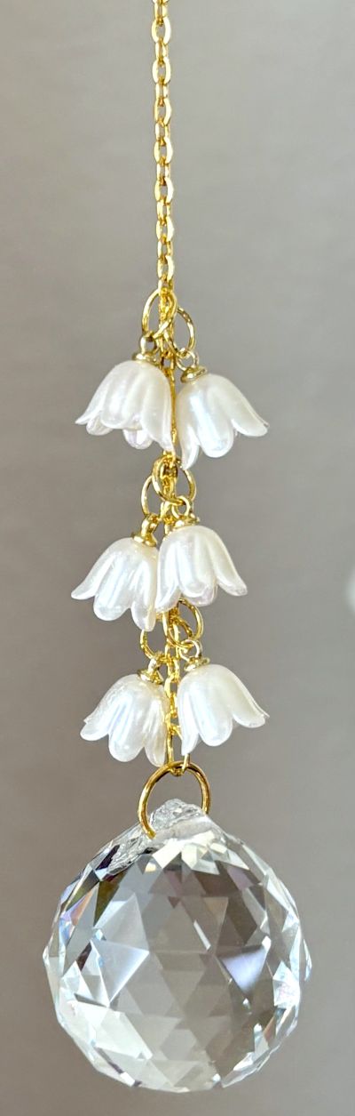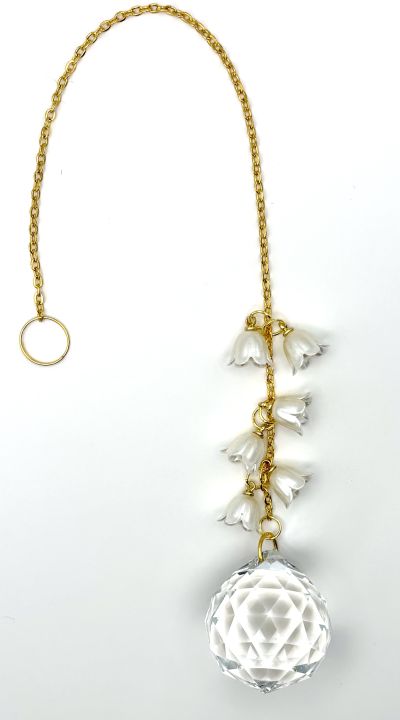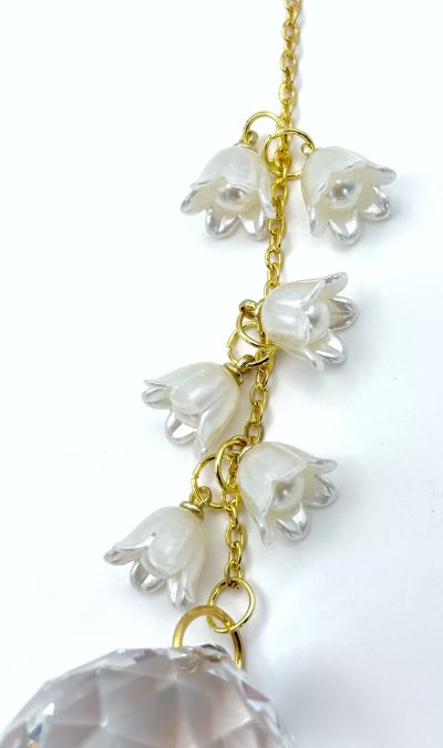 Invite warmer weather into your home with this beautifully delicate Lily of the Valley sun catcher. It has a golden chain which features six dainty, pearlescent Lily of the Valley blooms and a faceted prism ball. The flower decorated portion measures 2"L on the chain.