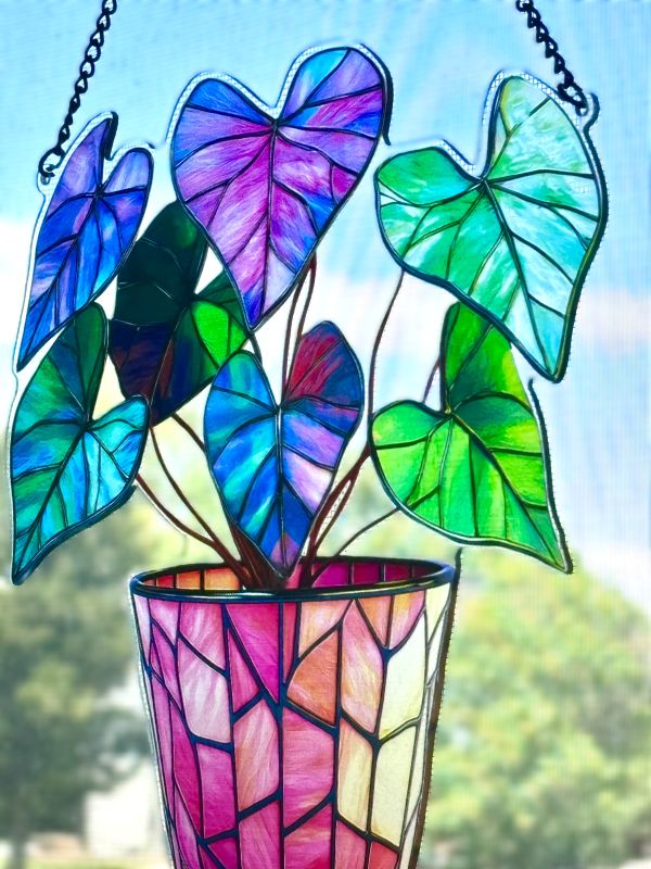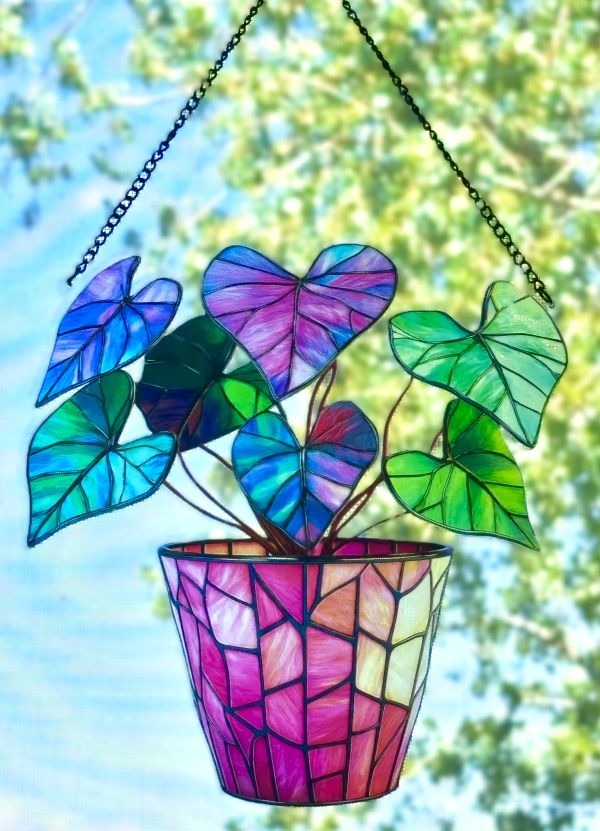 This suncatcher showcases an exquisite potted plant with heart-shaped foliage in vibrant pink, purple, blue, and green hues. The distinctive leaf coloration creates a visually striking effect. When hung where the outside light can go through it, the colorful potted plant is enhanced and brought to life.