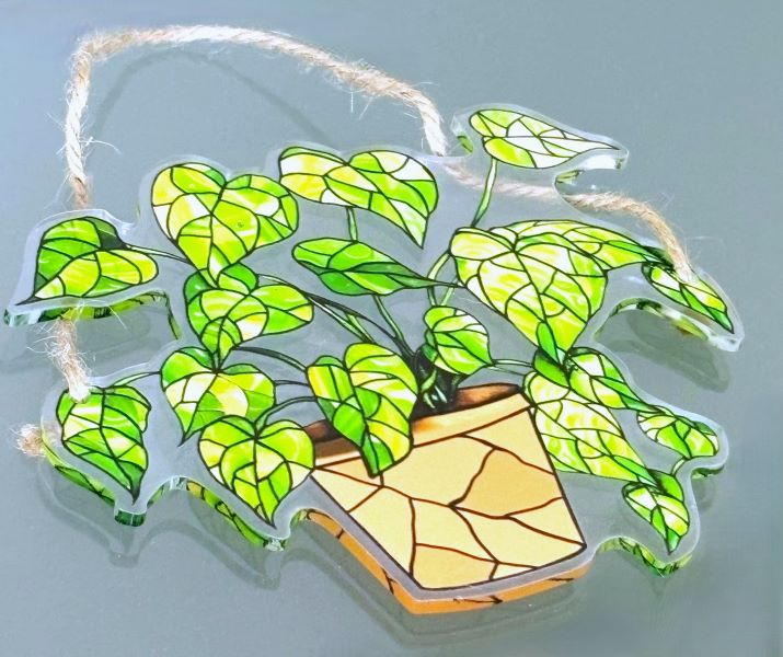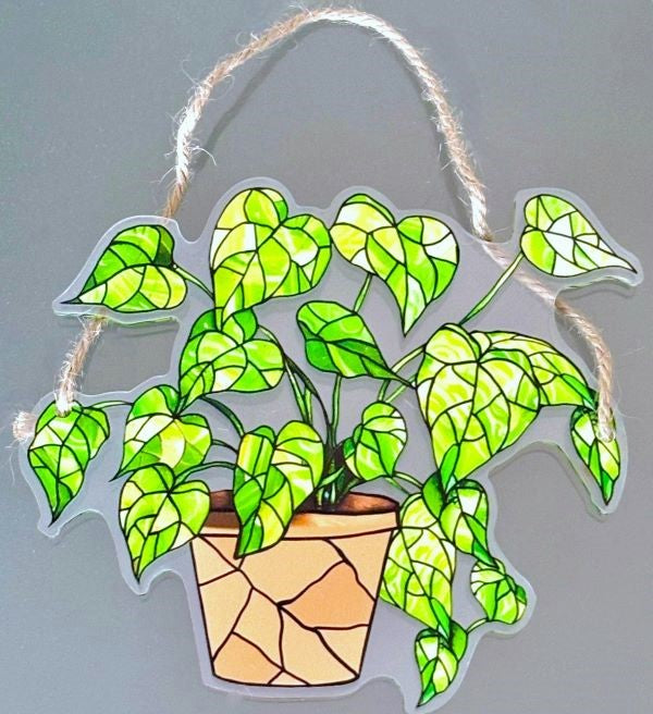 This suncatcher features a potted Pothos-type of plant with gorgeous leaves designed in multiple shades of green; grass green, lime, chartreuse, etc. This suncatcher will instantly add a 'pop' of color. Hang it in a sunny window and watch the image really come to life as the light illuminates it!