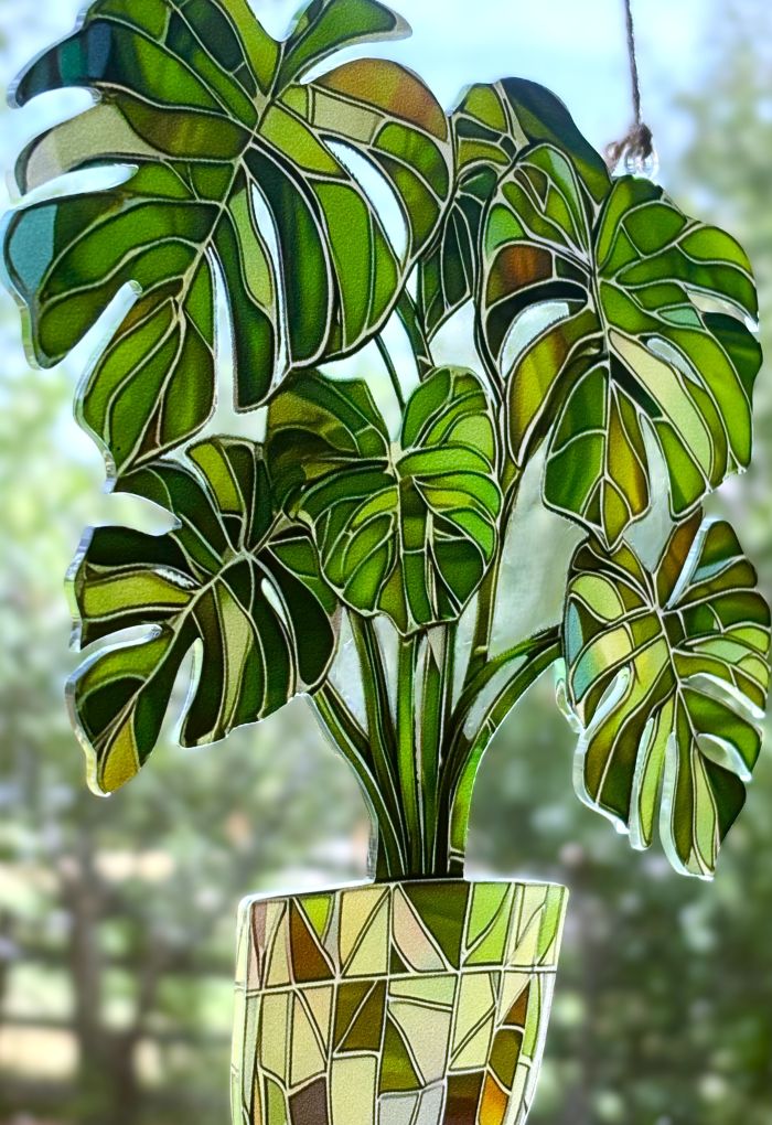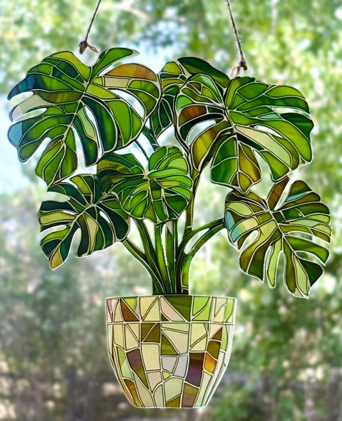 This suncatcher features a gorgeous Monstera plant with variegated leaves. It is planted in an attractive multicolor mosaic pot. Hang it in a sunny window and watch the image really come to life as the light illuminates it!