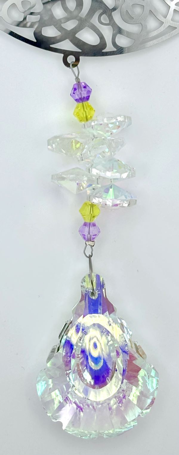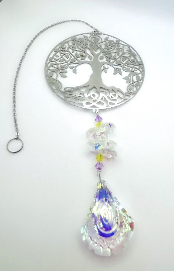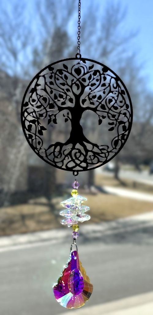 Brighten up your space with our pretty silver Tree of Life suncatcher! Each suncatcher features a beautifully designed silver Tree of Life measuring 3 3/4" diameter. Iridescent, purple and yellow faceted glass crystals adorn this suncatcher. The crystals catch the sunlight and create a mesmerizing display of colors that dance across your walls.