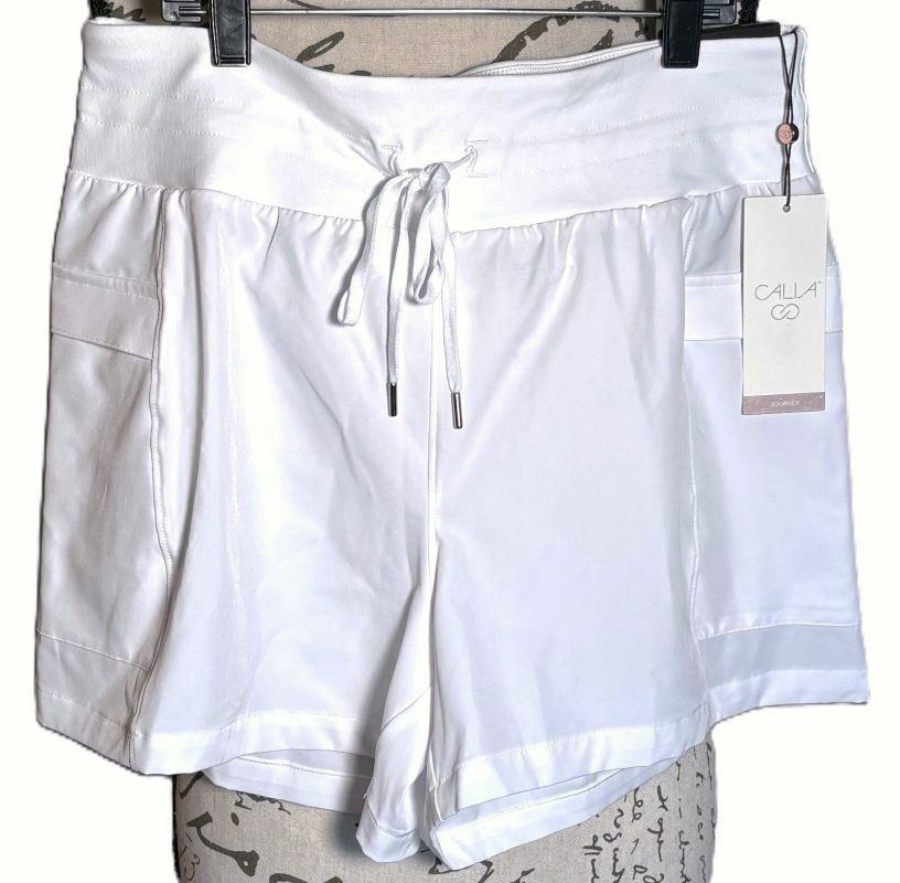 This pair of athleisure shorts is from the Calia Journey Collection. Mid-rise shorts, made with moisture wicking and odor control "TrueLight" fabric. Lightweight, stretchy and very comfy. Stretchable waistband with drawstring. Two pockets on either side which have a top flap sewn so that it helps to keep contents secure.