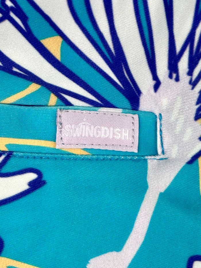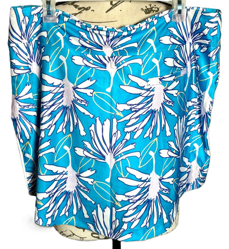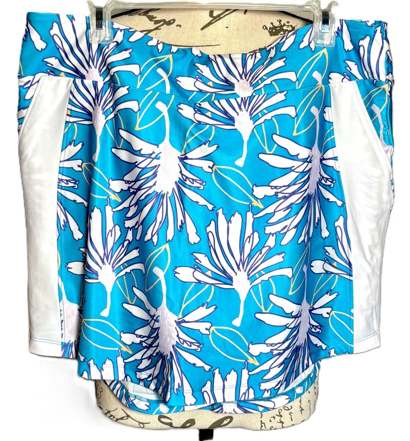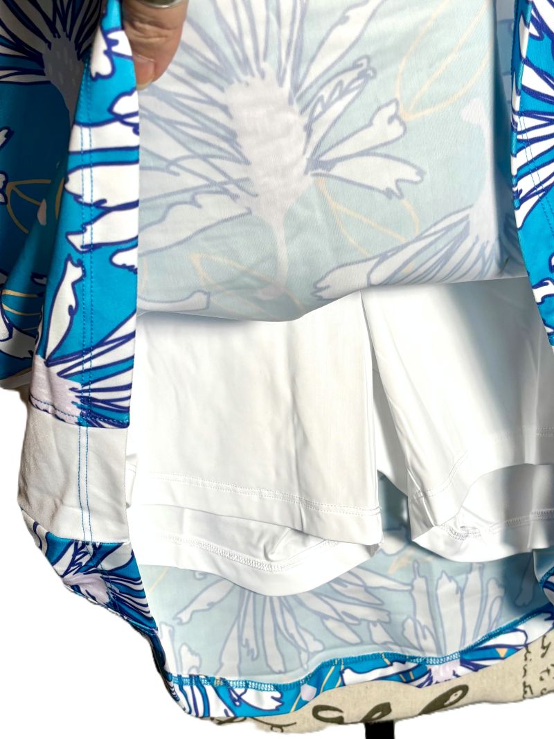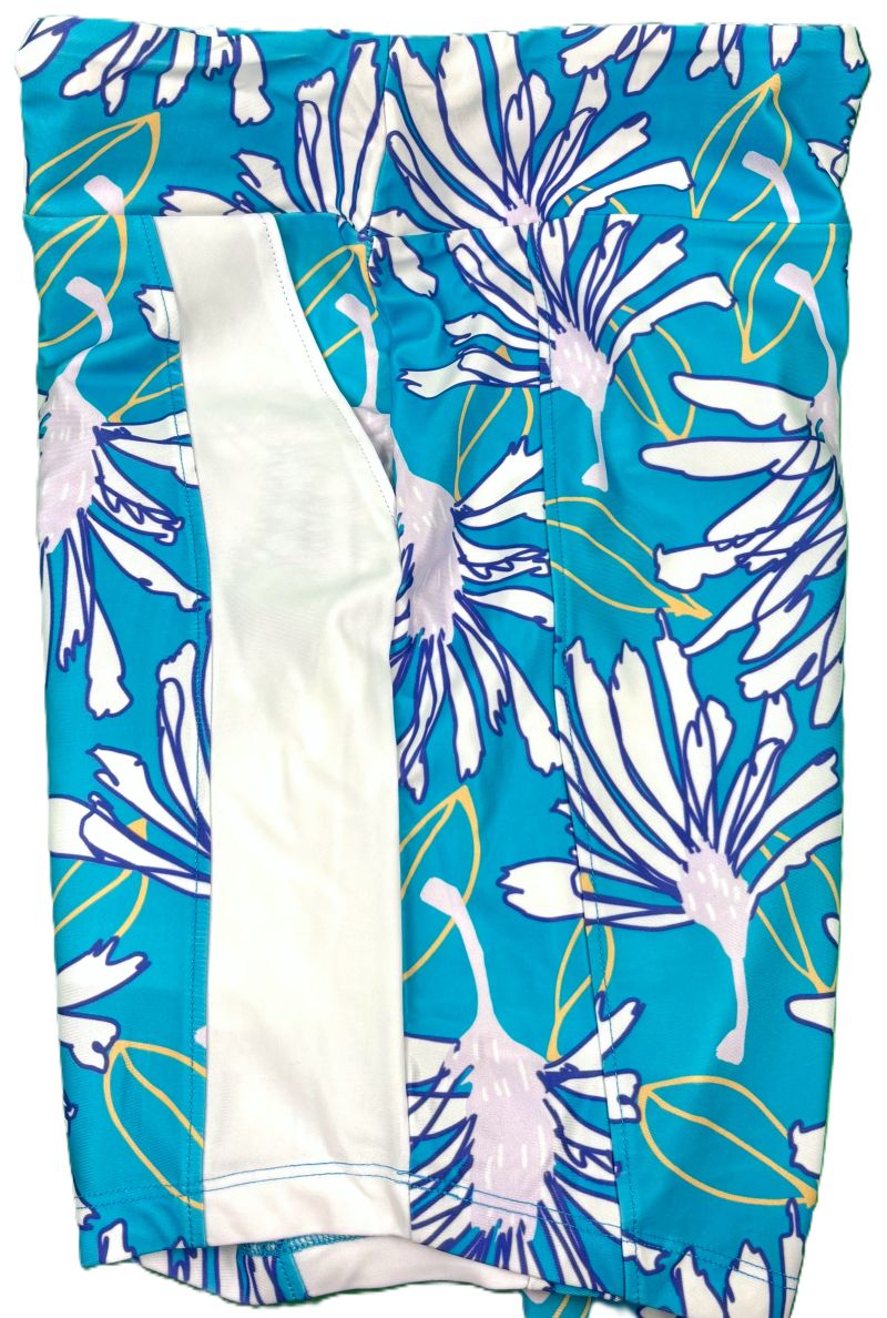 Elevate your golf game with SwingDish's Women's Golf Skort, where style meets functionality. This luxury piece showcases a striking abstract floral pattern in turquoise and white, accented with hints of purple and golden yellow. Designed for the modern golfer, it features practical side pockets and a back pocket to keep essentials within reach, while crisp white side panels create a polished, contemporary silhouette. Perfect for those who refuse to compromise on elegance or performance on the course.