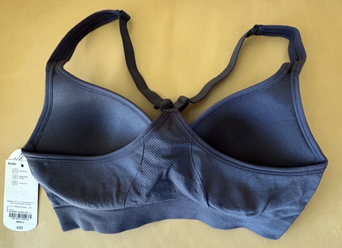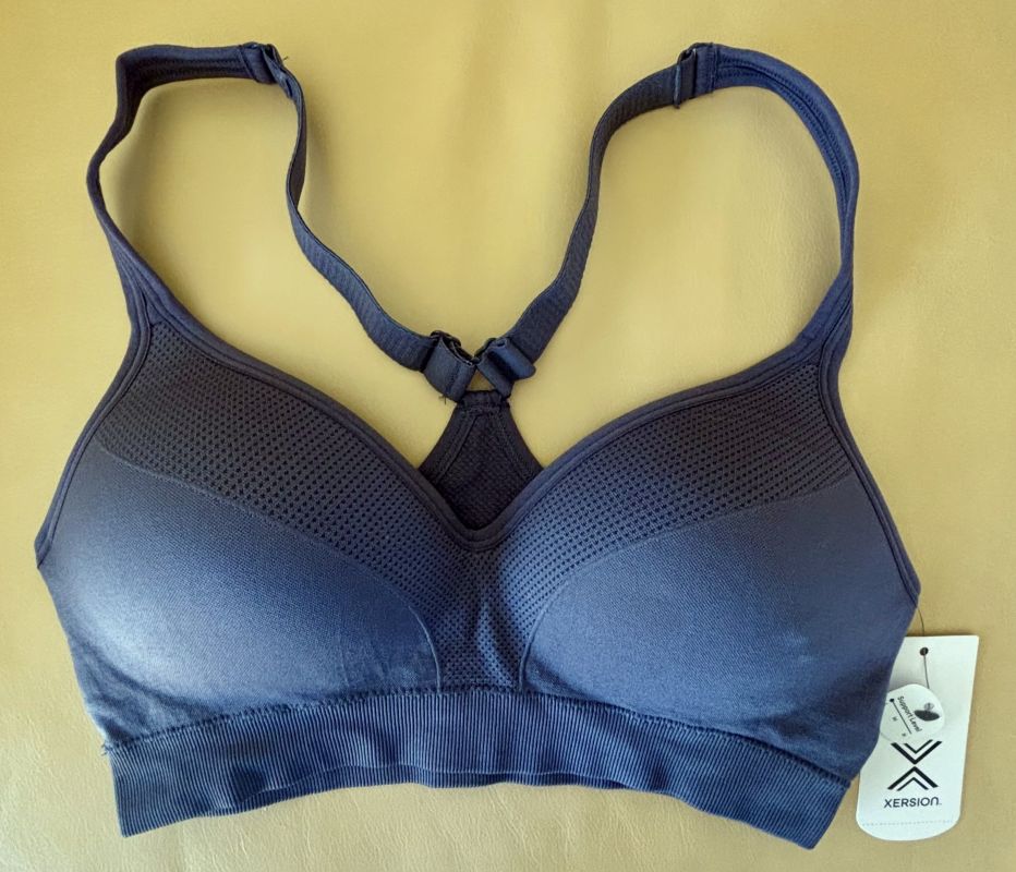 The Xersion Low Support Seamless Deep V-Neck Sports Bra in size small combines comfort and style for light-impact activities. The deep gray color adds a sleek, sporty look, while the quick-dri fabric keeps you cool and dry during movement.