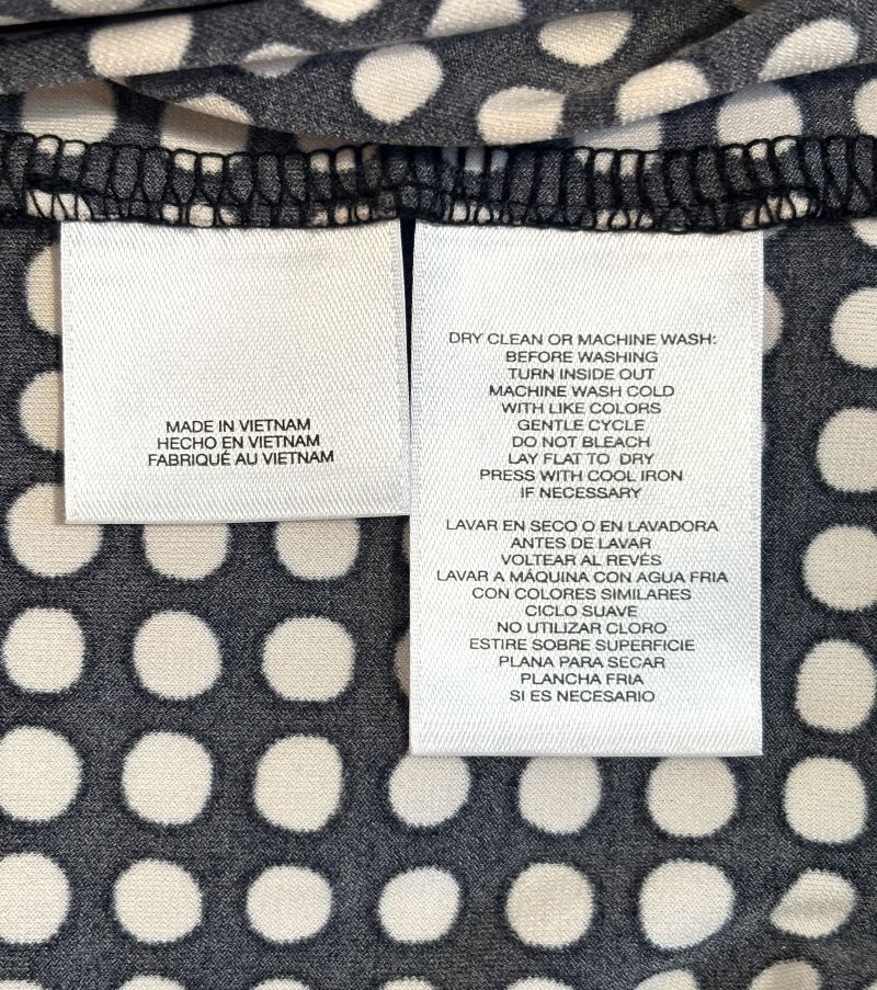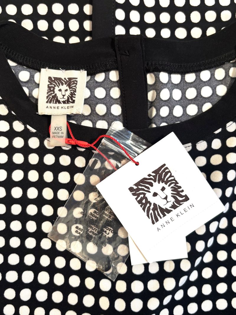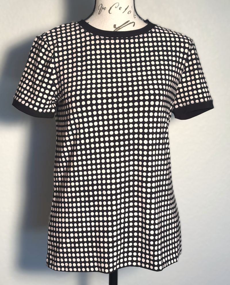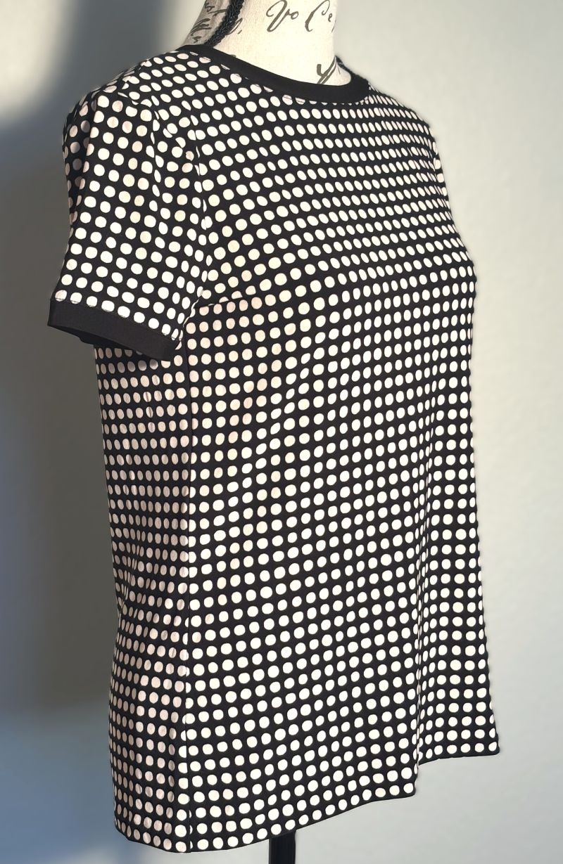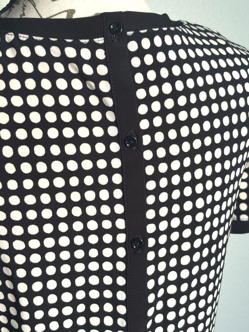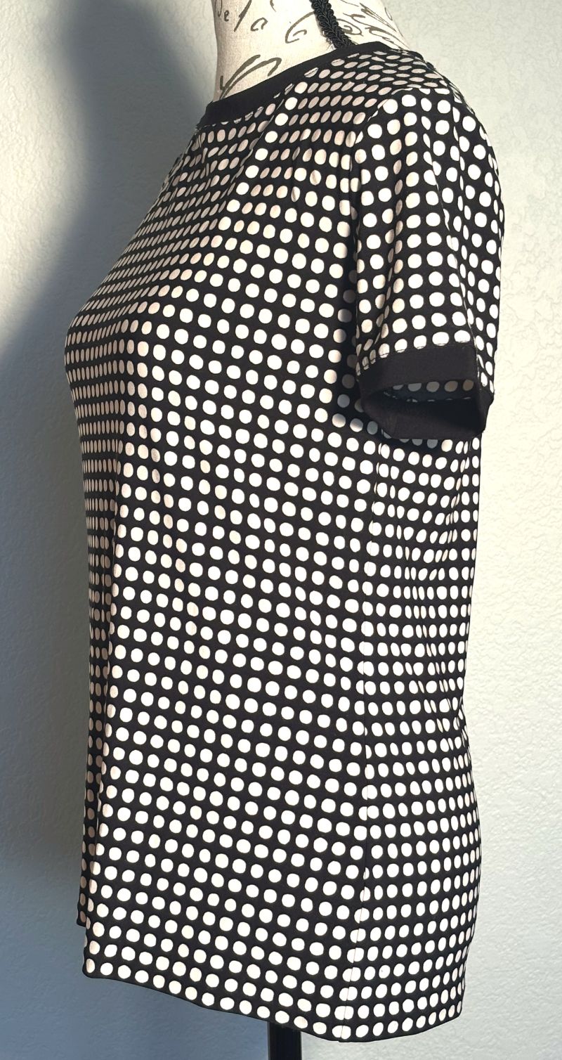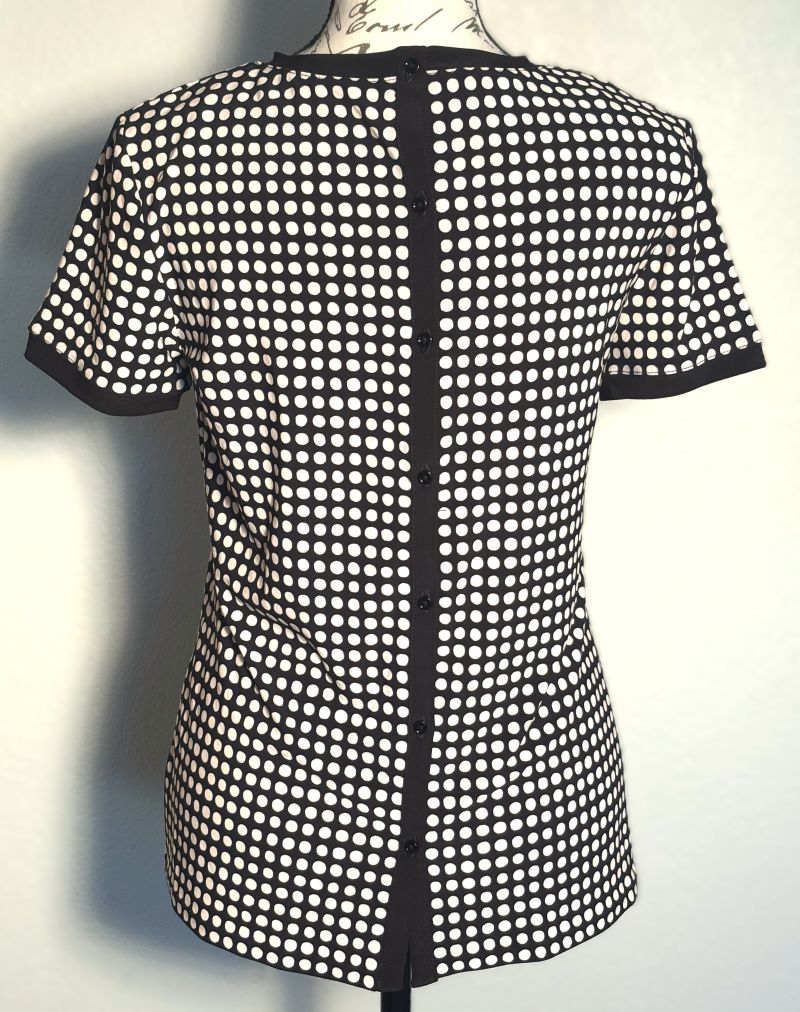 This short sleeve Anne Klein blouse is super cute! Features a dot design in black and off-white. Black contrasting collar and bottoms of sleeves. The back has a stylish button up design, which is also in contrasting black. This versatile blouse can be worn to the office and then paired with jeans for a fun night out.