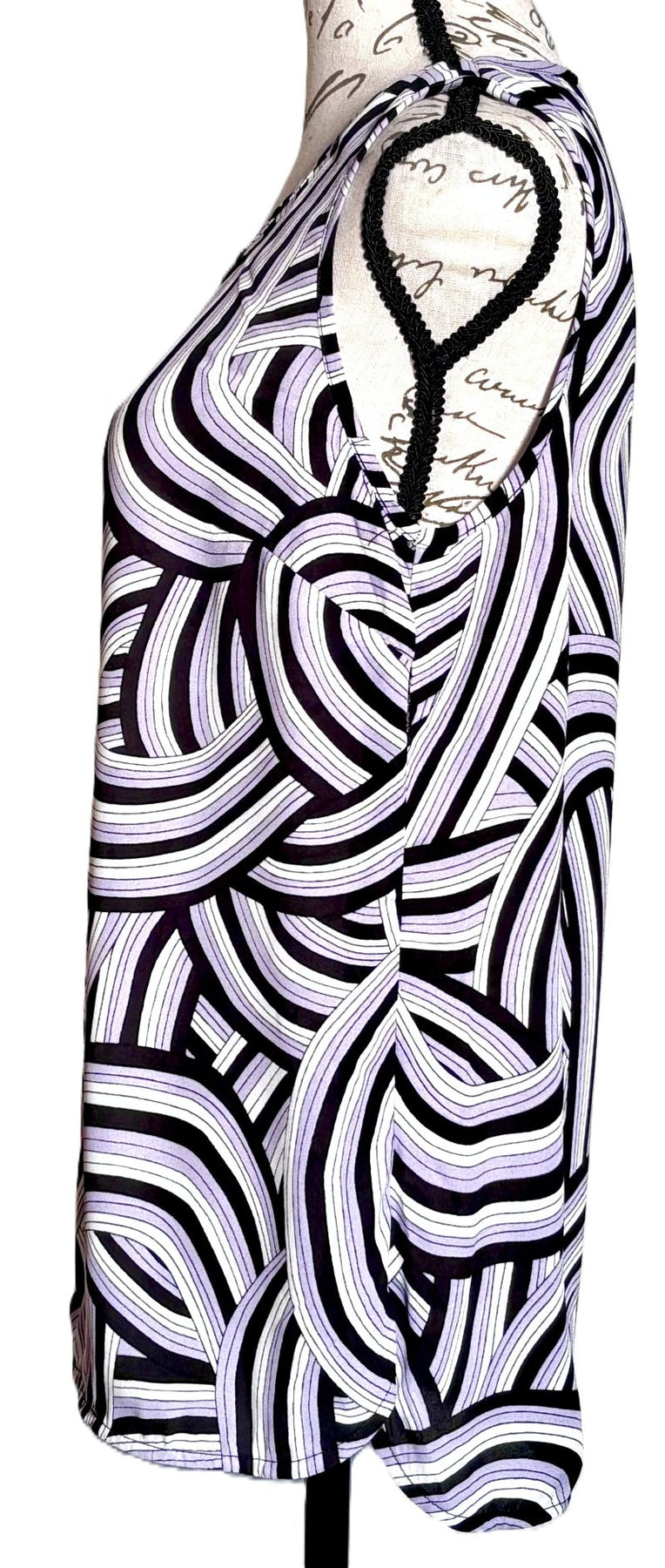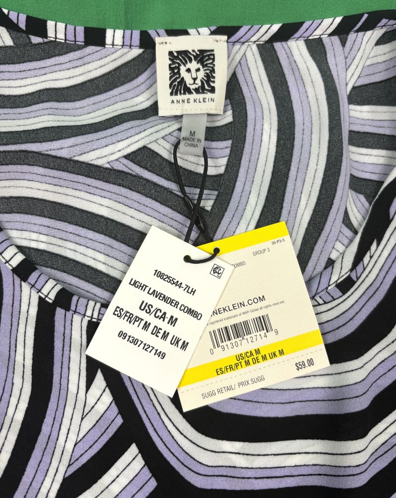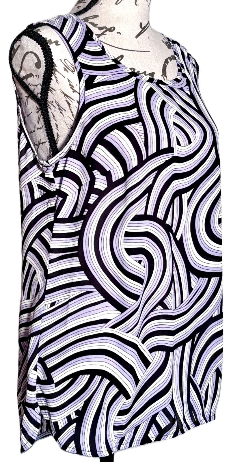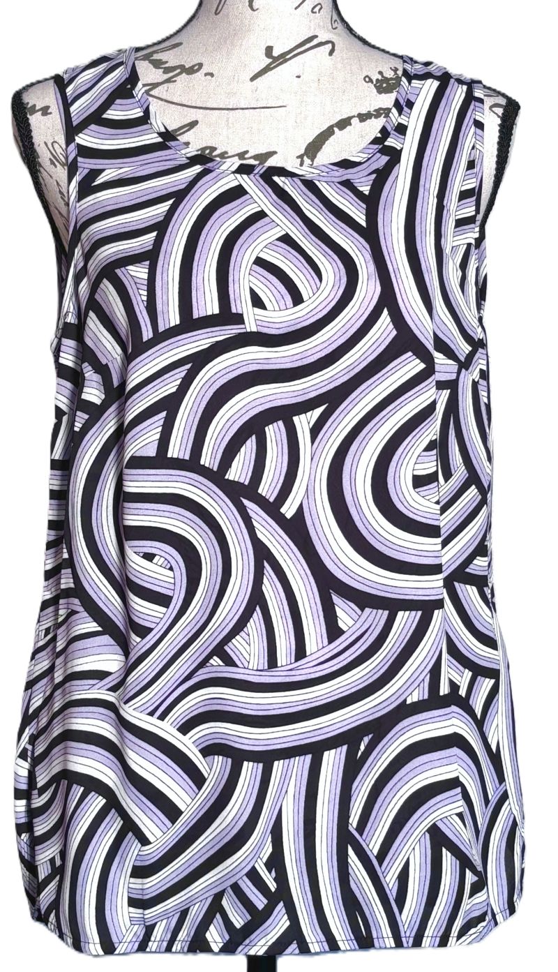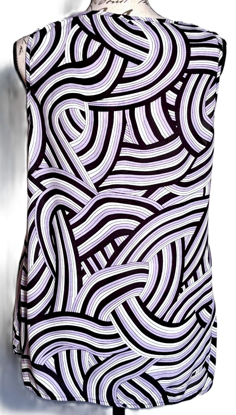 Elevate your wardrobe with this Anne Klein sleeveless blouse, designed for effortless sophistication. The relaxed, flowing silhouette flatters every frame, while the captivating geometric pattern—formed by interlocking lines—adds visual intrigue. Available in versatile lavender, crisp white, and classic black, this round-neck piece transitions seamlessly from office to weekend, offering the perfect balance of comfort and polished style.