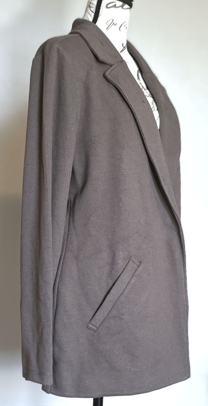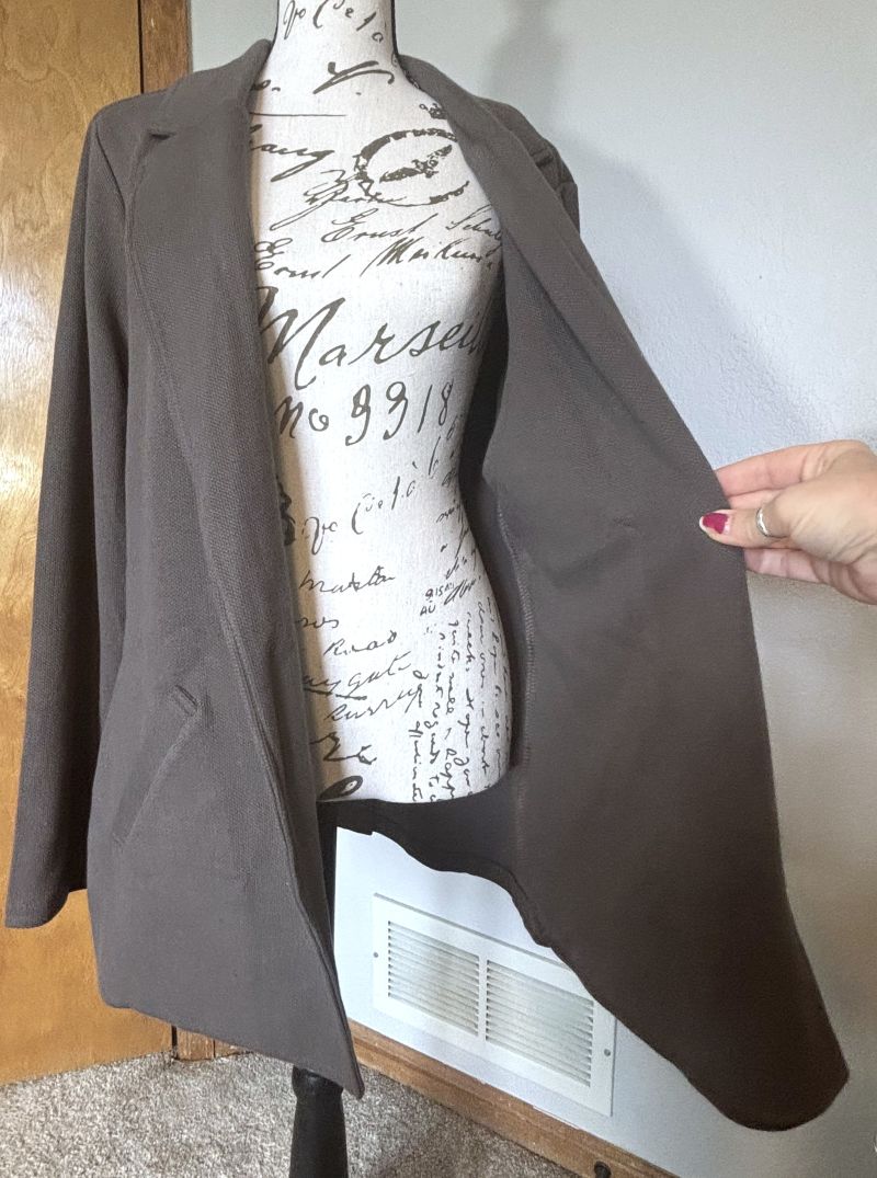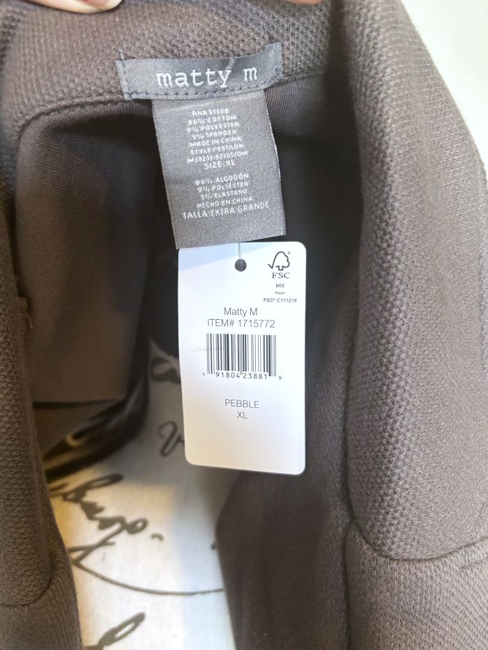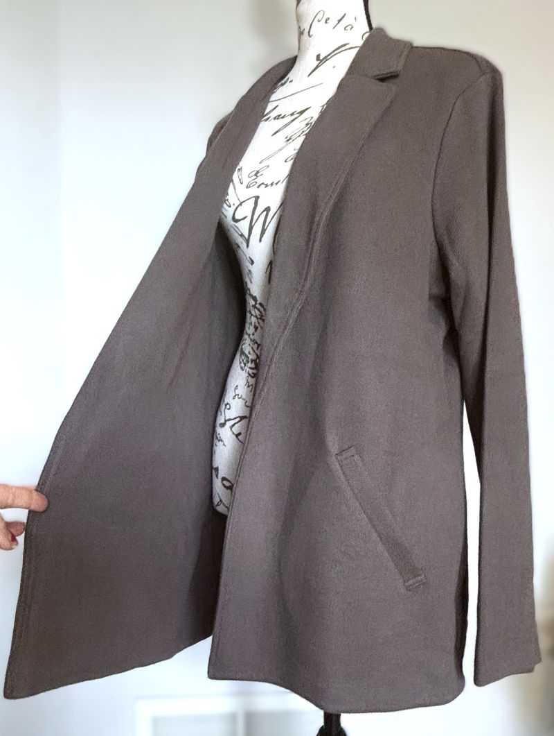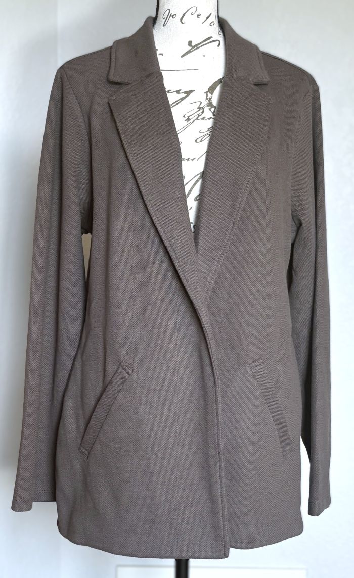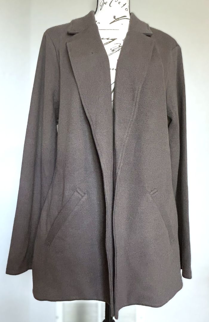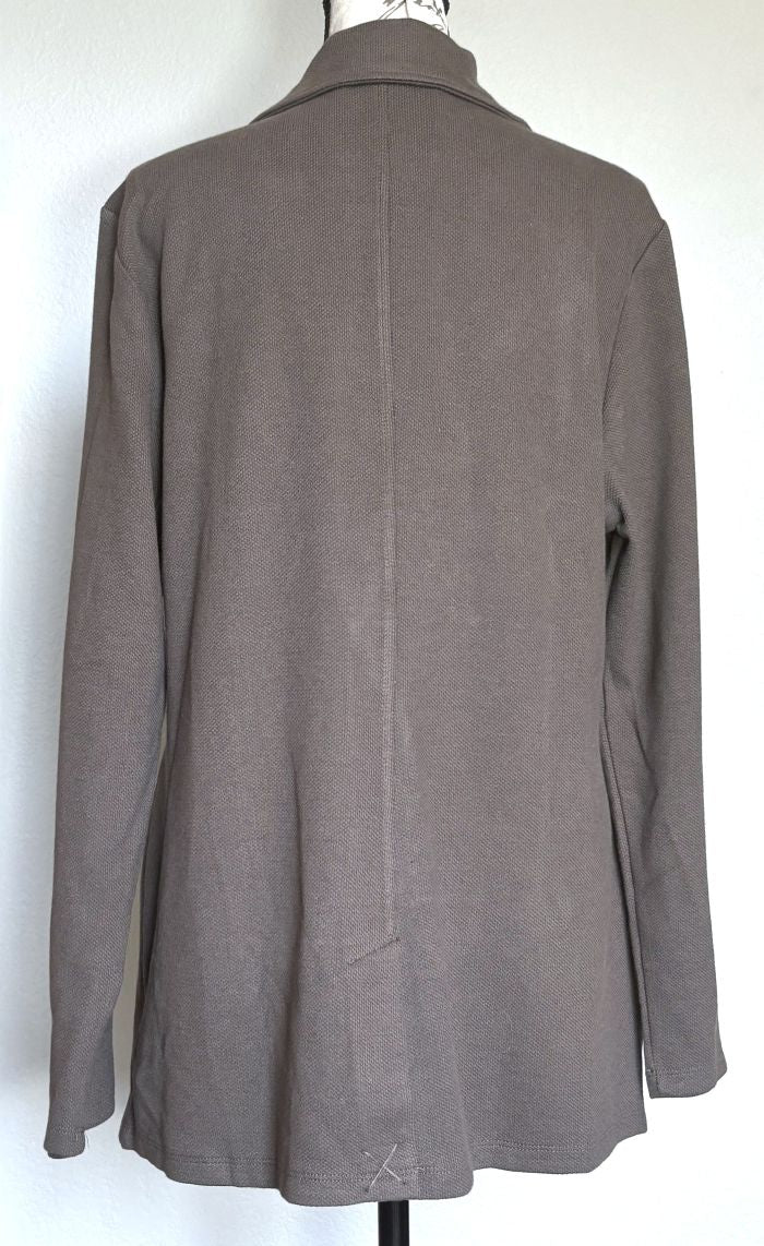 This is a versatile and stylish blazer/jacket from Matty M. Soft fabric is comprised of 86% Cotton/9% Polyester/5% Spandex. The color is called 'Pebble' - a grayish taupe that will go with many things. Two side pockets (stitched closed) and a slit on the bottom of the back, which is stitched up, but measures approx. 6"L.